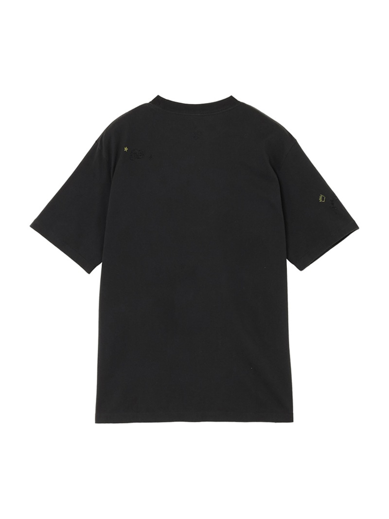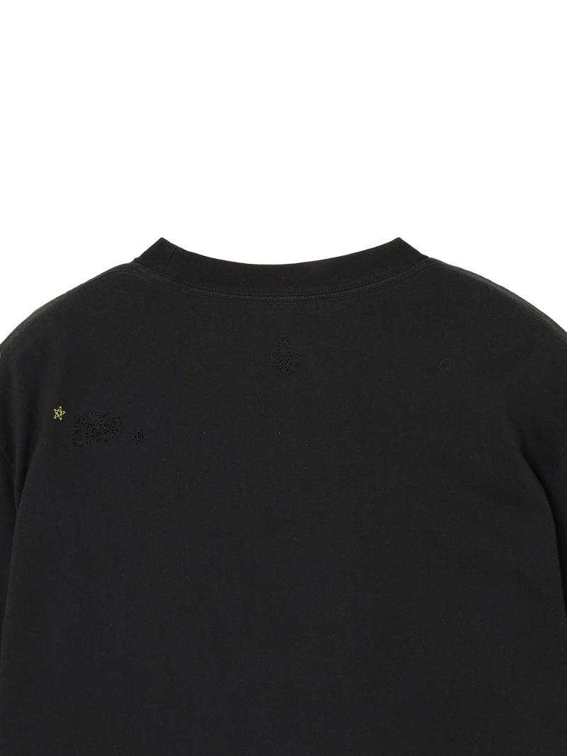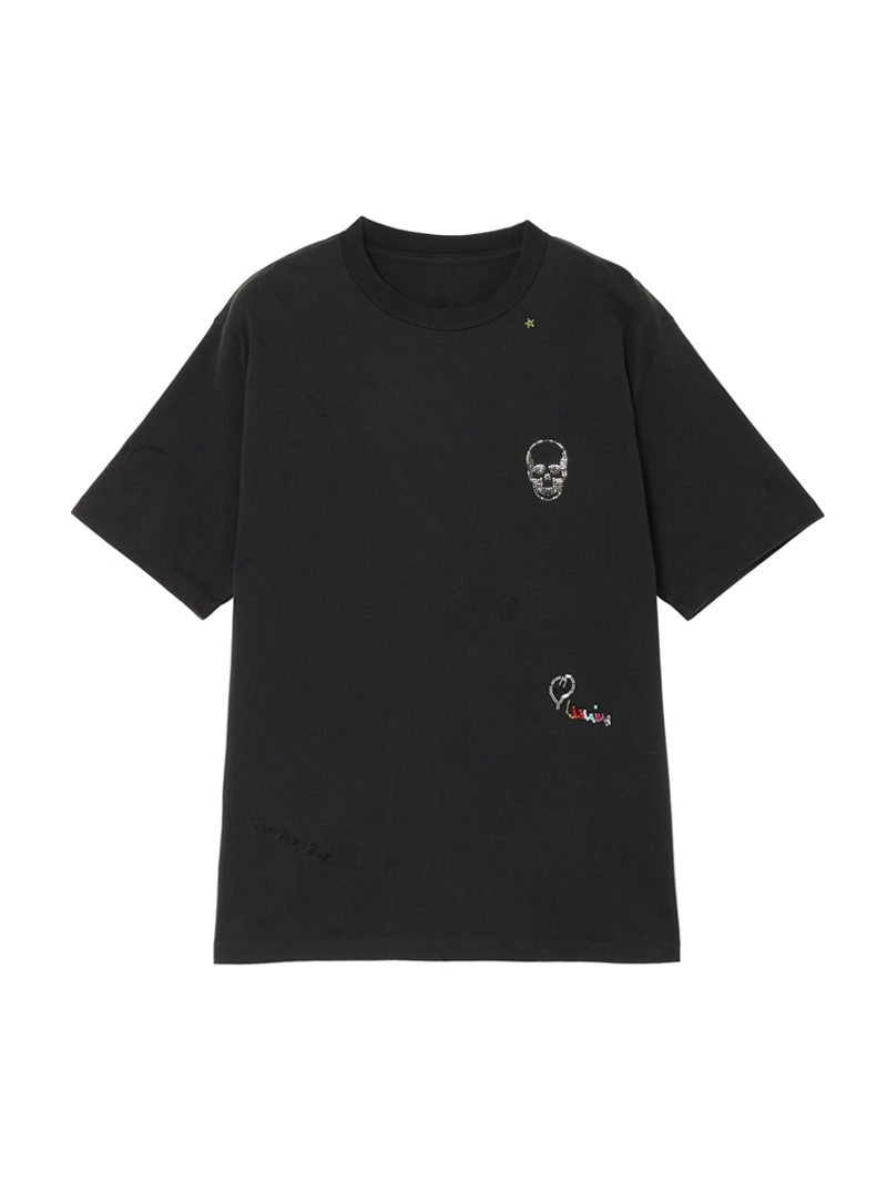 左胸にクリスタル・スカル、その下部分にはルシアン・ぺラフィネ氏のサインを、その他にもフルールドリス、king of cashmereなどハンド刺繍で表現。色を抜いた加工を施しヴィンテージ調に仕上げている。