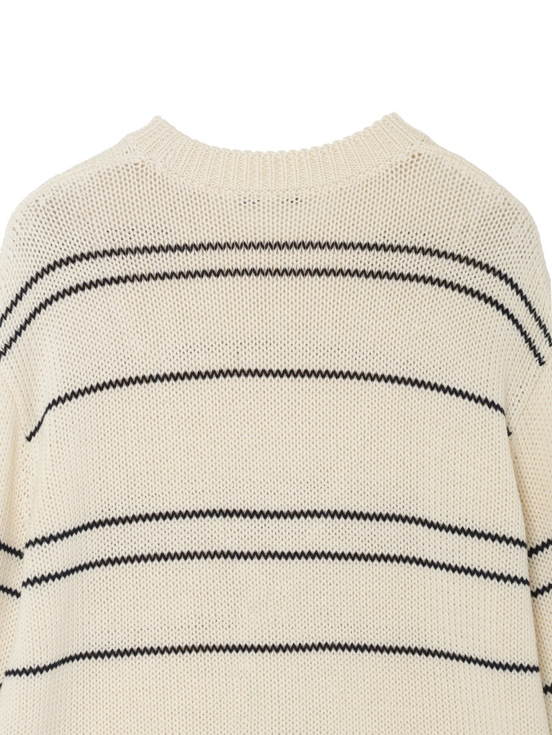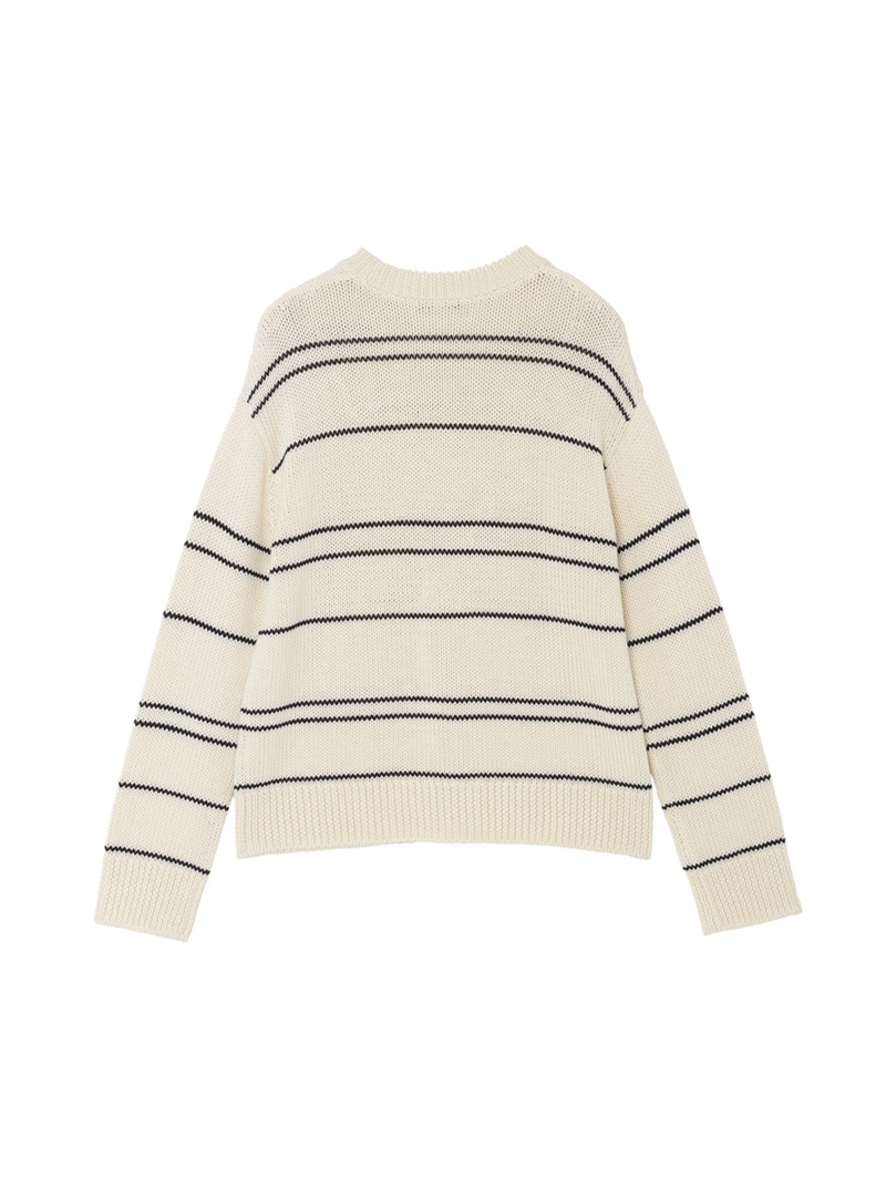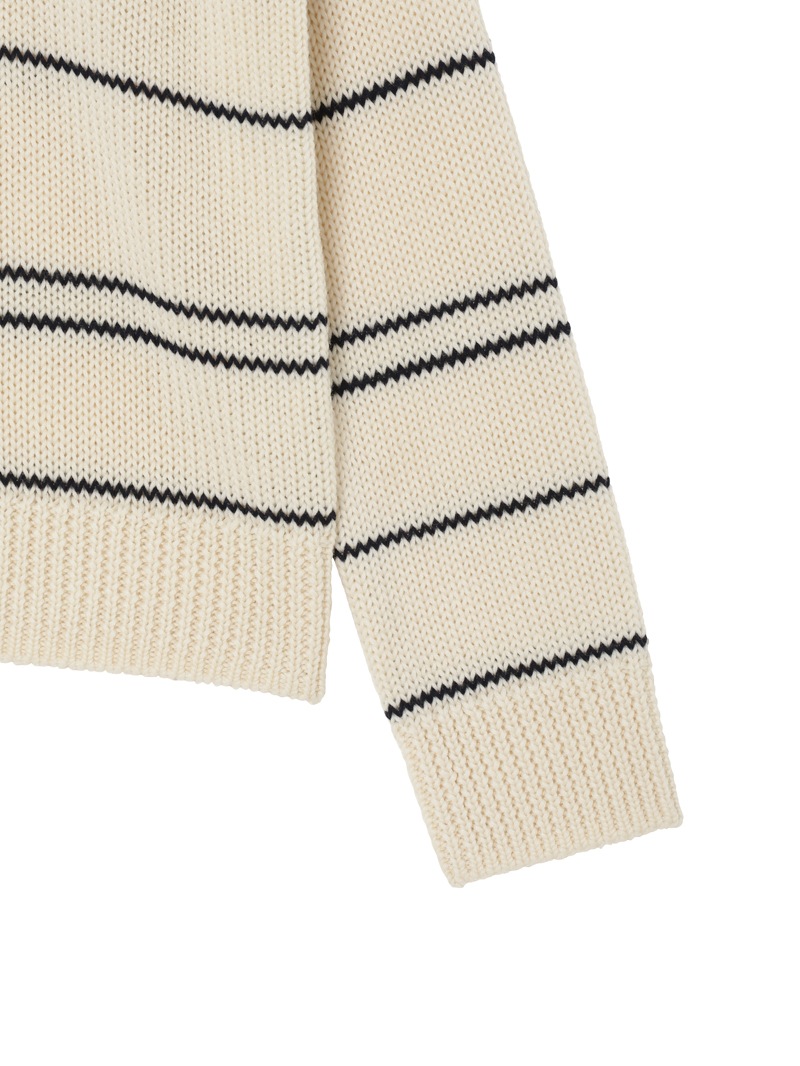 上質なウールとリサイクルポリエステルを使用した、柔らかくも軽やかな着心地のニット。ストライプのピッチに変化をつけたデザインが、シンプルながらも存在感のある一枚。ニュアンスのあるアイボリー×ネイビーの落ち着いたカラー。デニムにもスラックスにもマッチする、万能な一枚です。