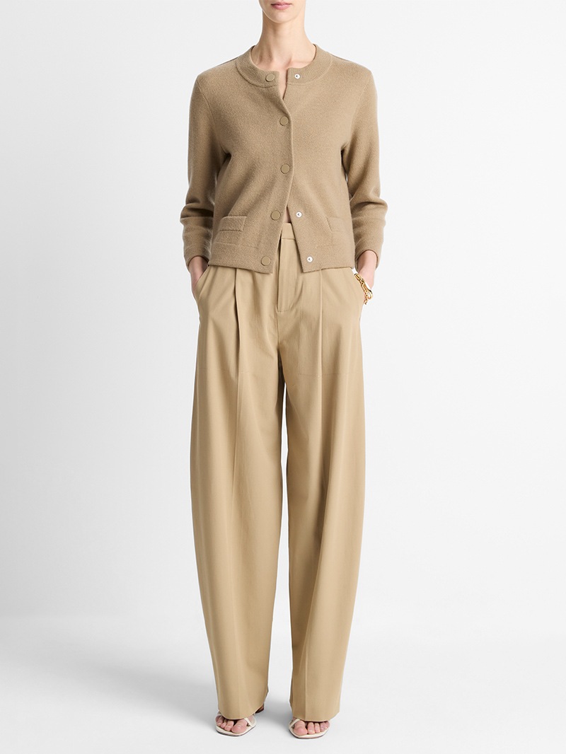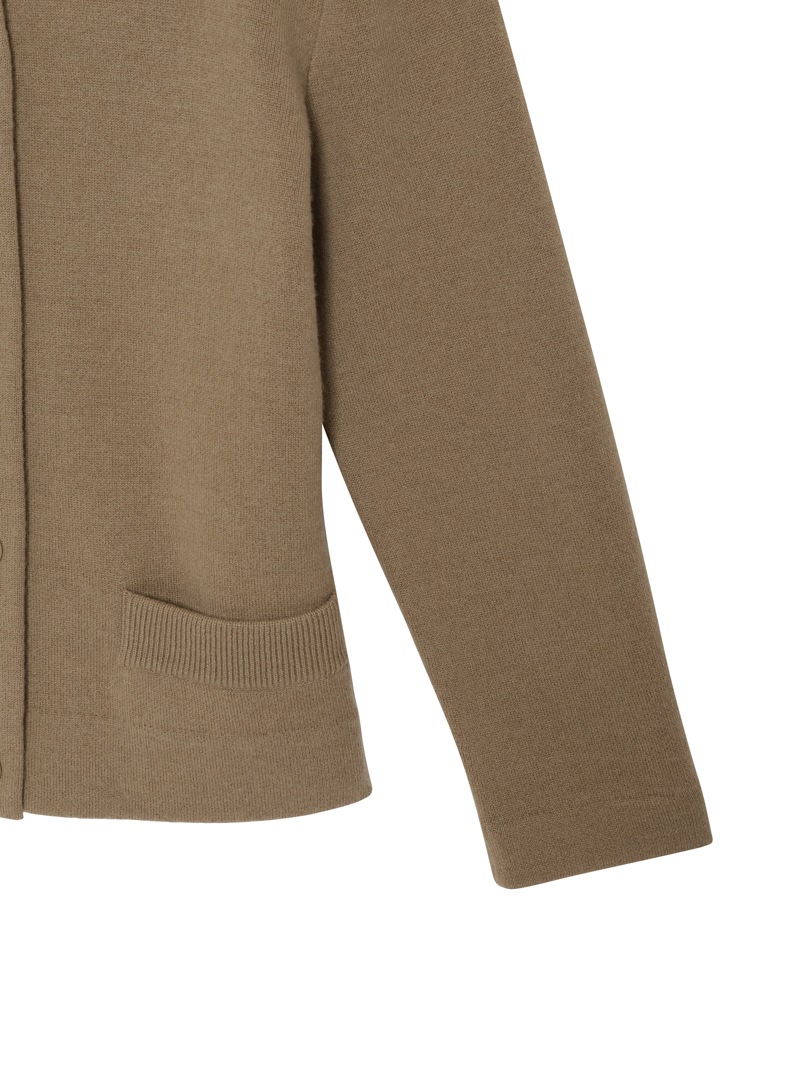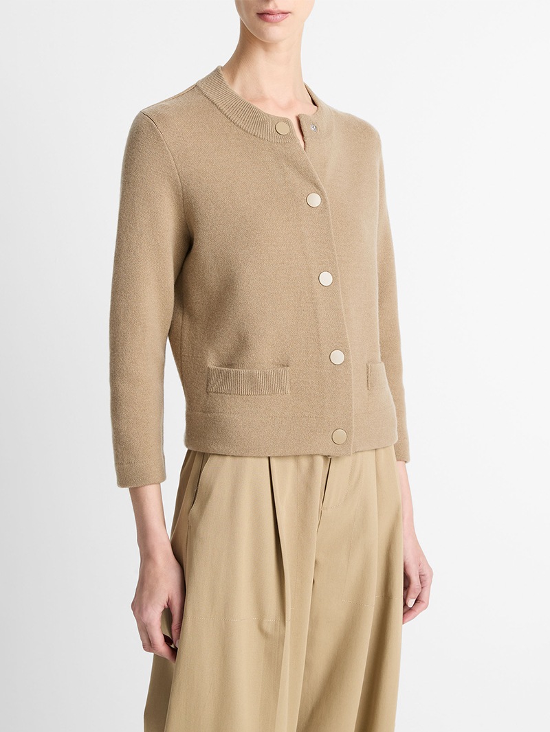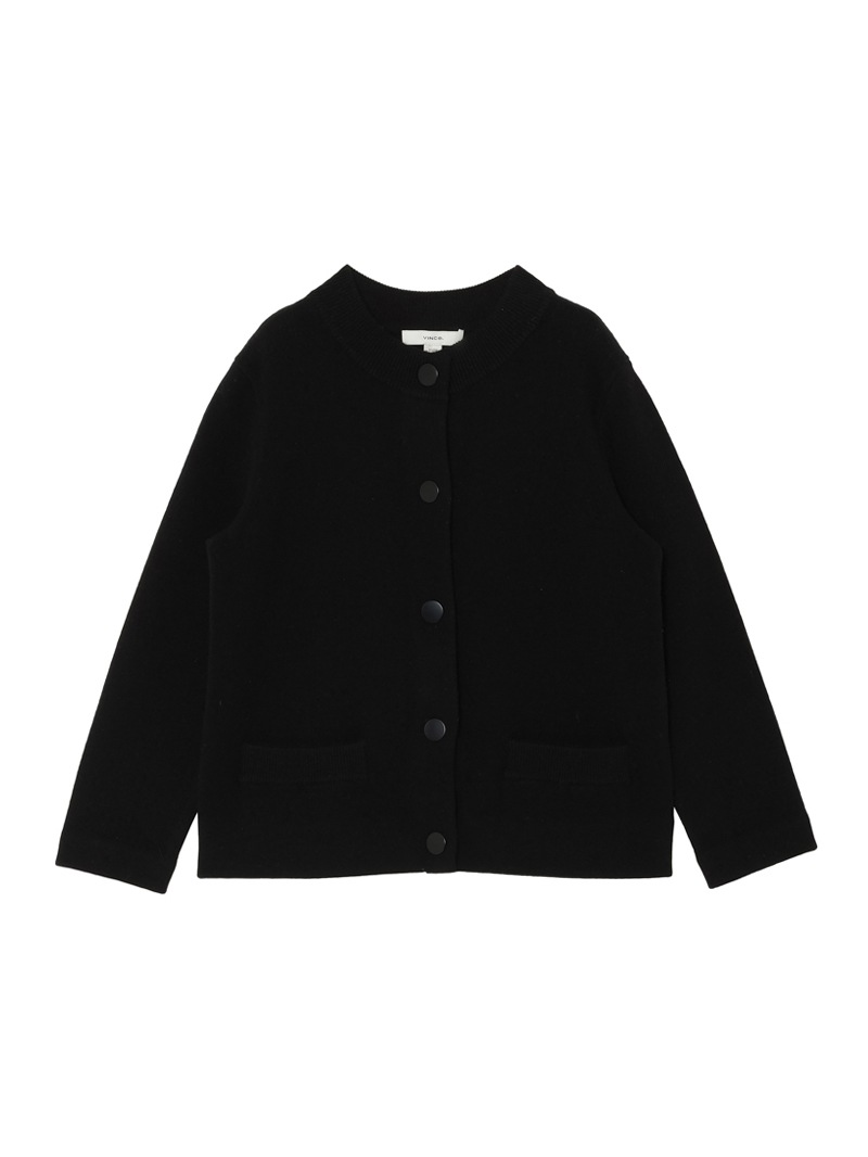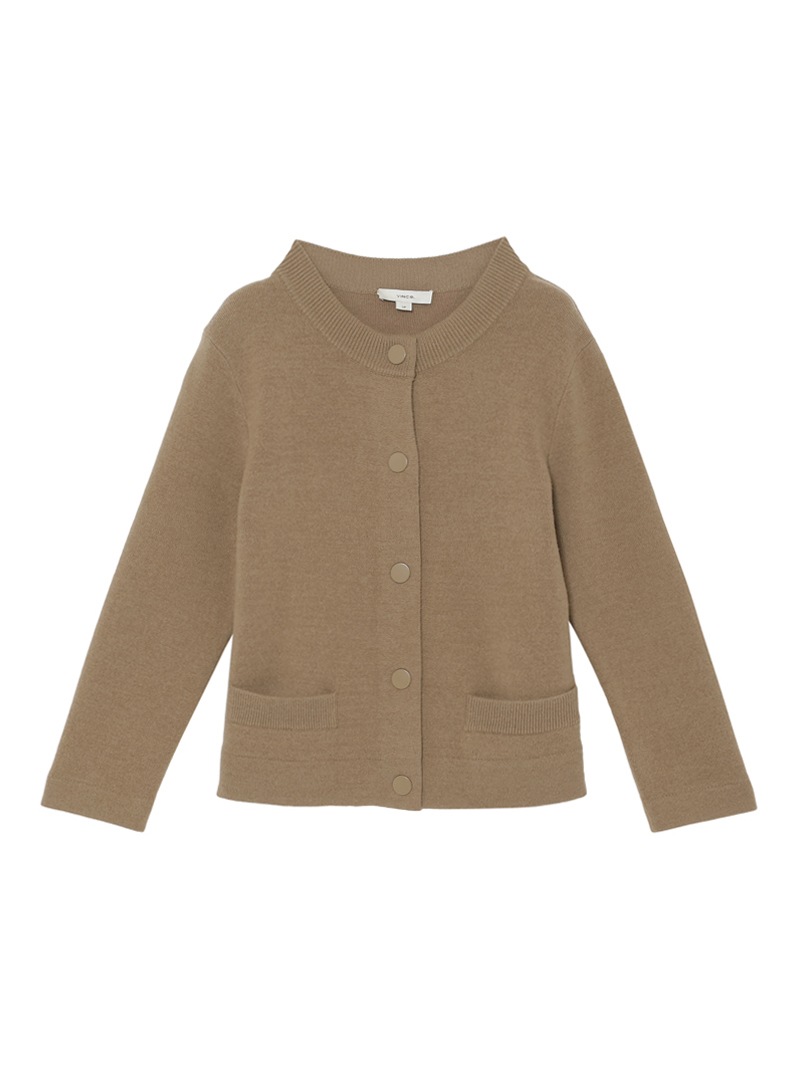 上質なウールにカシミヤをブレンドした、肌ざわりの良いショート丈カーディガン。コンパクトなシルエットにスナップボタンを効かせた、シンプルながらもエッジのある一枚です。ミニマルな装いにも、レイヤードにもフィット。さらっと羽織るだけで、洗練されたムードに仕上がります。