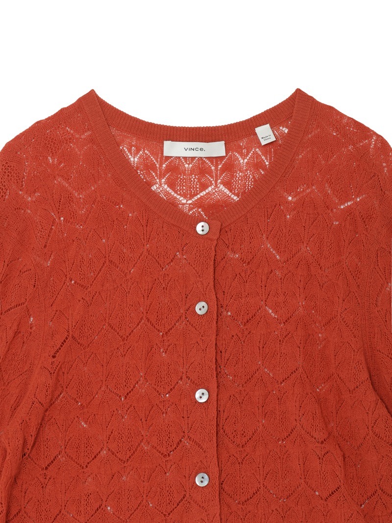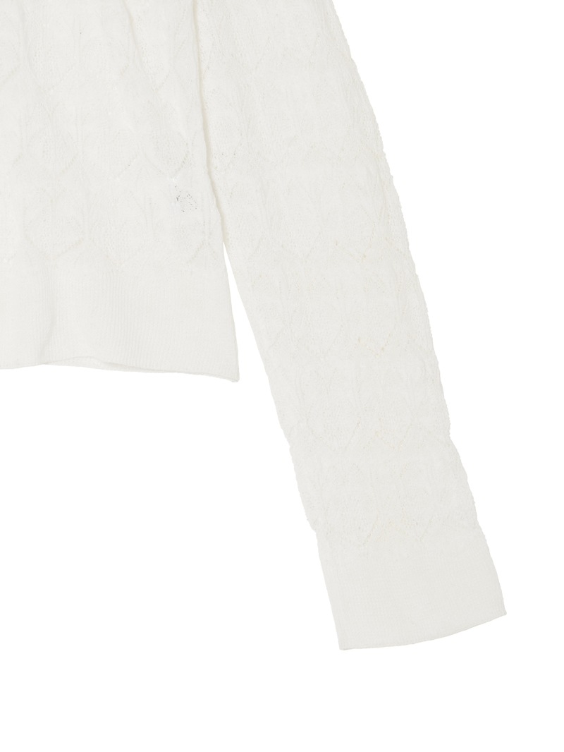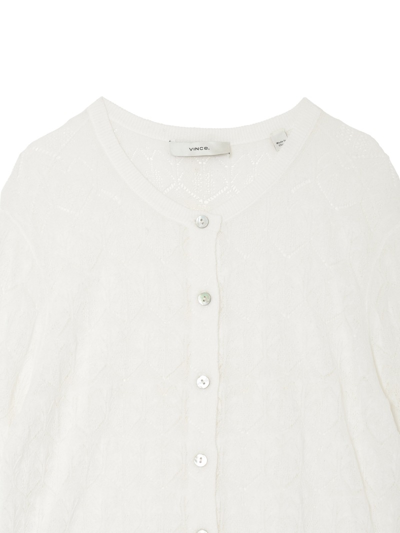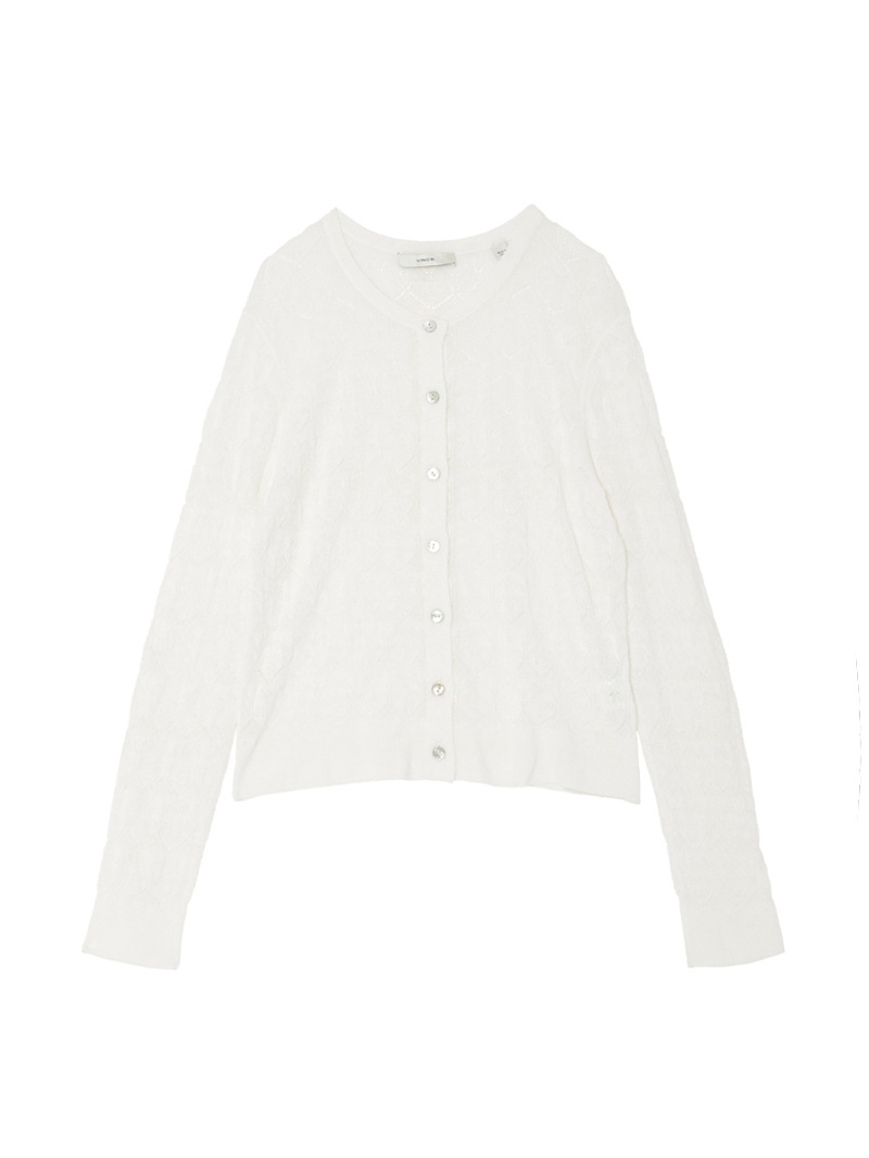 透け感のあるレースステッチのコットンカーディガン。軽やかな着心地で、シンプルなスタイリングに抜け感をプラスしてくれます。デイリーにもフォーマルシーンにも活躍する一枚です。
