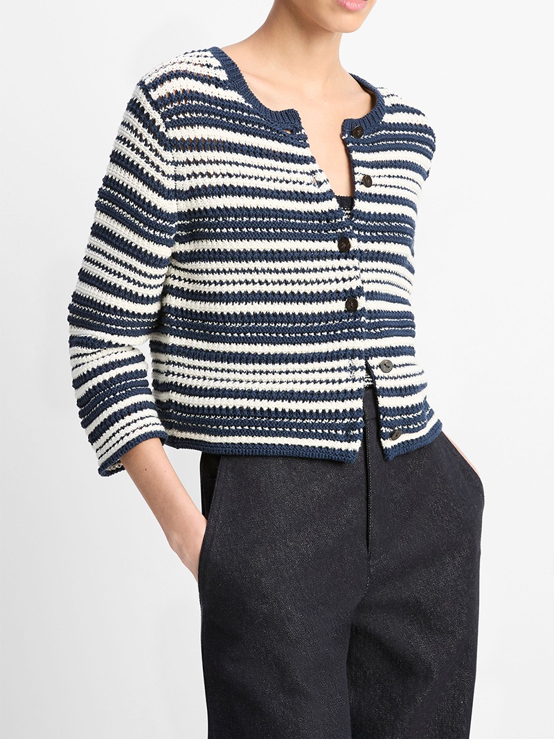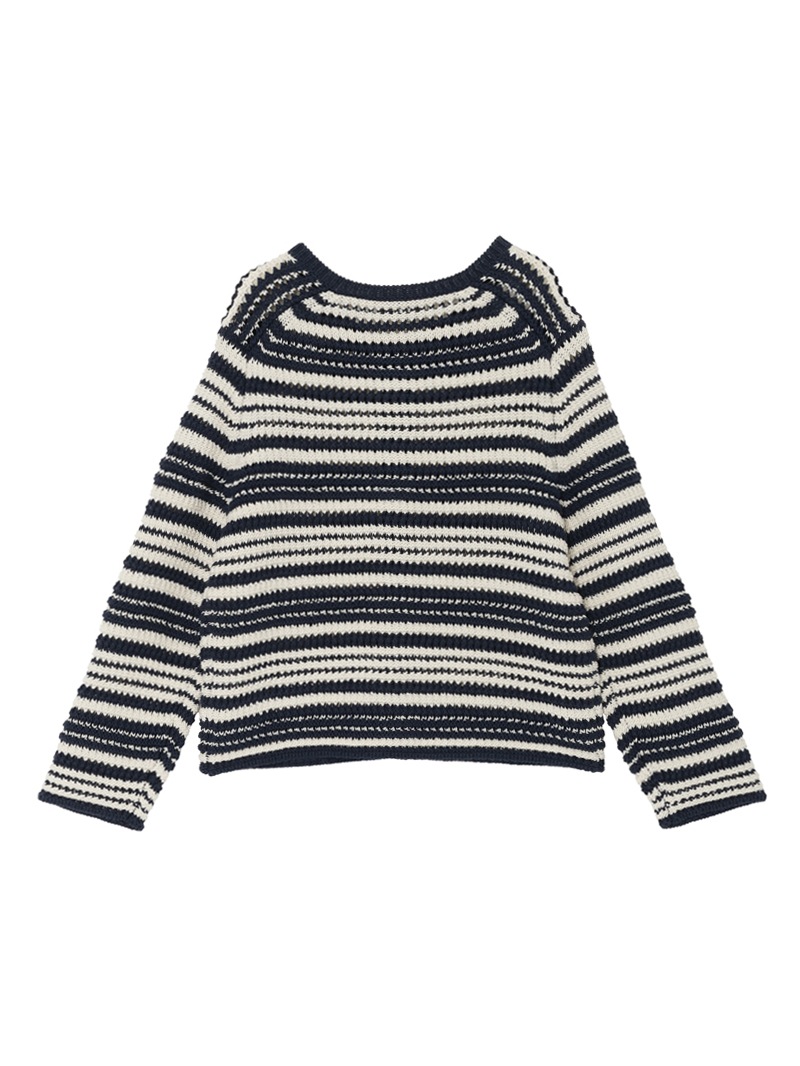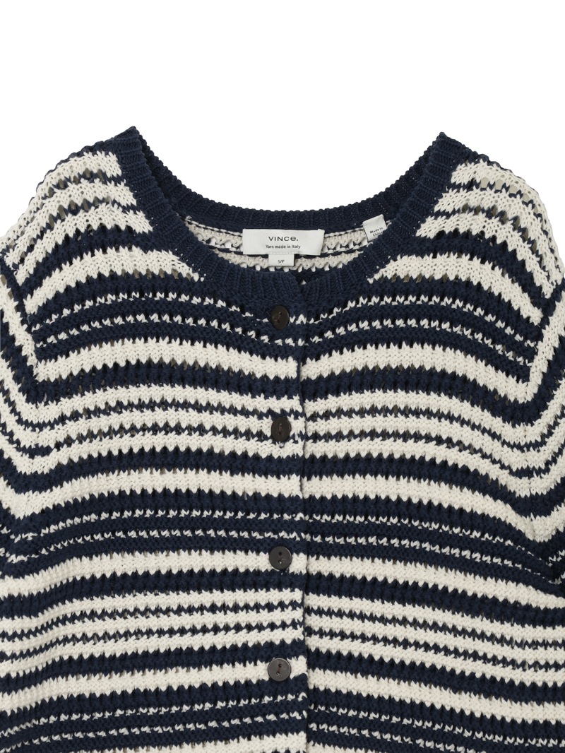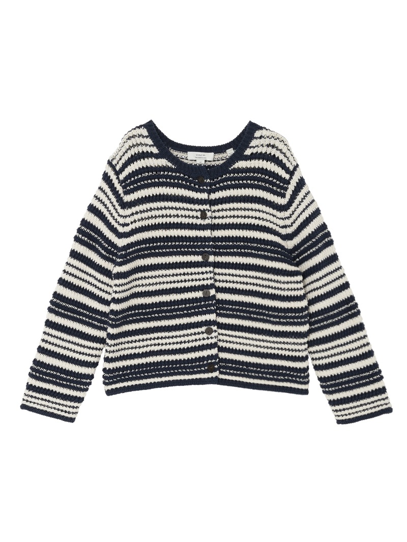 バイオ加工を施したコットン素材の表情豊かなストライプカーディガン。ネイビー×オフホワイトのコントラストカラーが存在感のある一枚。コンパクトな丈感でワイドなボトムと合わせてモードなスタイリングに。