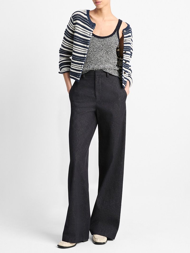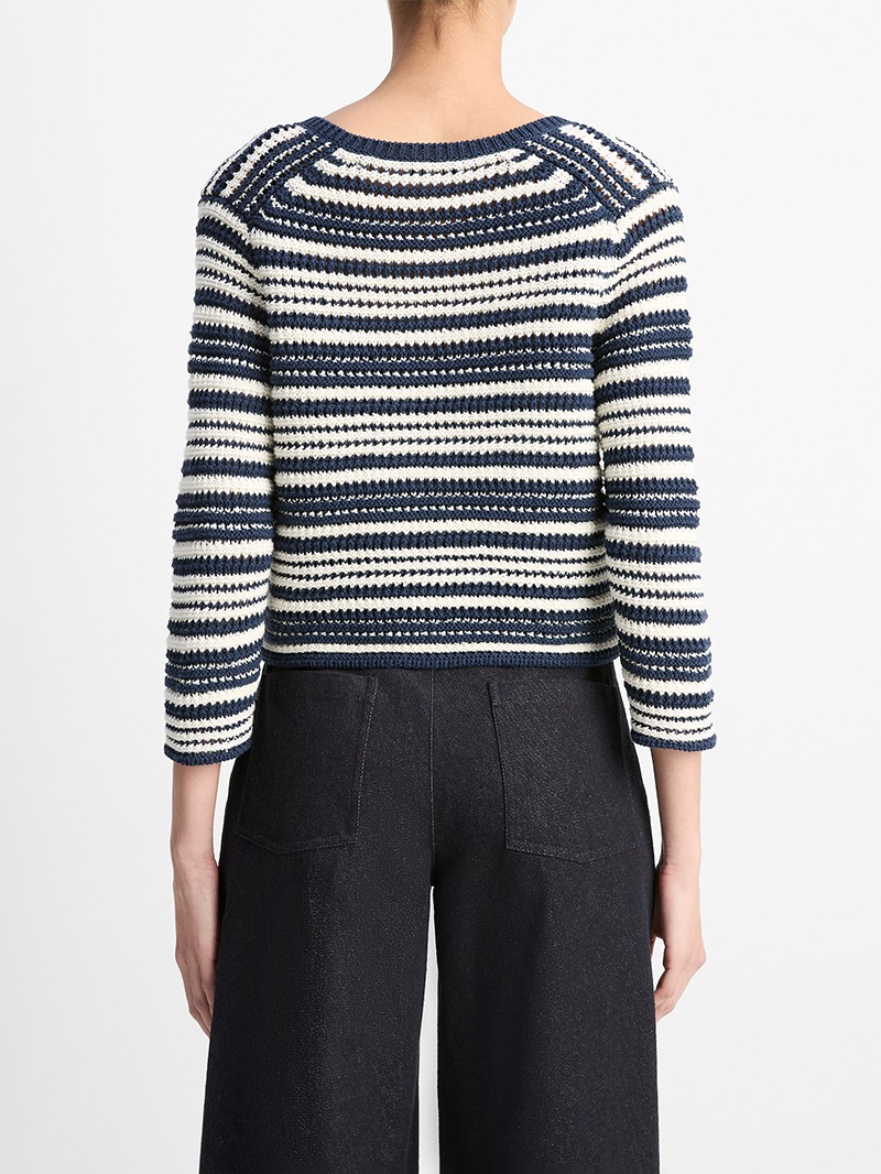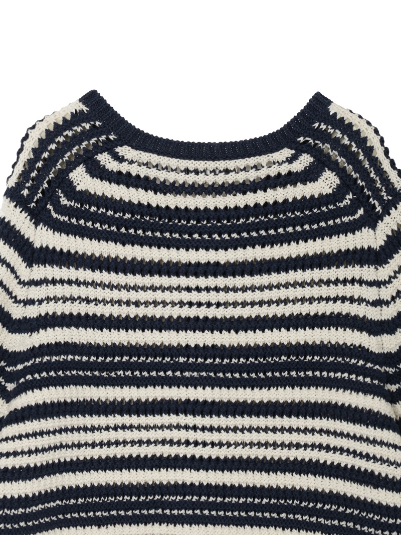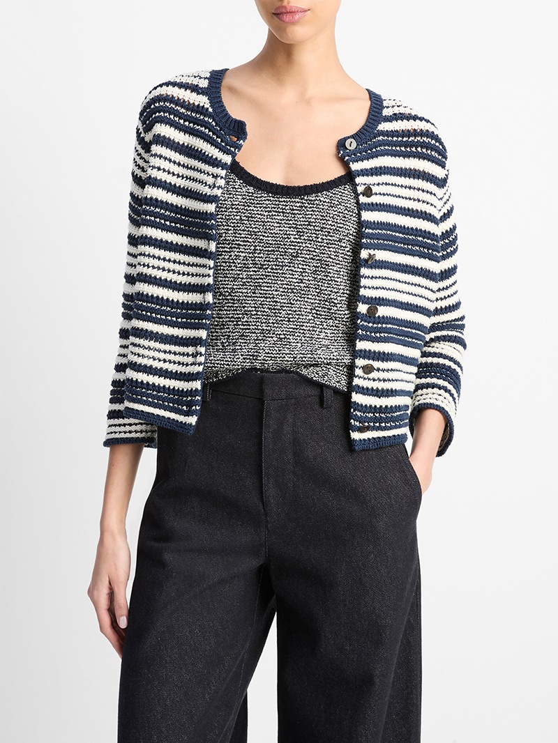 バイオ加工を施したコットン素材の表情豊かなストライプカーディガン。ネイビー×オフホワイトのコントラストカラーが存在感のある一枚。コンパクトな丈感でワイドなボトムと合わせてモードなスタイリングに。