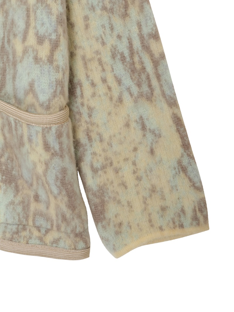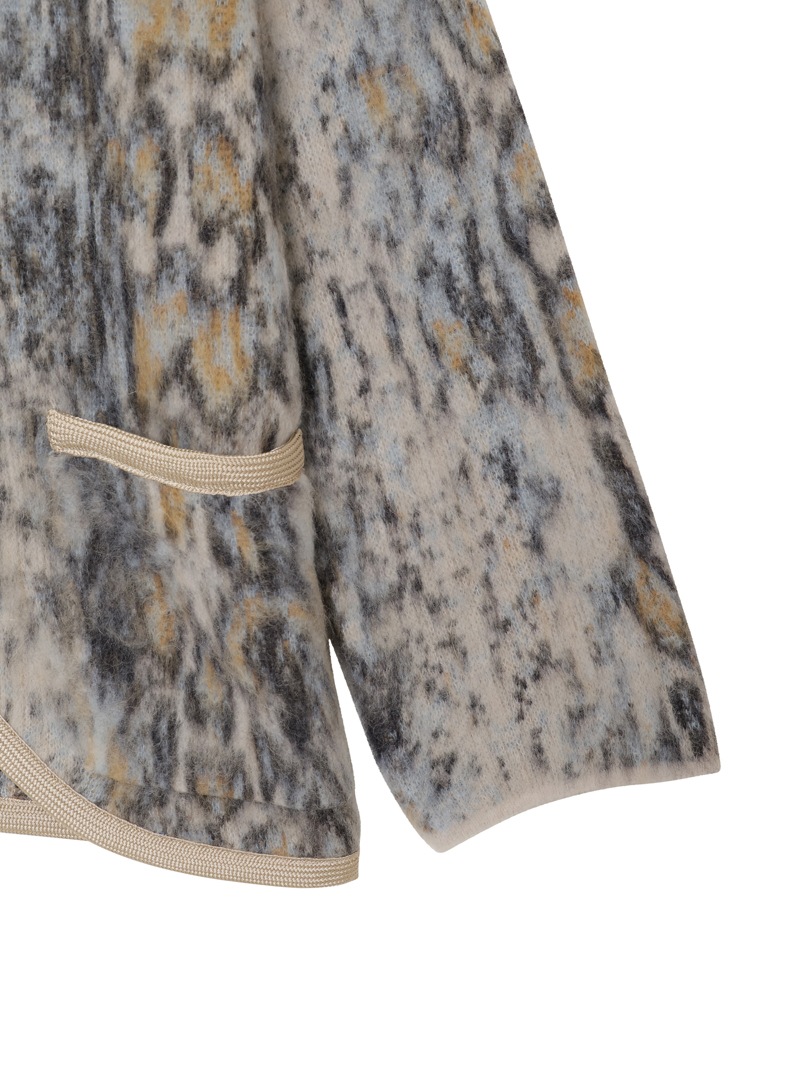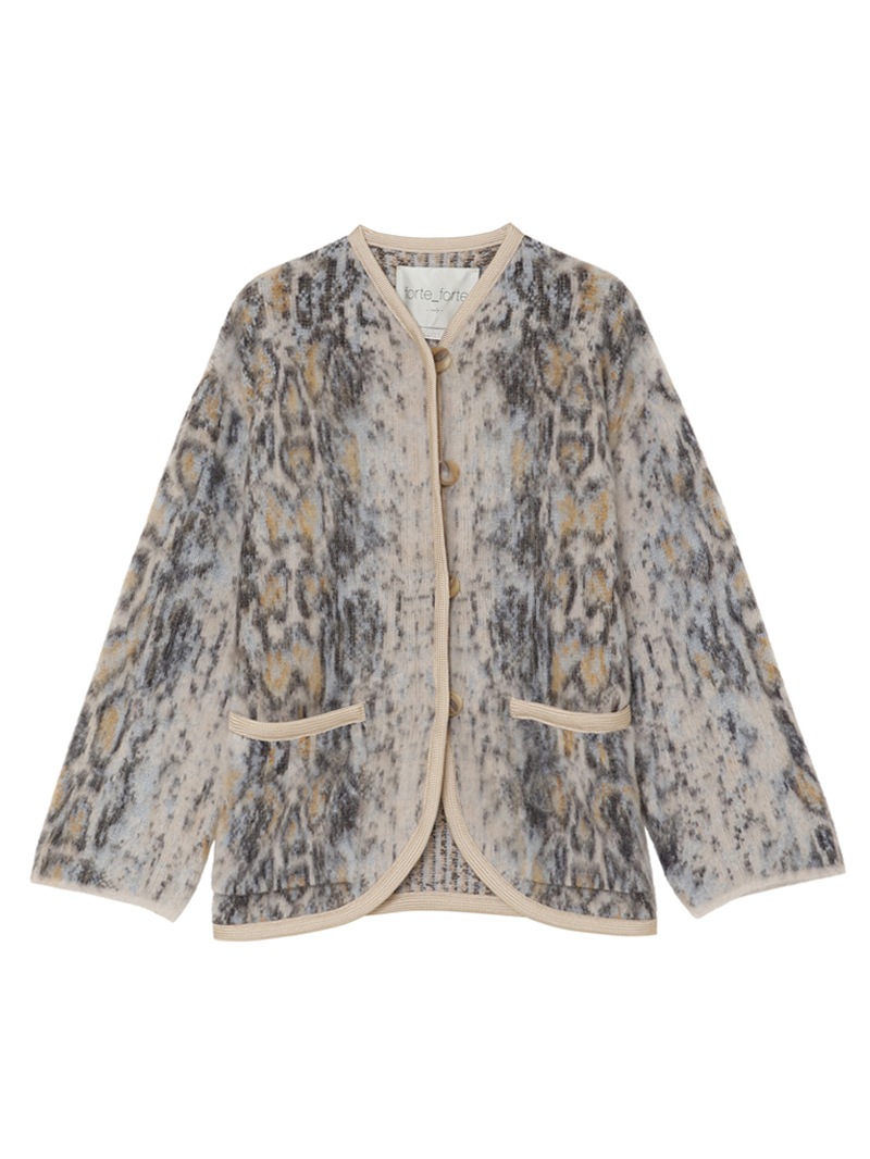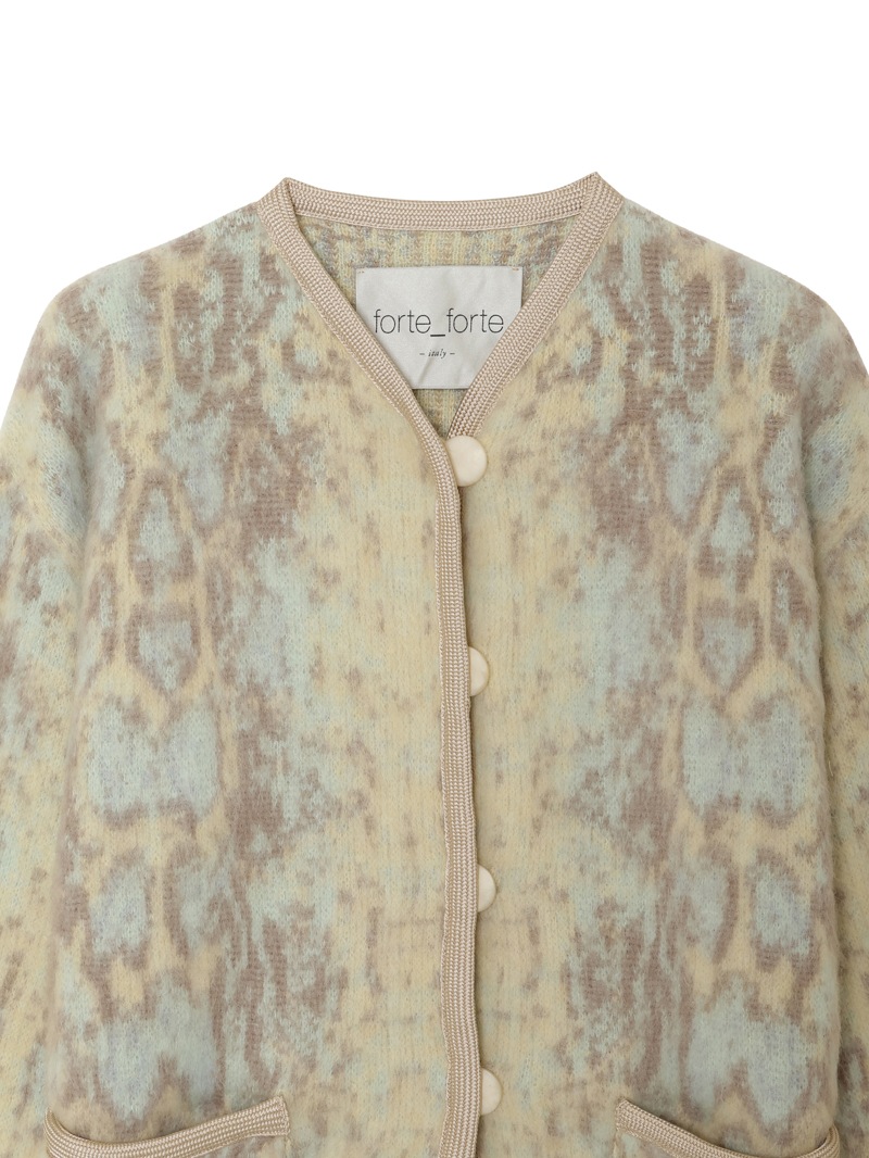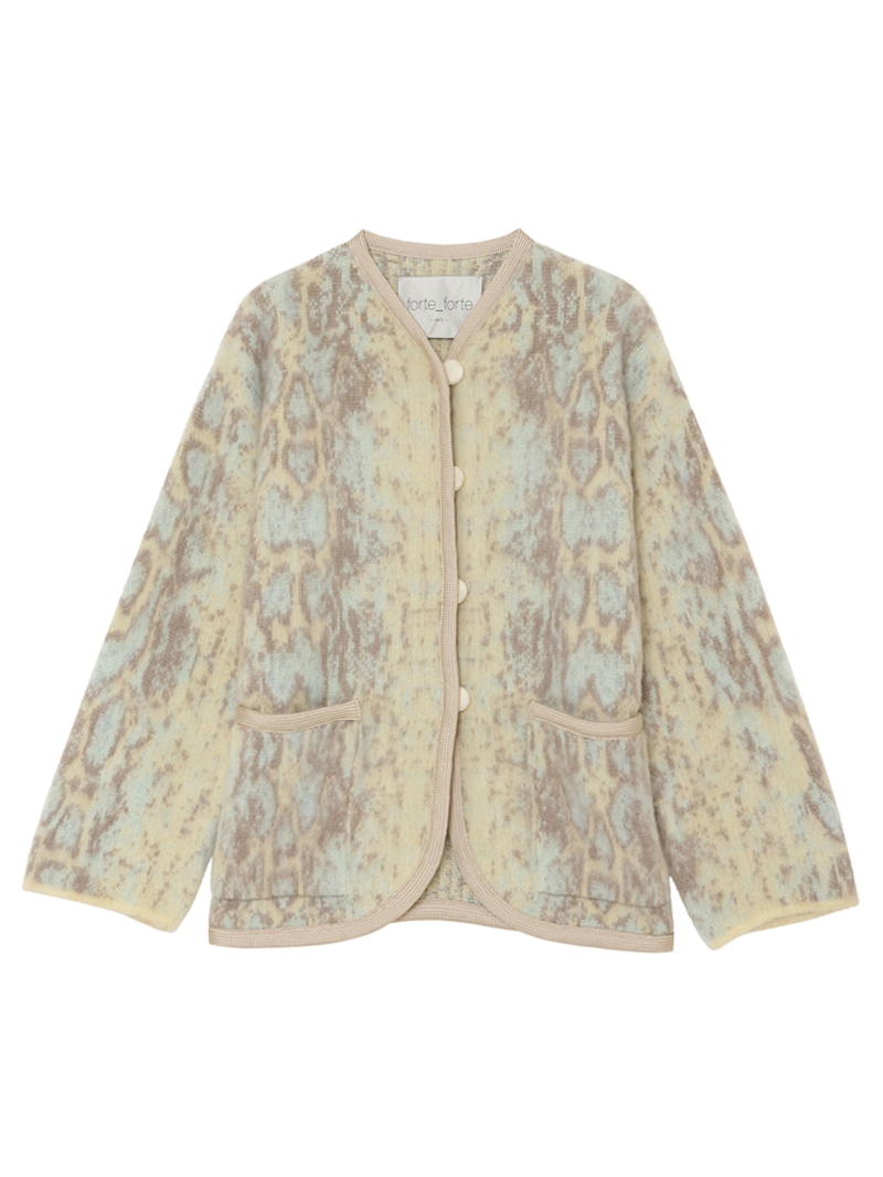 爬虫類がモチーフの"plumes de python"のパターンをジャカード織りで表現した、ノーカラーのアルパカ混ショートコート。繊細な色合いが洗練された美しさを引き立てます。贅沢な柔らかさと起毛感がありつつもコンパクトな仕上がりで、ツヤのあるパイピングが全体を引き締めます。