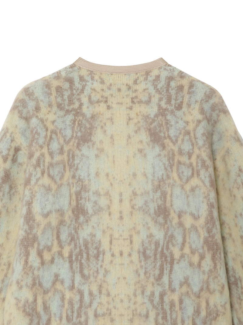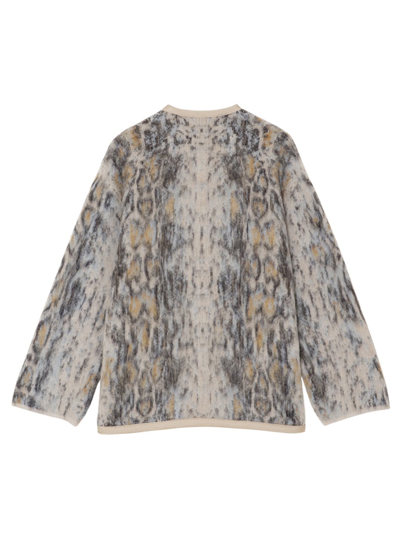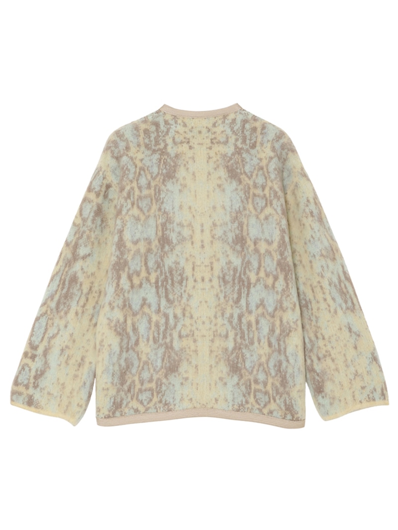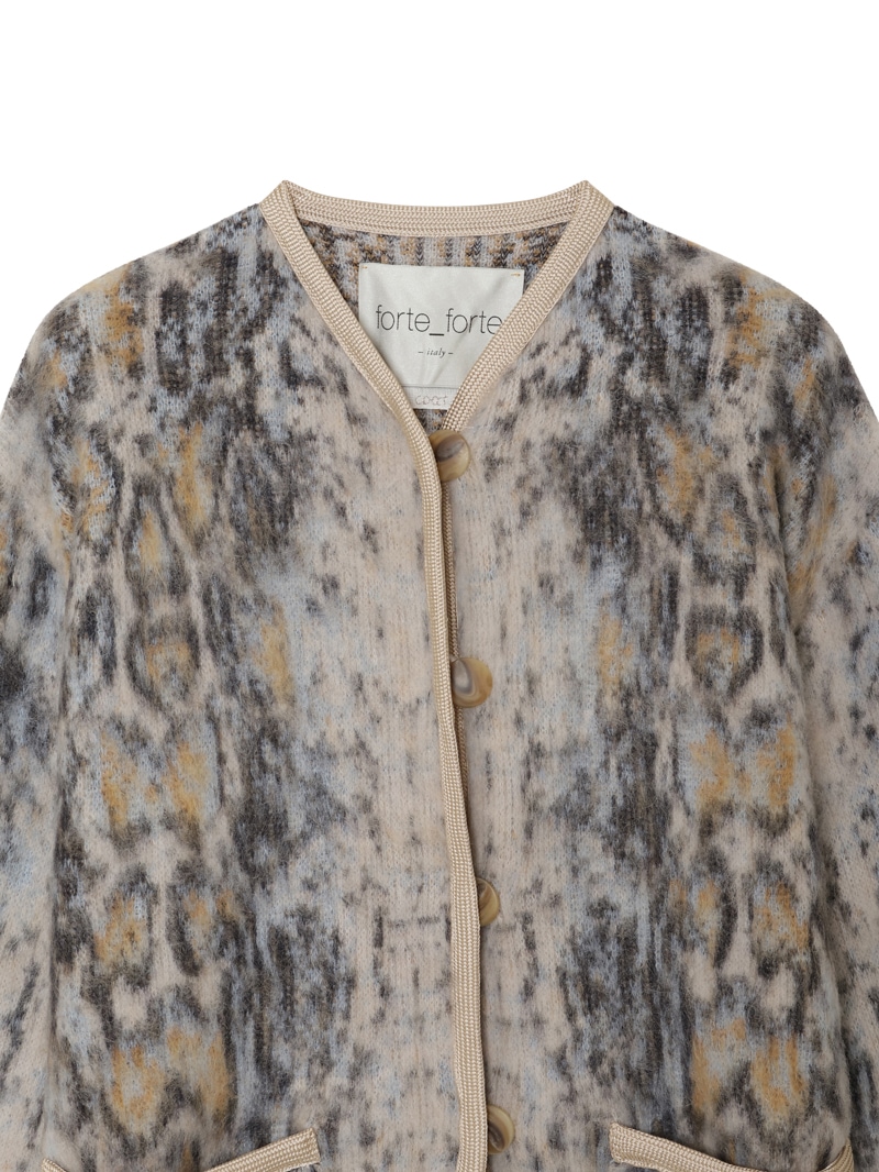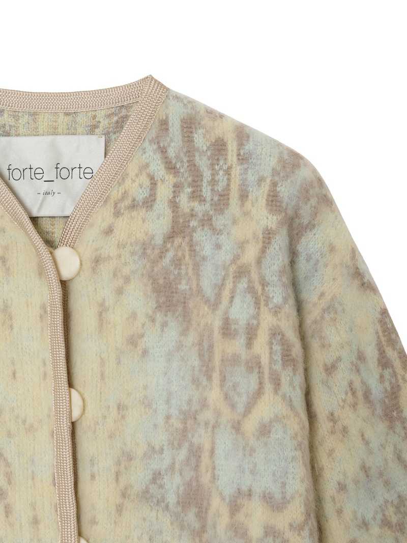 爬虫類がモチーフの"plumes de python"のパターンをジャカード織りで表現した、ノーカラーのアルパカ混ショートコート。繊細な色合いが洗練された美しさを引き立てます。贅沢な柔らかさと起毛感がありつつもコンパクトな仕上がりで、ツヤのあるパイピングが全体を引き締めます。