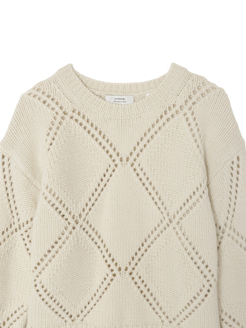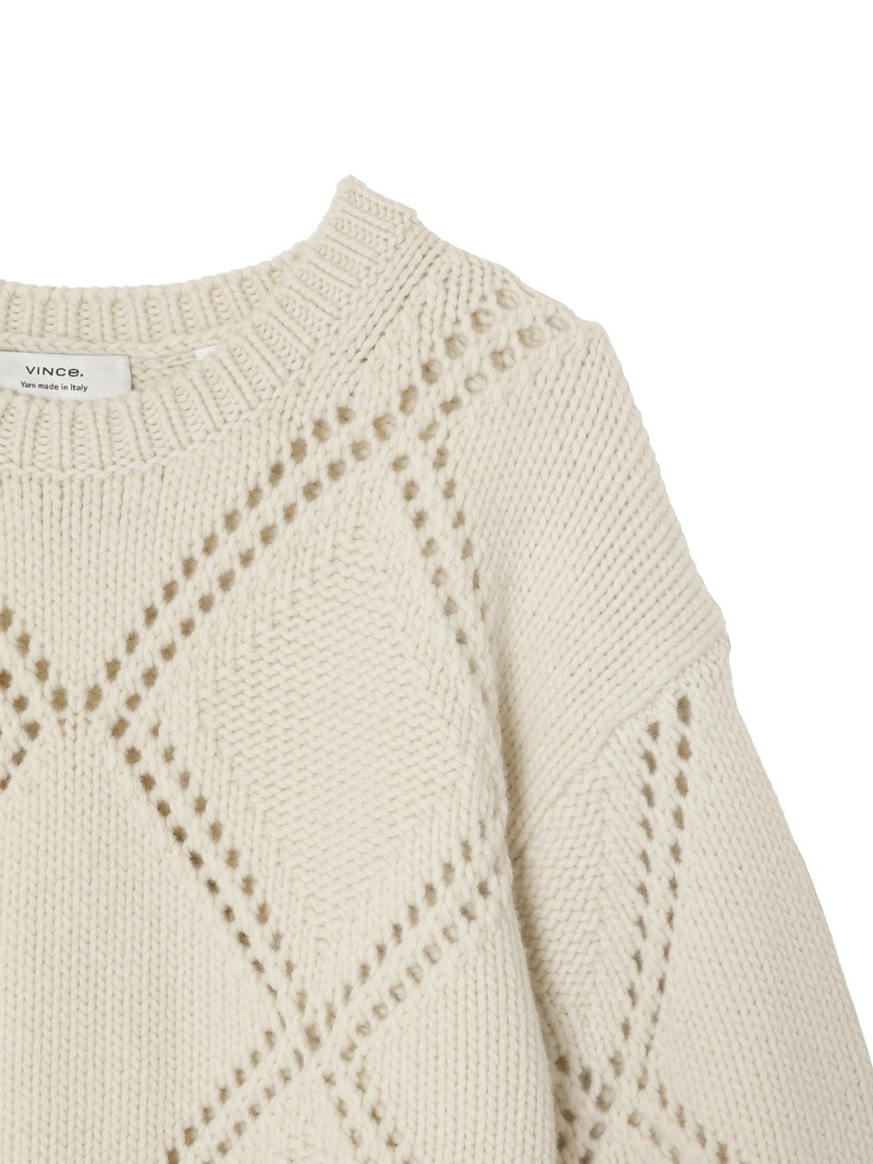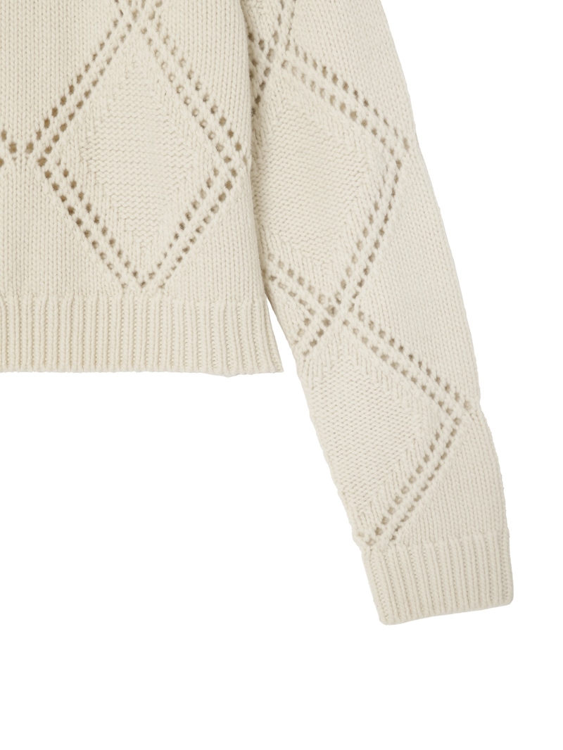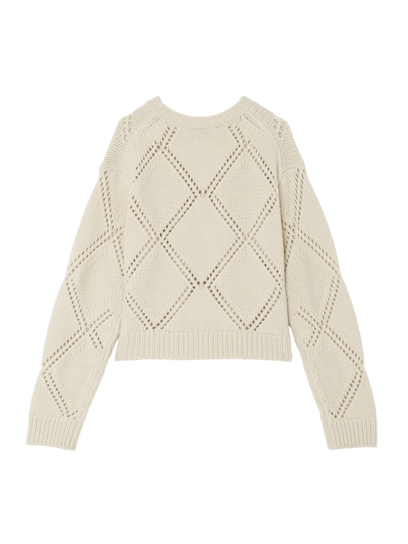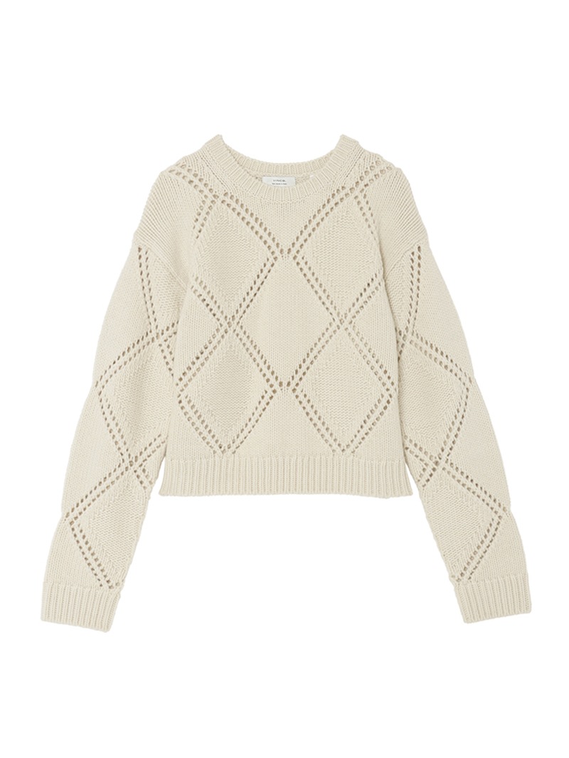 繊細なメリノウールを使用した、立体感のあるアーガイル柄クルーネックニット。クラシックなパターンにテクスチャーを加えて、モダンな印象に仕上げています。コンパクトな丈感でカジュアルからフォーマルまで幅広く合わせやすい一着です。