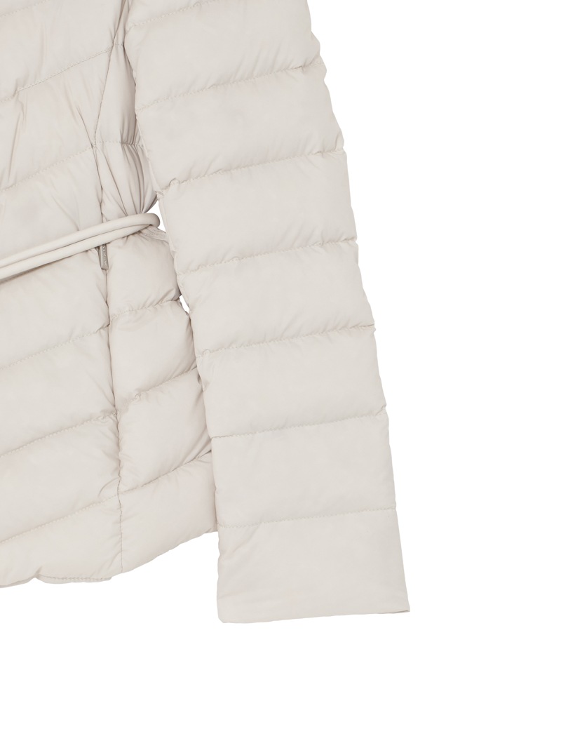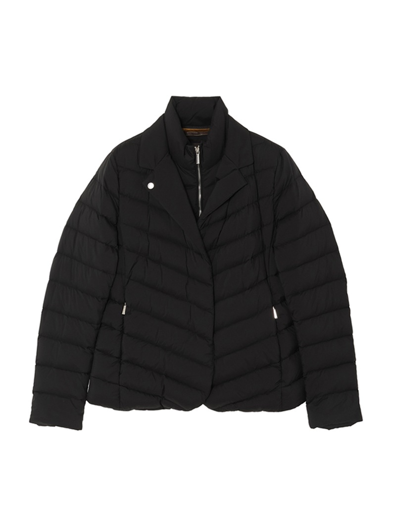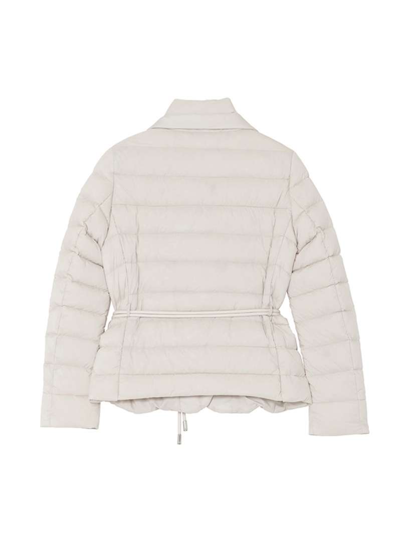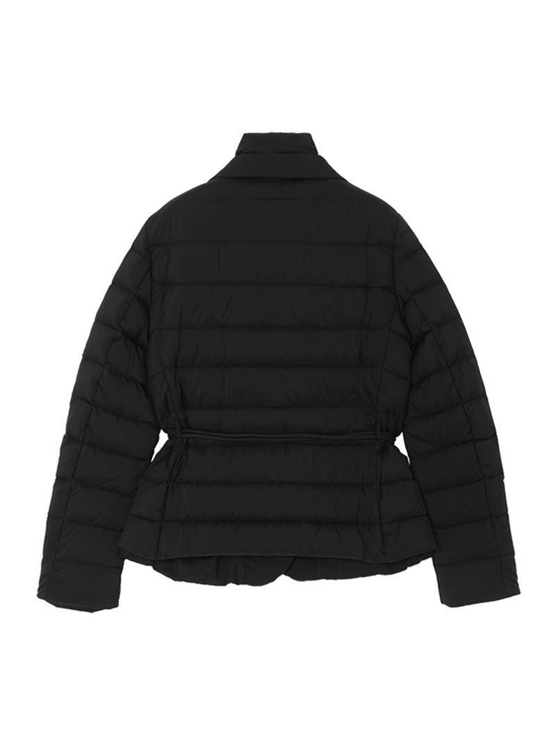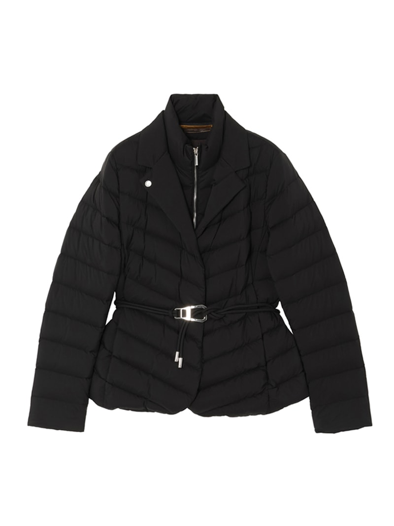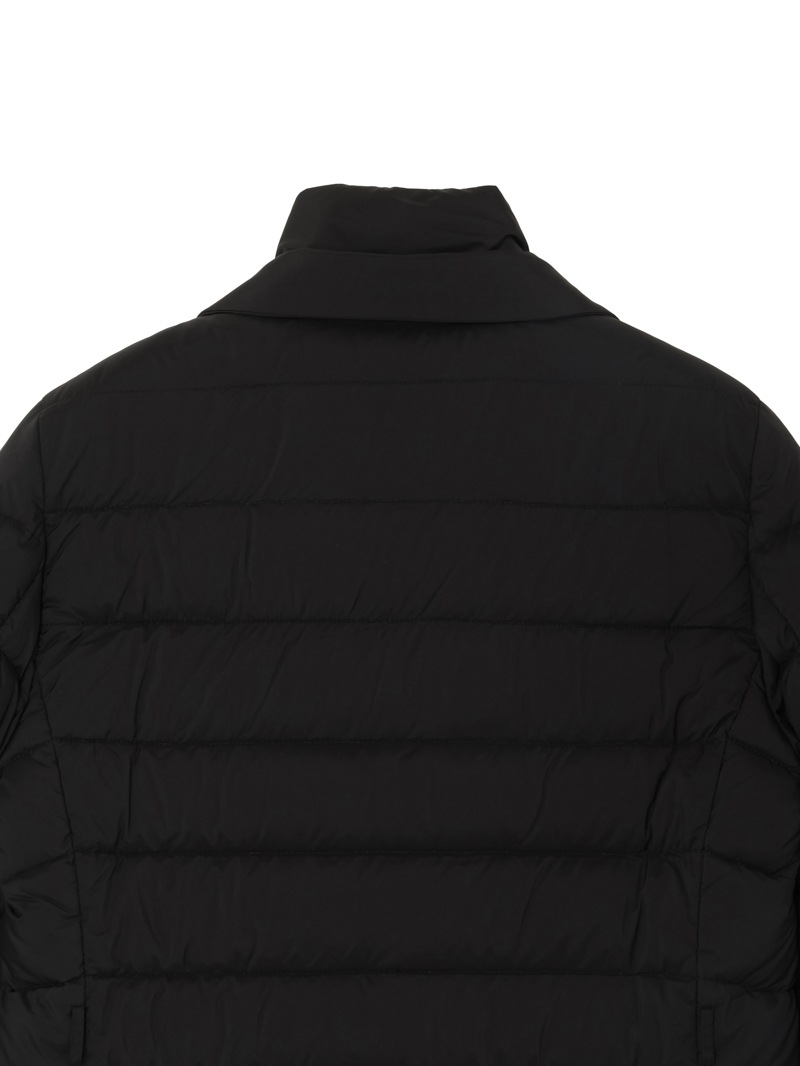 撥水効果を備えたAcquaライン(耐水レベル1)のショートダウンジャケット。羽毛が抜けにくいダウンプルーフ加工を施した軽量のテクニカルファブリックは、シルキーな光沢を宿したマットな質感と、かすかなシボ感が特徴です。上質なグースダウンを贅沢に詰め込み、斜めに入れたキルティングとメタルバックル付きのベルトですっきりとスマートなシルエットに仕上げています。