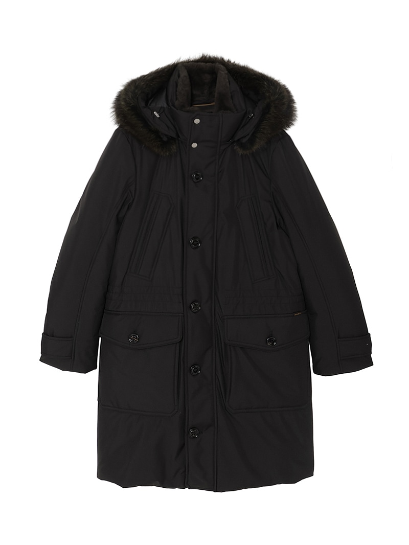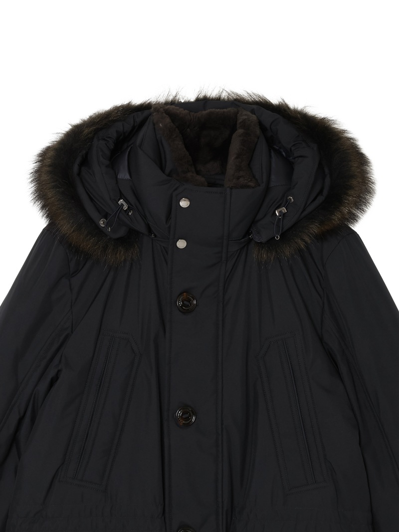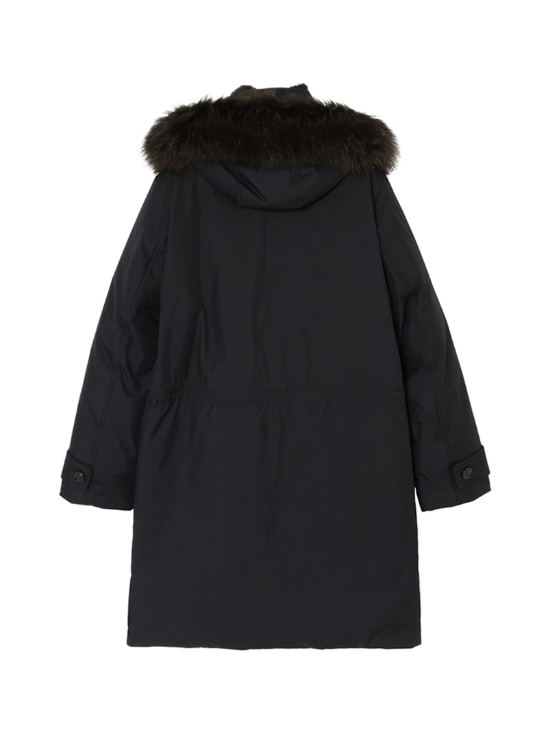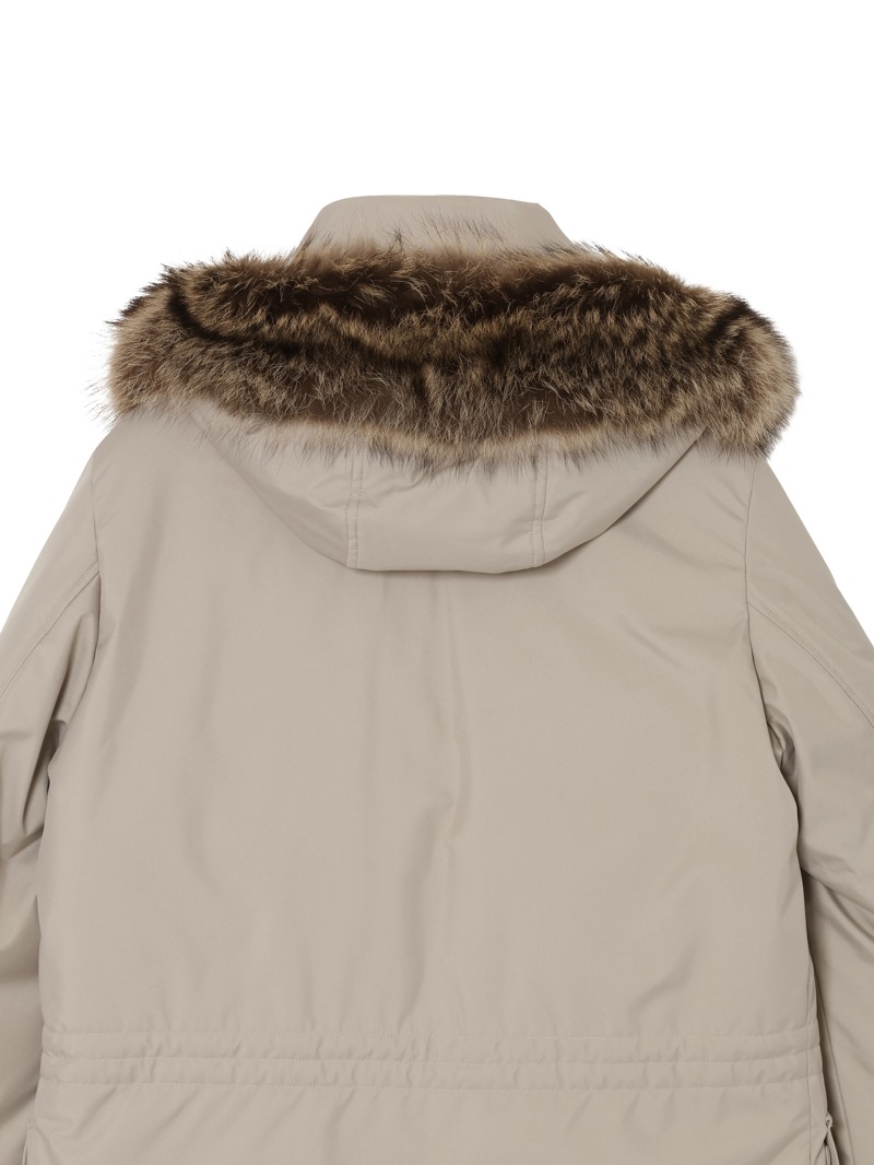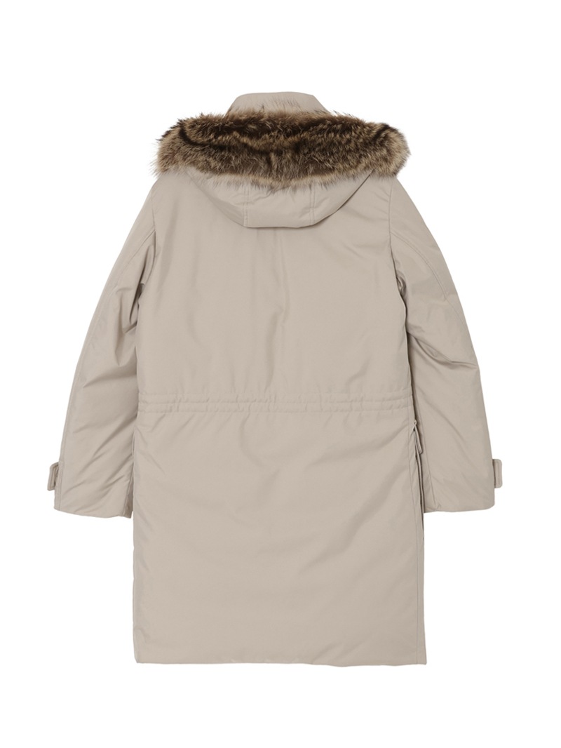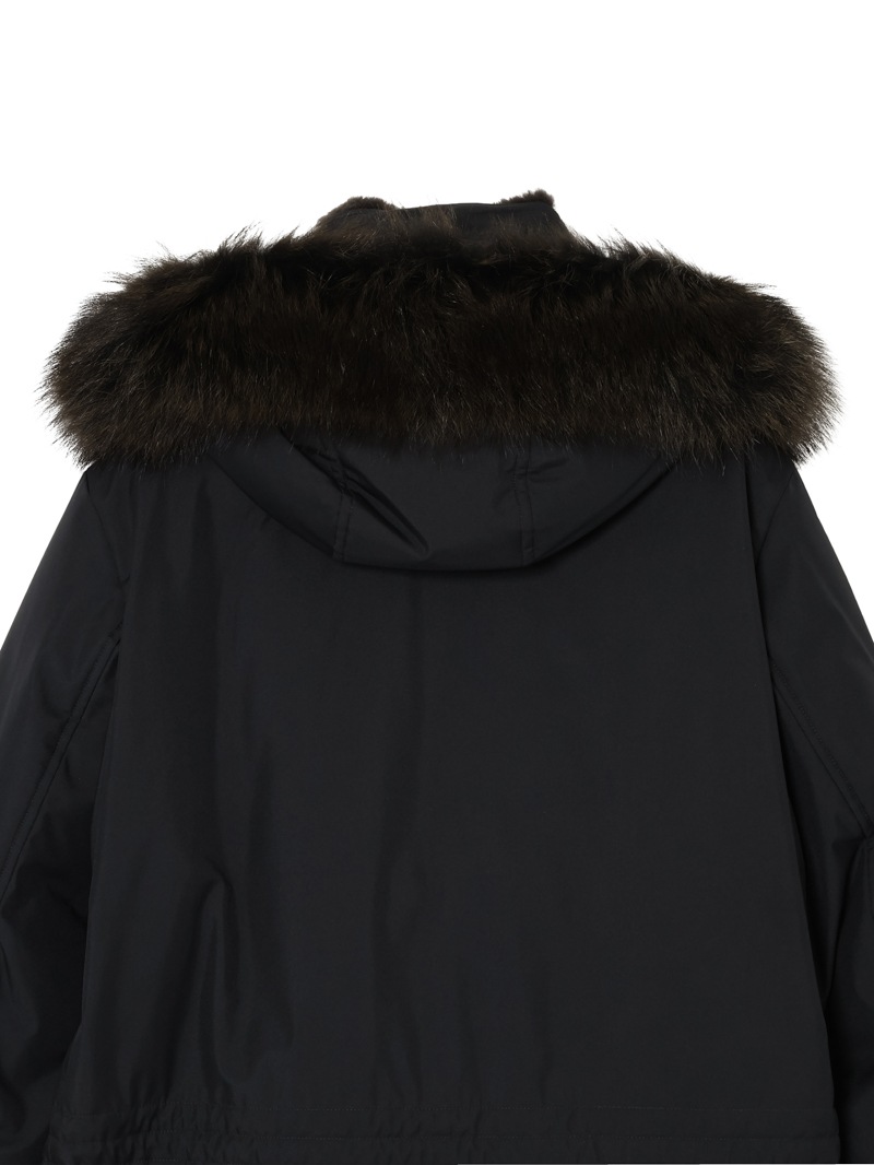 フロントはダブルスライダージップとボタンのダブルクロージャー仕様。ラクーンファーのトリミングを施したフードと、シアリングファー付きの内襟は取り外しが可能。光沢感のある裏地にはキルティングを施し、ウエストはドローストリングで調節可能。フラップとボタンが付いたサイドポケット、胸元にハンドウォーマーポケット、3つの内ポケットを備えています。