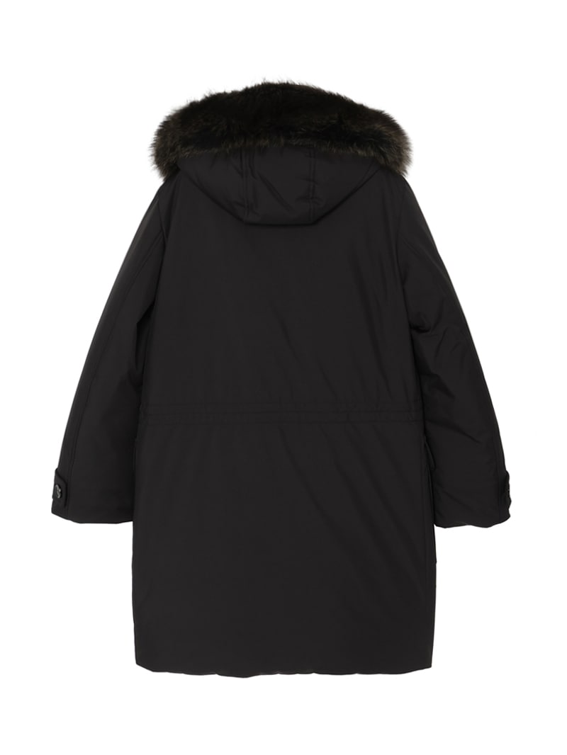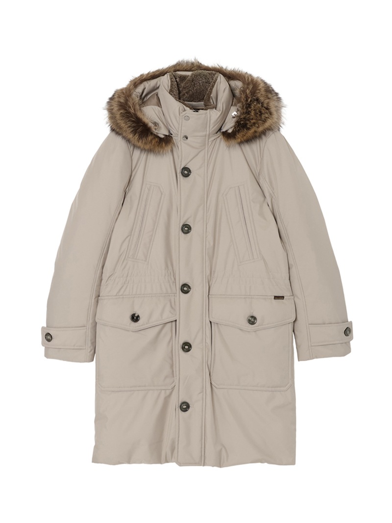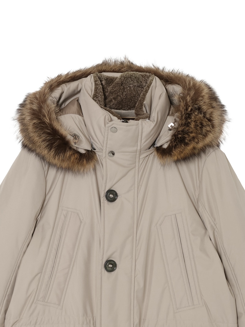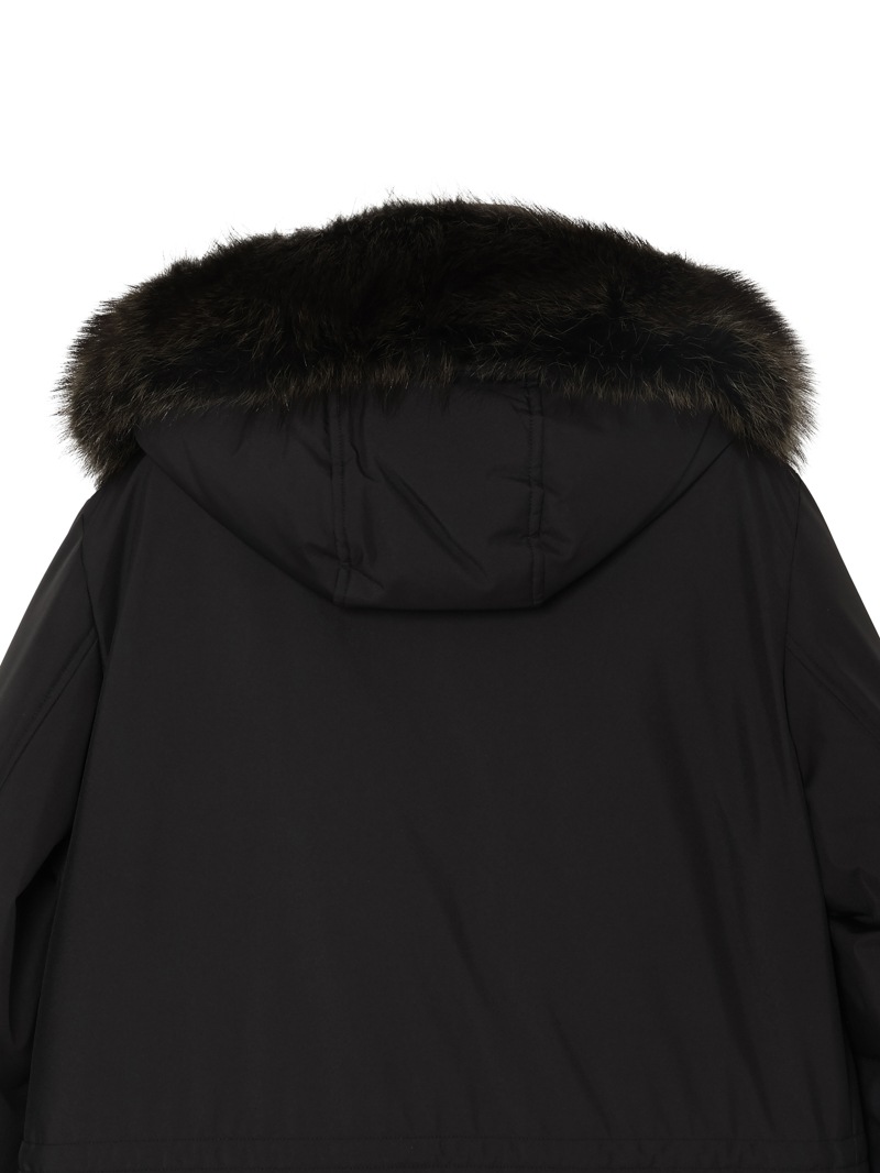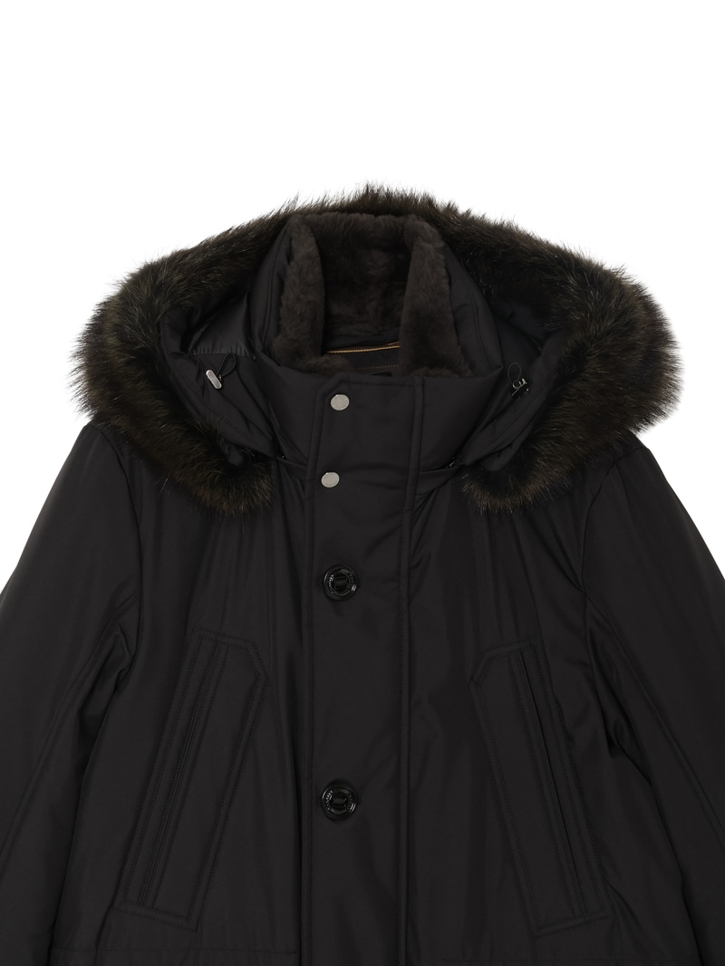 フロントはダブルスライダージップとボタンのダブルクロージャー仕様。ラクーンファーのトリミングを施したフードと、シアリングファー付きの内襟は取り外しが可能。光沢感のある裏地にはキルティングを施し、ウエストはドローストリングで調節可能。フラップとボタンが付いたサイドポケット、胸元にハンドウォーマーポケット、3つの内ポケットを備えています。