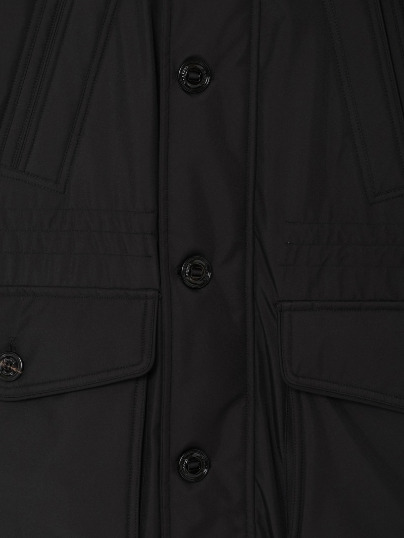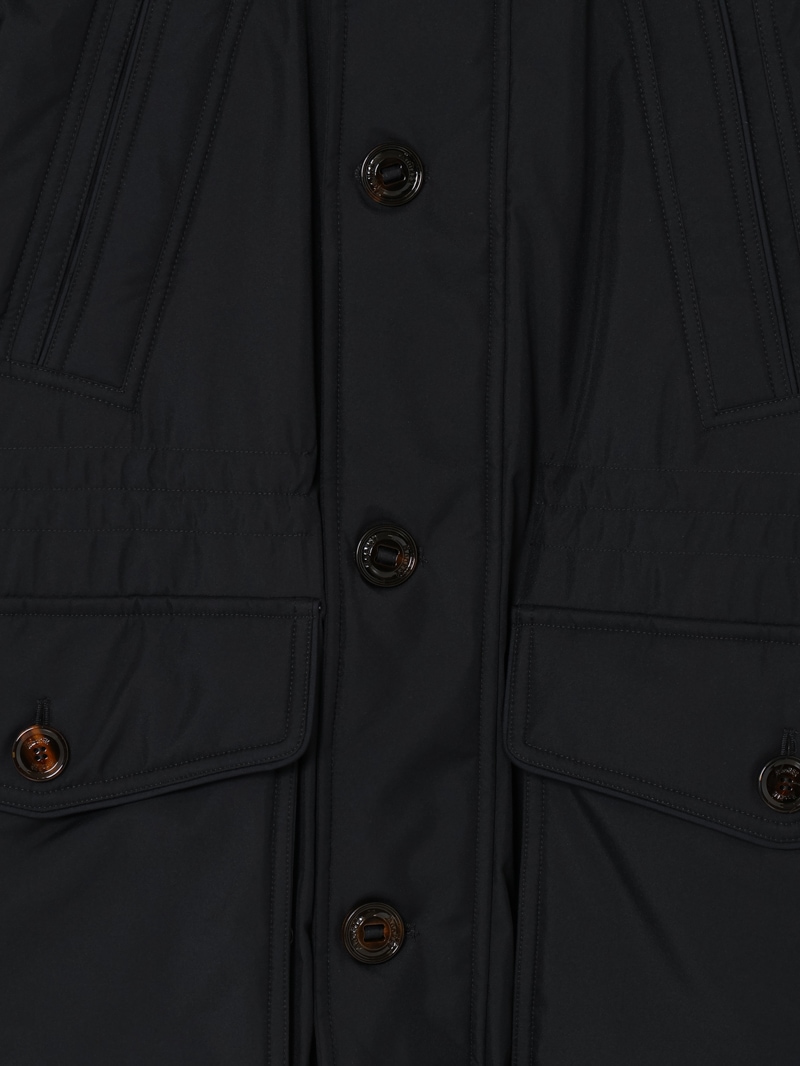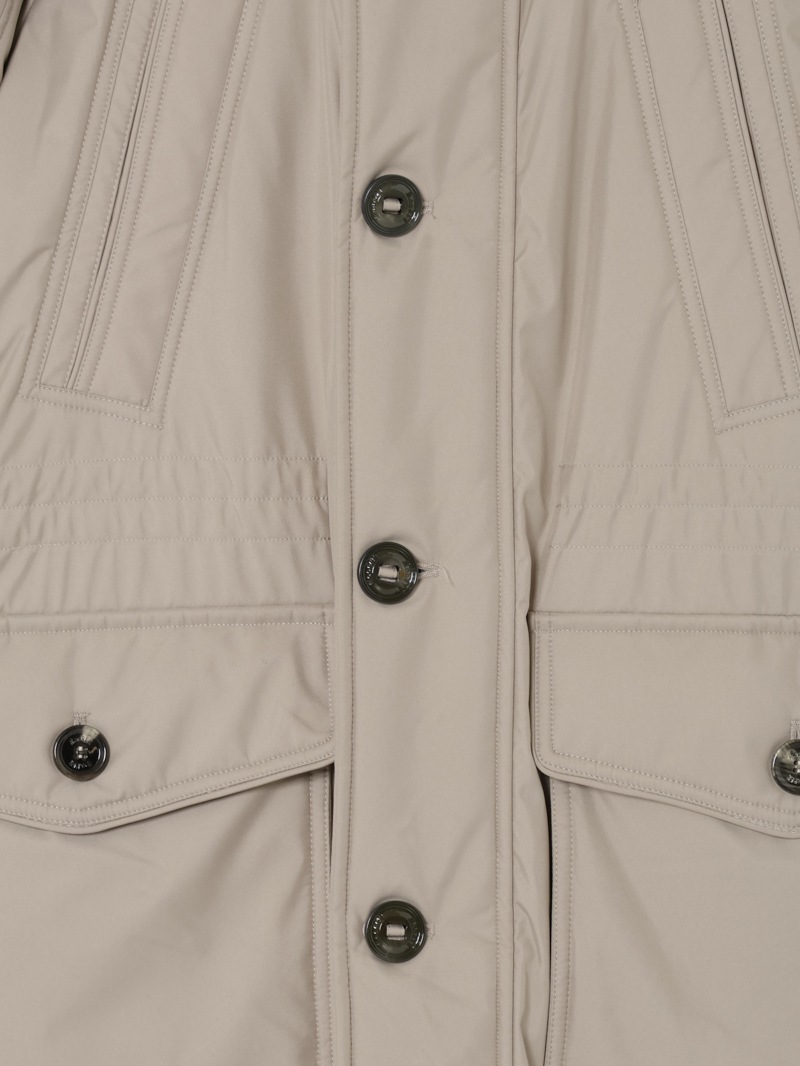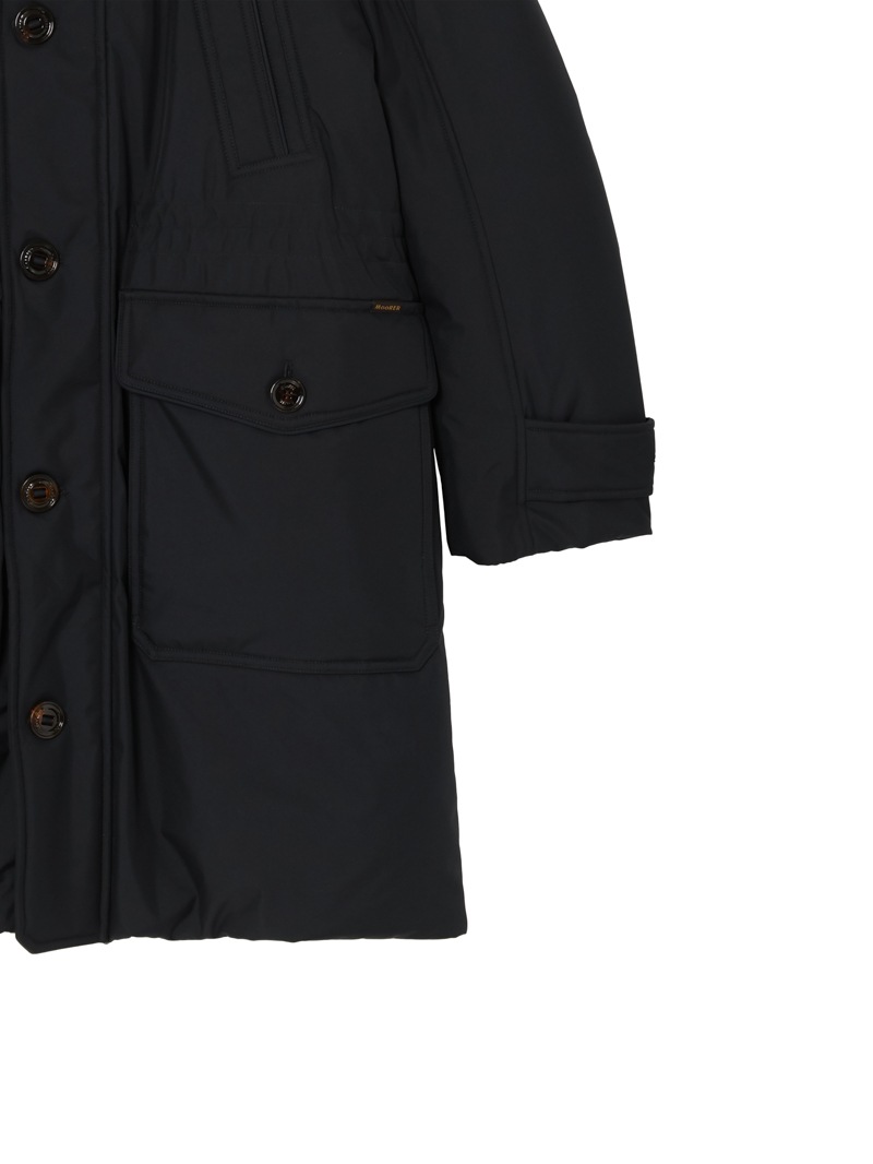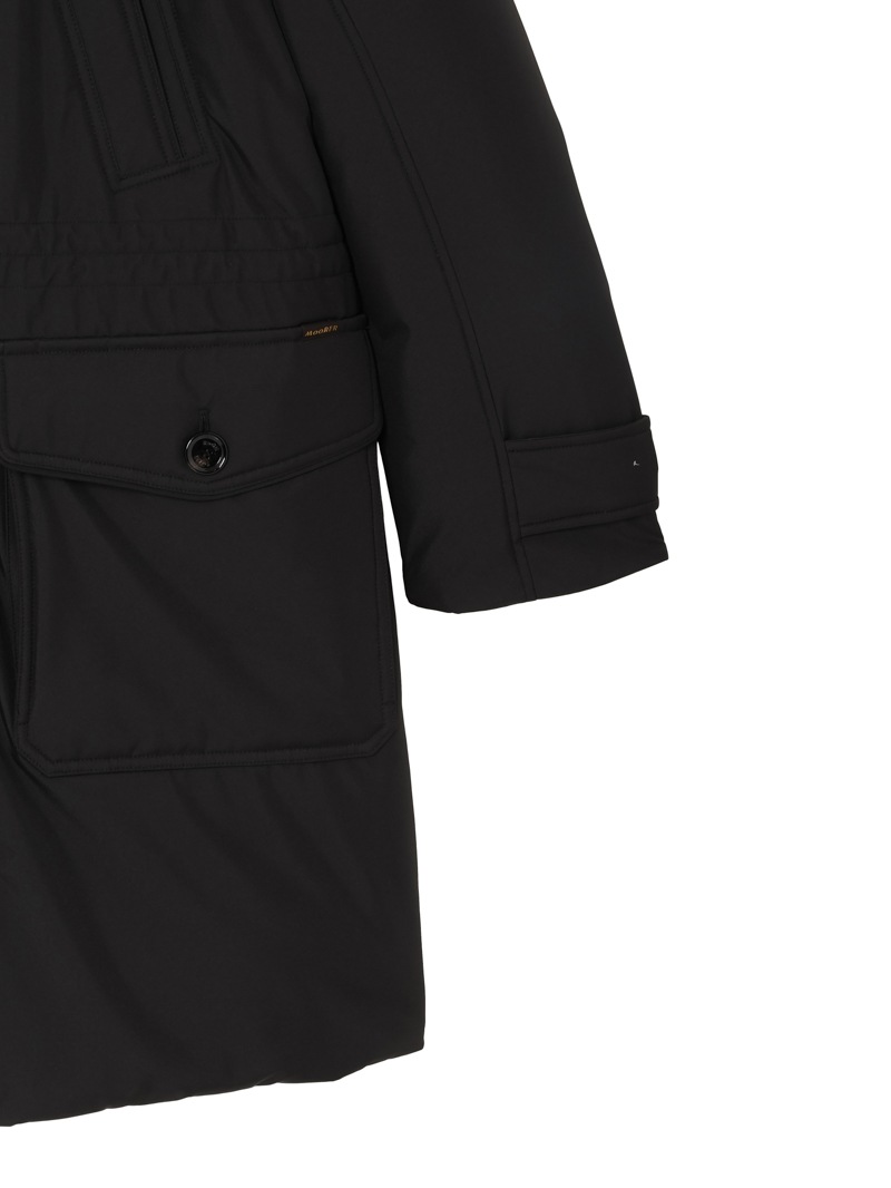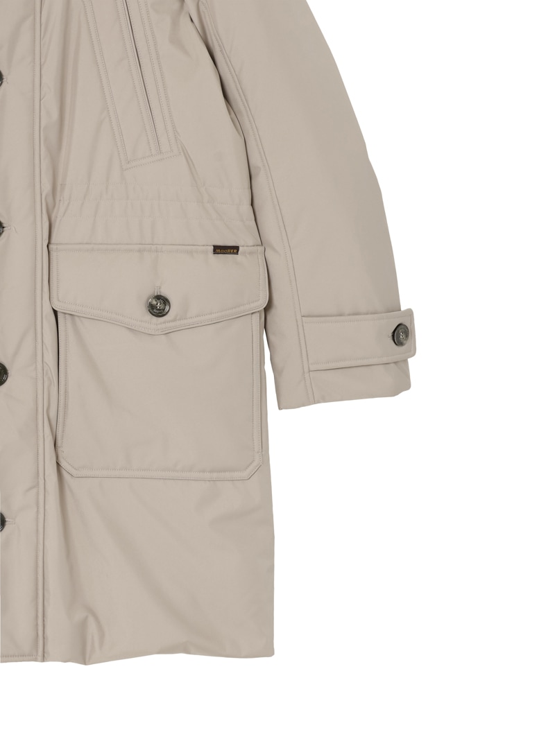 フロントはダブルスライダージップとボタンのダブルクロージャー仕様。ラクーンファーのトリミングを施したフードと、シアリングファー付きの内襟は取り外しが可能。光沢感のある裏地にはキルティングを施し、ウエストはドローストリングで調節可能。フラップとボタンが付いたサイドポケット、胸元にハンドウォーマーポケット、3つの内ポケットを備えています。