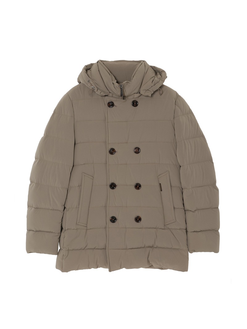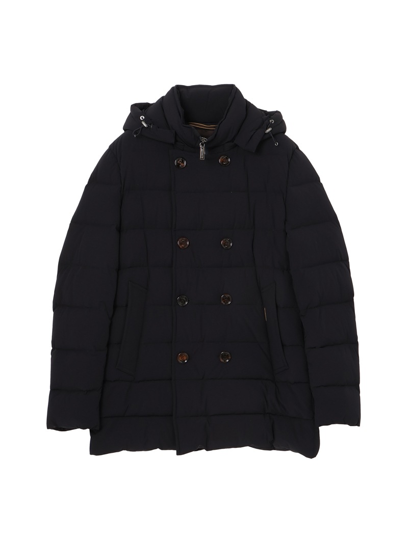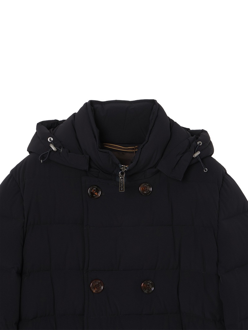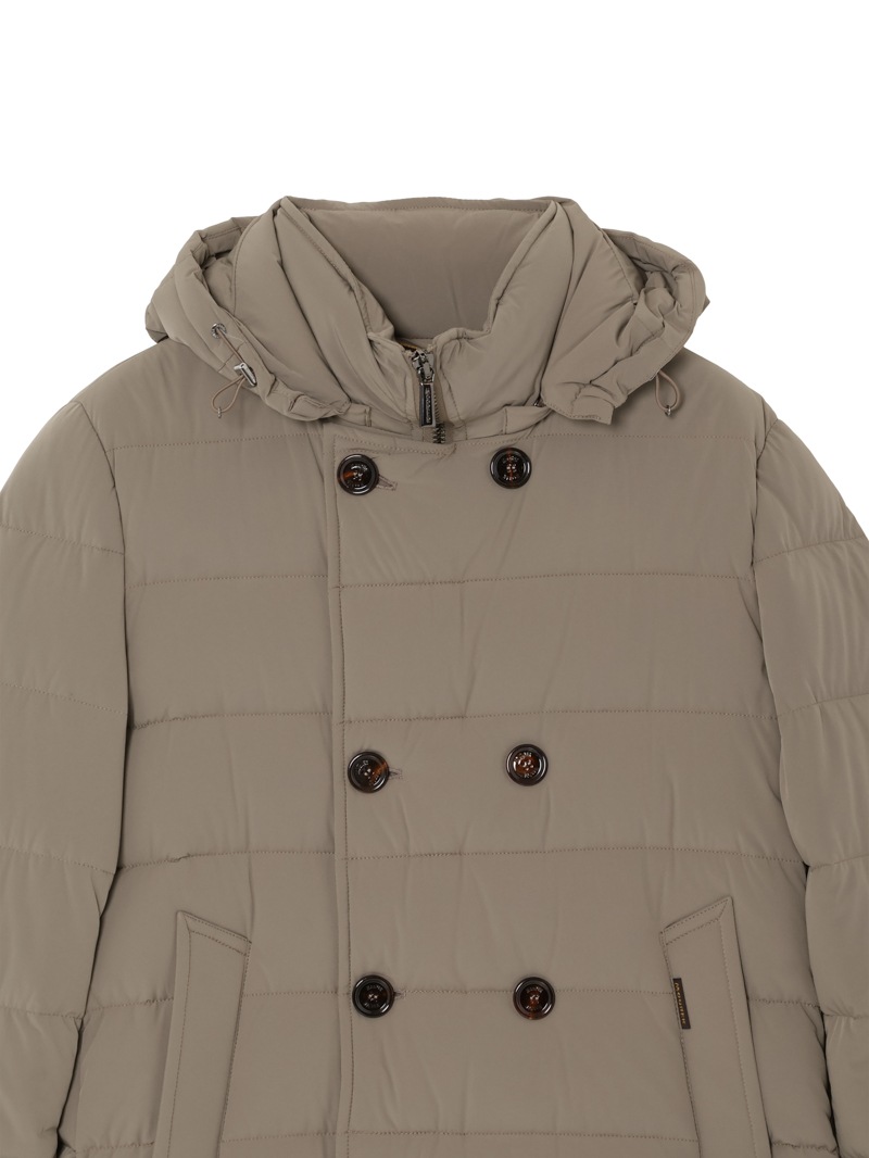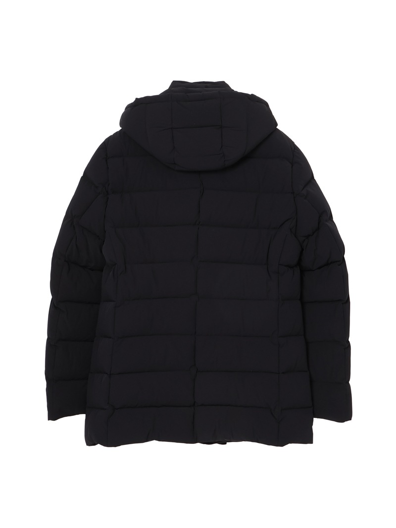 撥水効果を備えたAcquaライン(耐水レベル1)のダブルブレストジャケット。撥水性を持つ2wayストレッチ生地にグースダウンを封入した、ストレートシルエットモデルです。