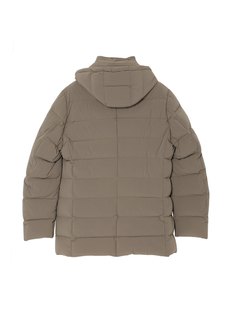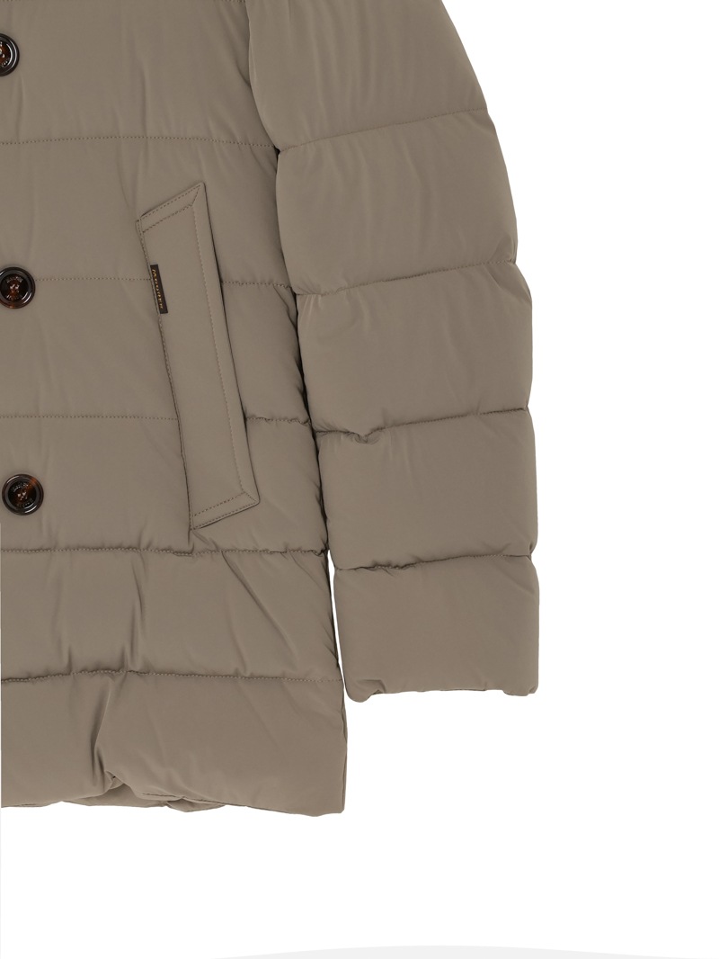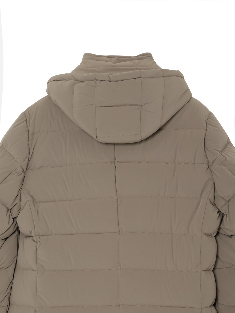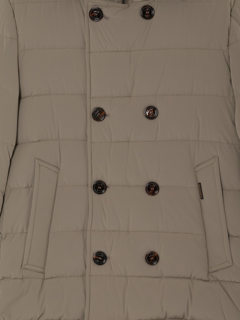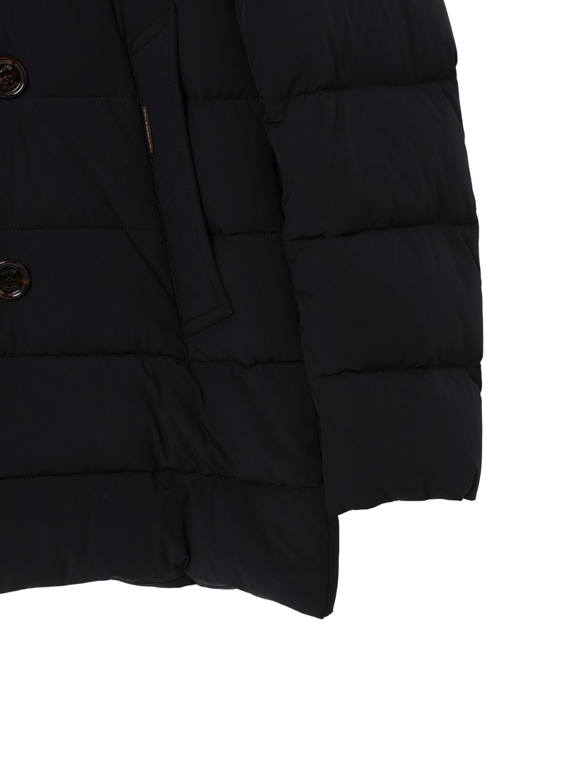 撥水効果を備えたAcquaライン(耐水レベル1)のダブルブレストジャケット。撥水性を持つ2wayストレッチ生地にグースダウンを封入した、ストレートシルエットモデルです。