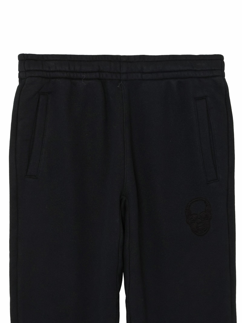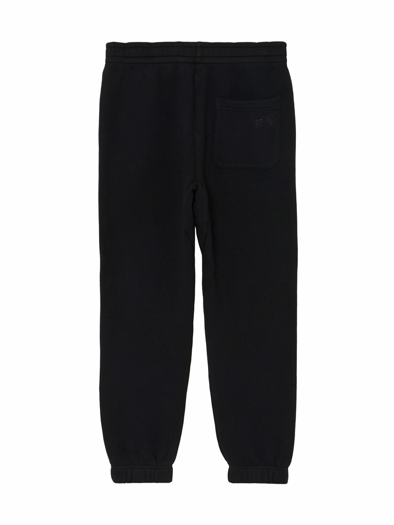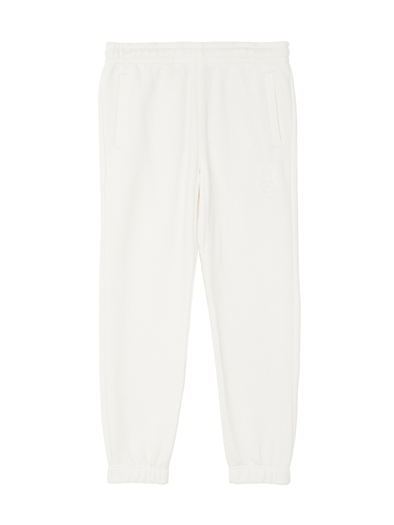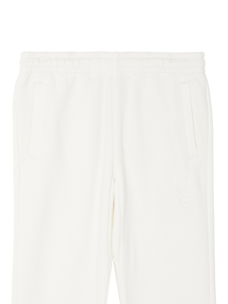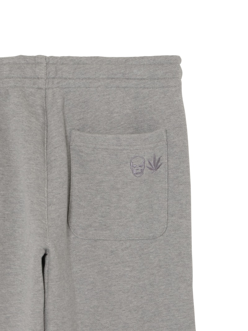 LPF PARISのスウェットパンツ。独特の弾力と、比較的しっかりした目の詰まった素材感が特徴的。左ポケット部分はスカル・モチーフ、後ろポケット部分はスカル&リーフをそれぞれ刺繍で配置。着心地にこだわった上質な素材感。ホワイトとブラック、グレーの3色展開。