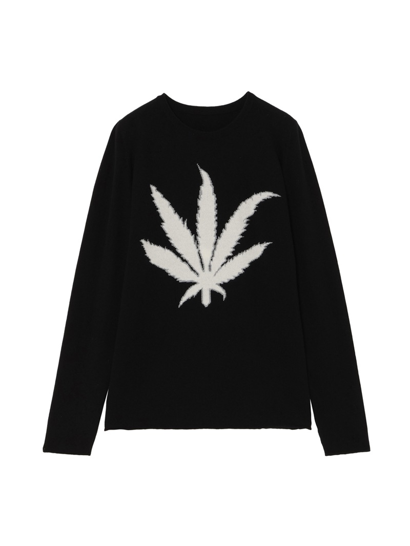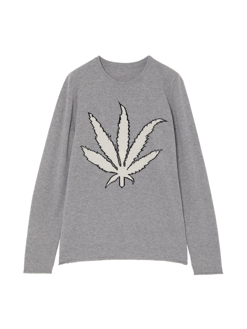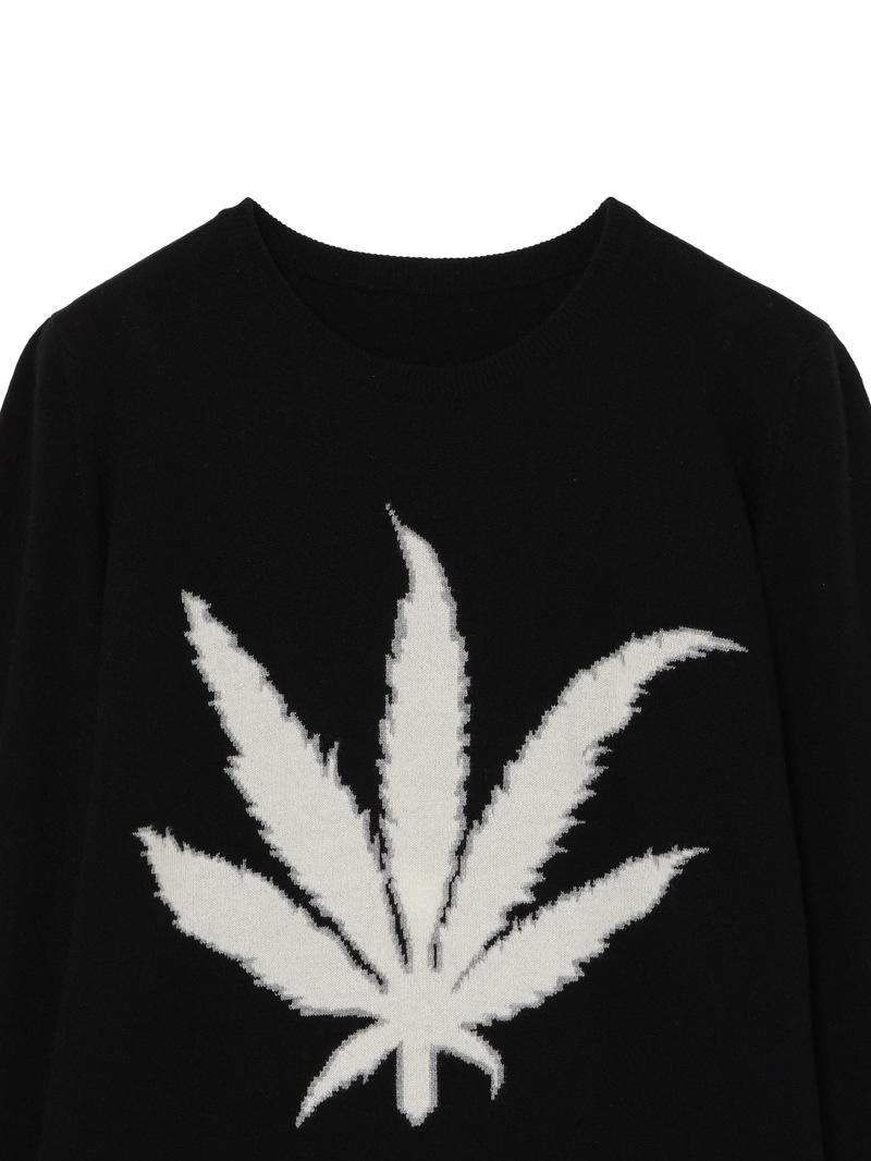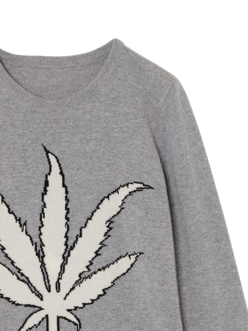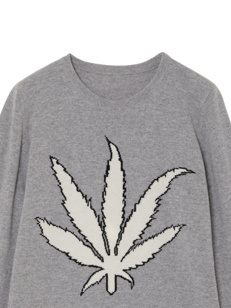 最高級カシミヤを使用したプレーンなミドルゲージセーター。フロントにリーフのインターシャをデザイン。すべてハンドインターシャにより成形されたアイテム。