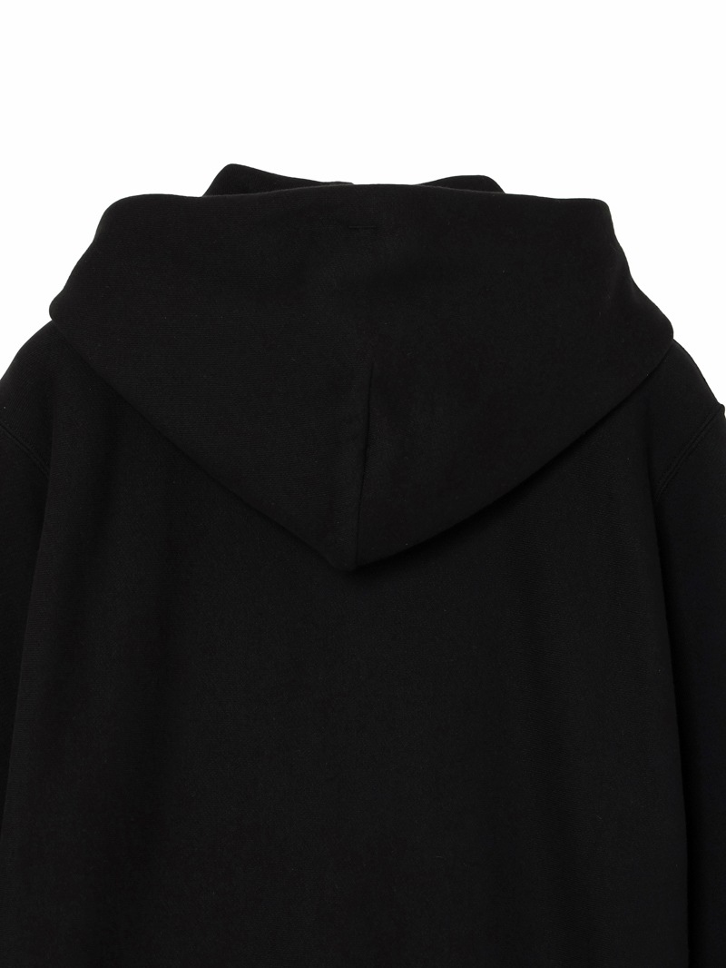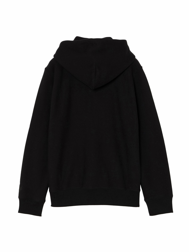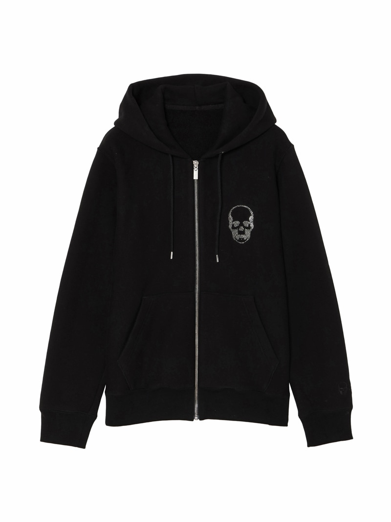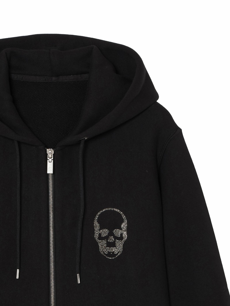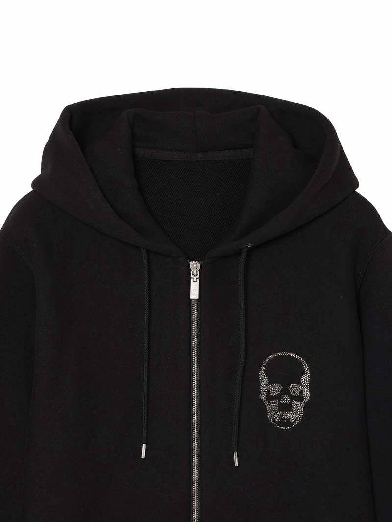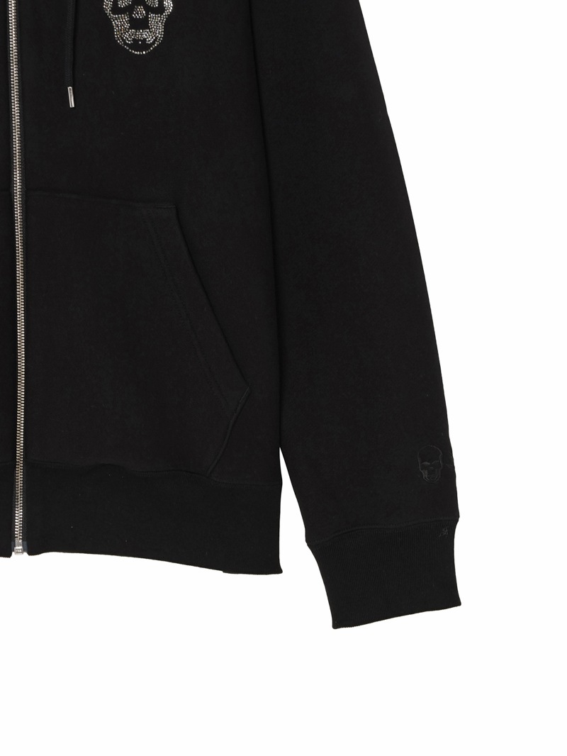 黒色に製品染めを施したスウェット素材を使用したフードジップジャケット。フロント左胸にスカルをクリスタルで配置。左袖部分にスカル&リーフを刺繍で配置したデザイン。柔らな風合いの裏起毛素材。生地を編むときに糸に余計な力をかけないうえ編み上がった生地も強制的に巻き取らないため膨らみがあり柔らかい風合いに。
