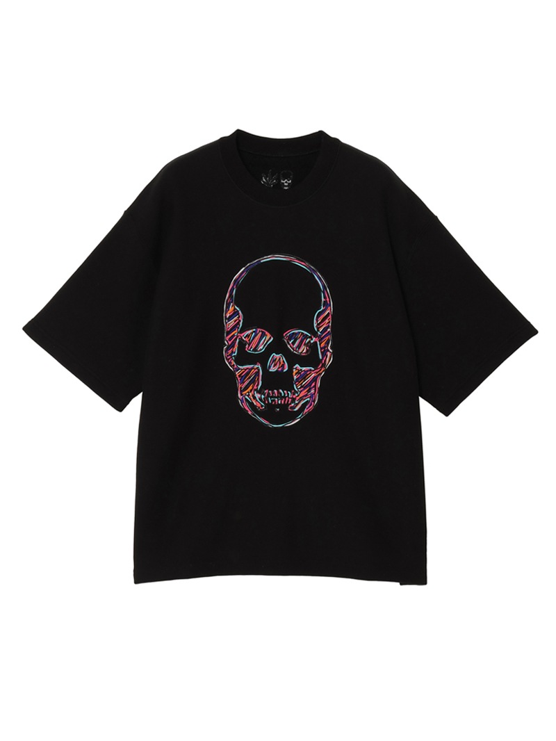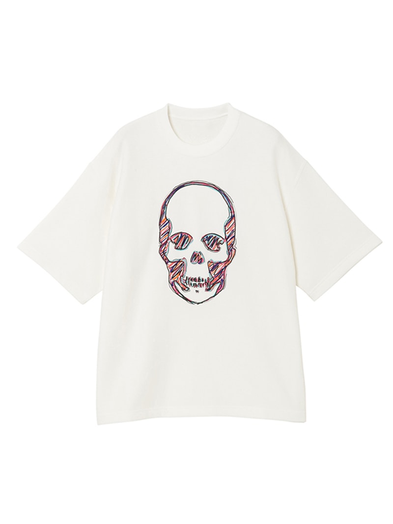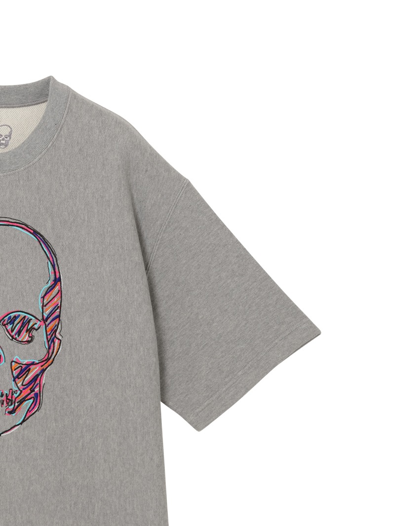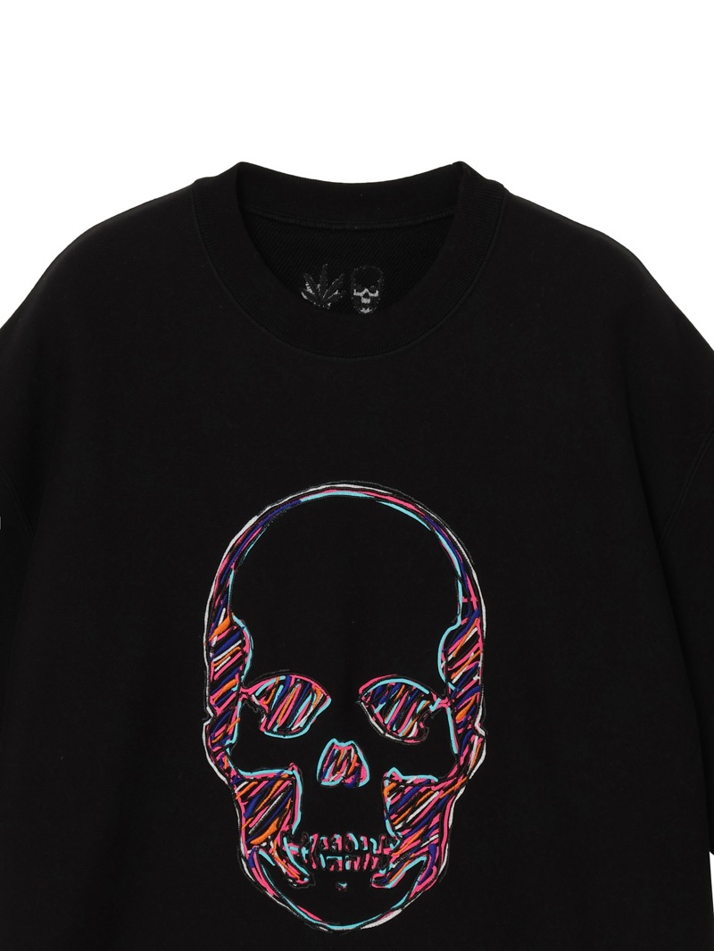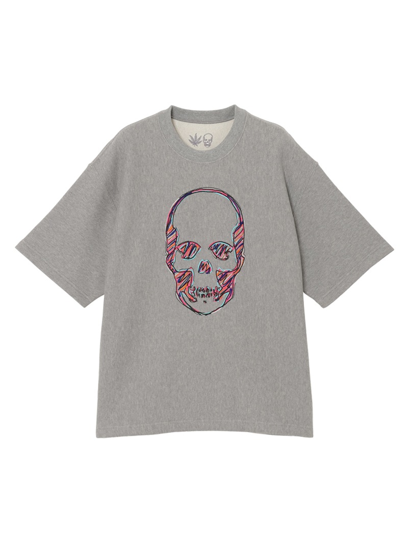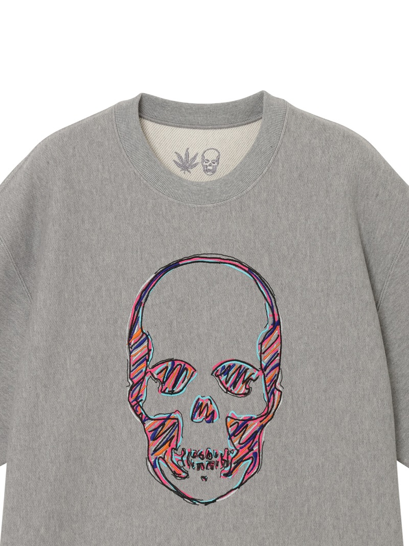 フロントにスカル・モチーフをプリントと刺繍で手書き風に表現したデザイン。首元にはスカル&リーフを配置。表面にスビン混綿を使用した裏毛素材。スビン混綿を使用する事により柔らかさ+ヌメリを出している。裏面は通常単糸を使用し、双糸を使用することでハリ感を演出。仕上げは表面の毛羽を減らすバイオ加工をしている。