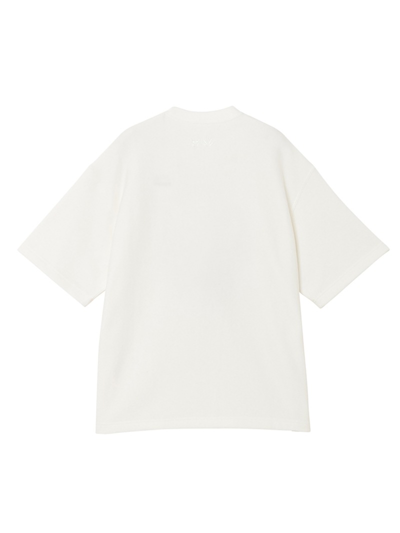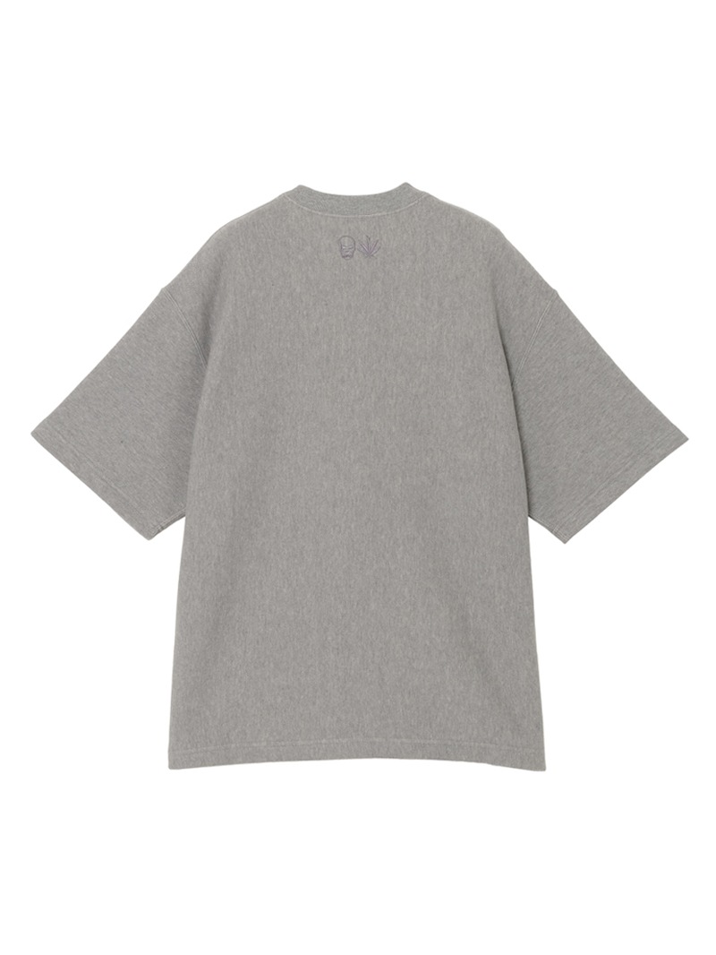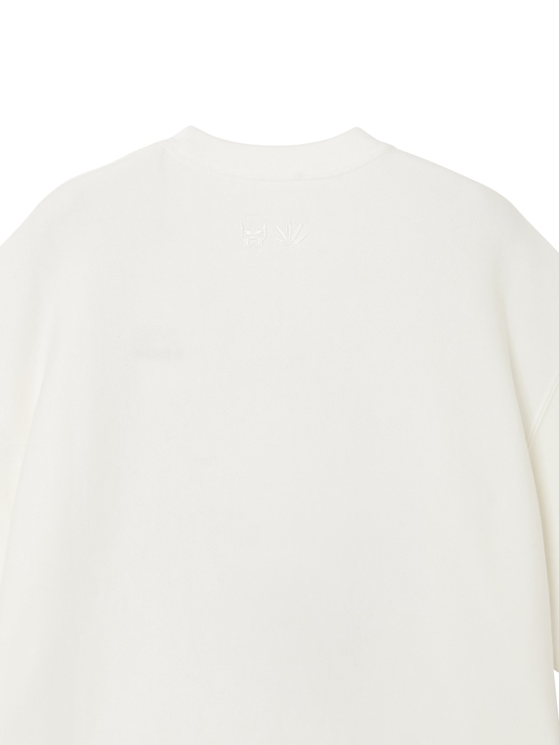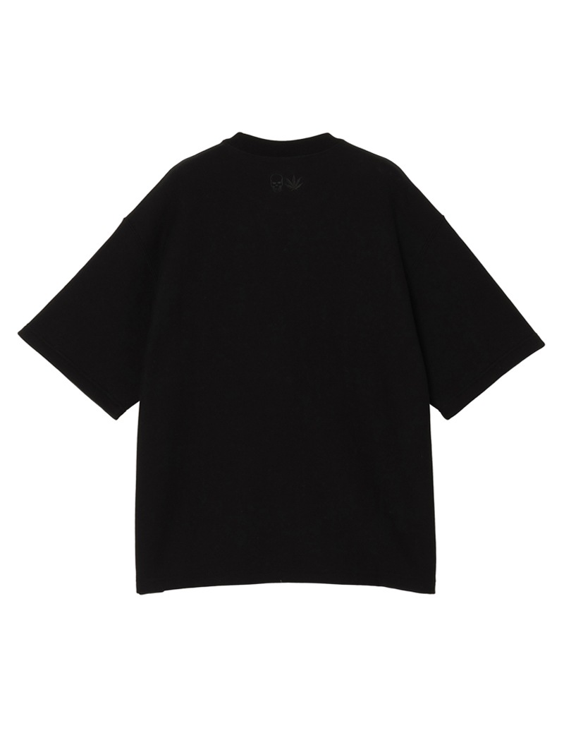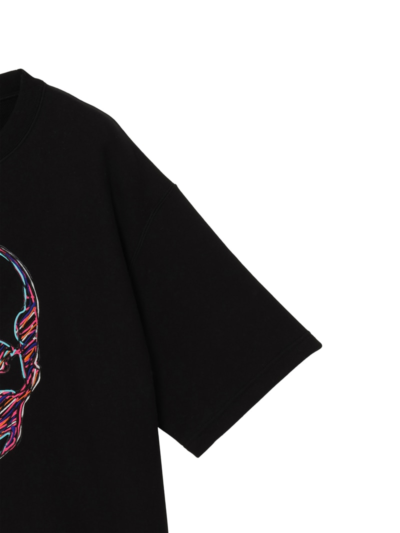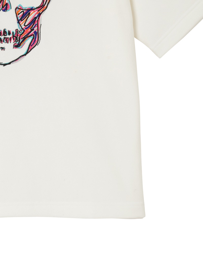 フロントにスカル・モチーフをプリントと刺繍で手書き風に表現したデザイン。首元にはスカル&リーフを配置。表面にスビン混綿を使用した裏毛素材。スビン混綿を使用する事により柔らかさ+ヌメリを出している。裏面は通常単糸を使用し、双糸を使用することでハリ感を演出。仕上げは表面の毛羽を減らすバイオ加工をしている。