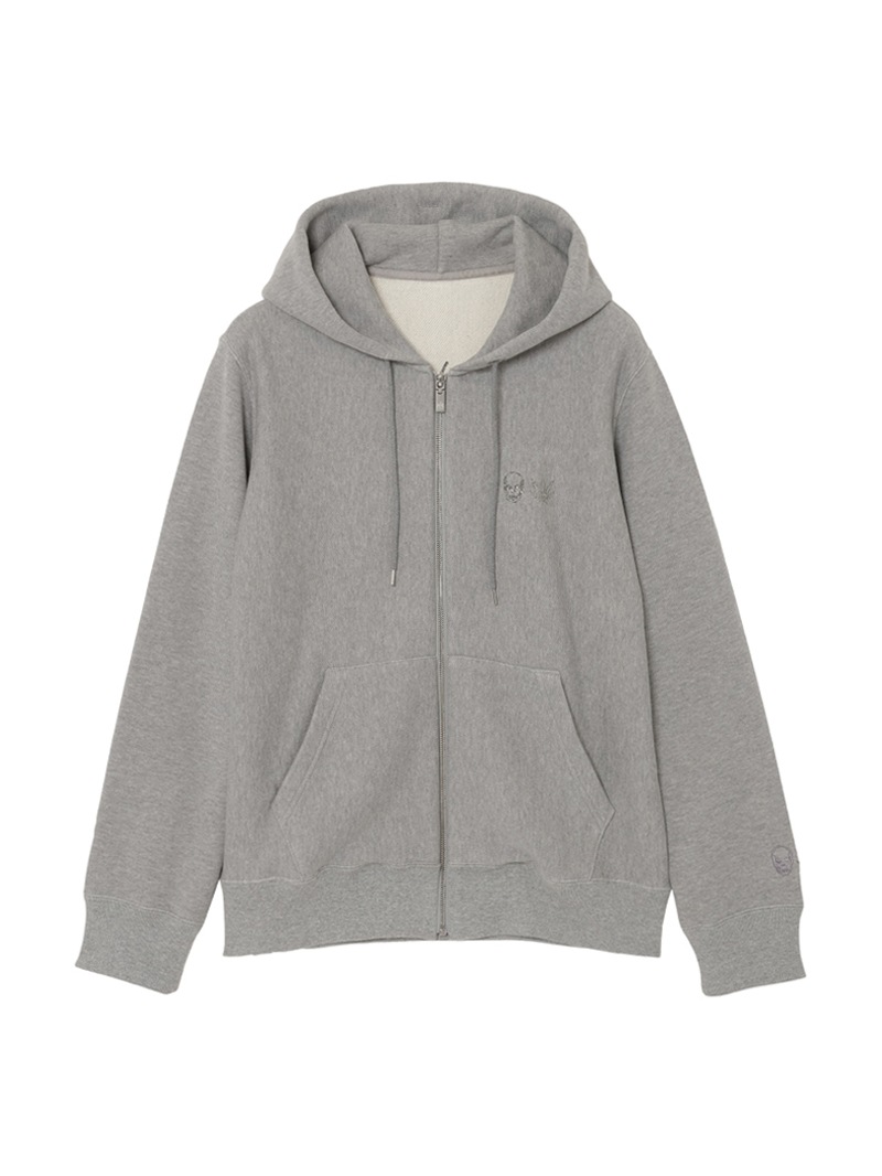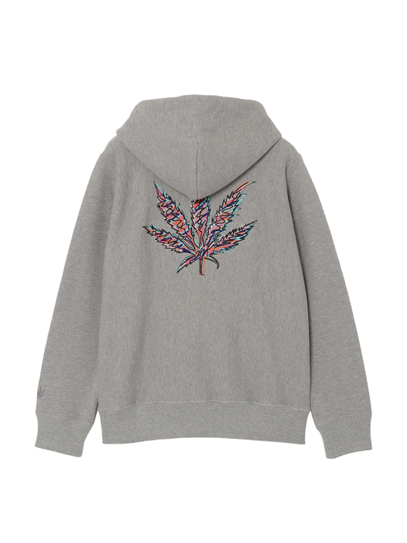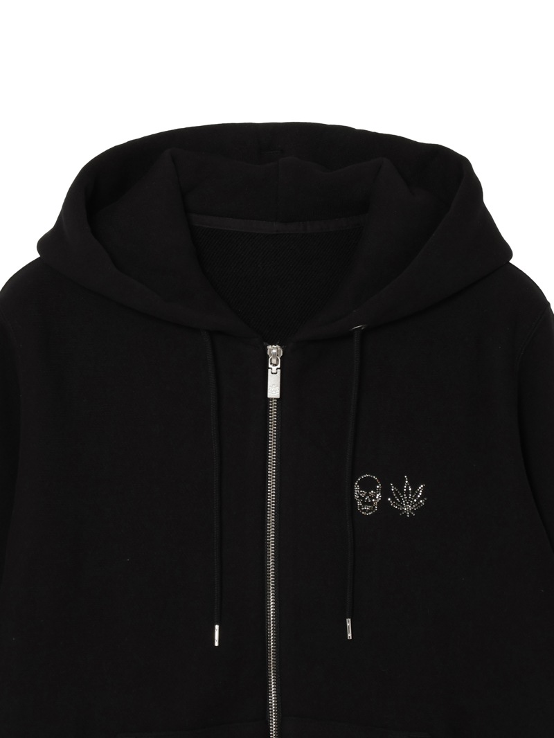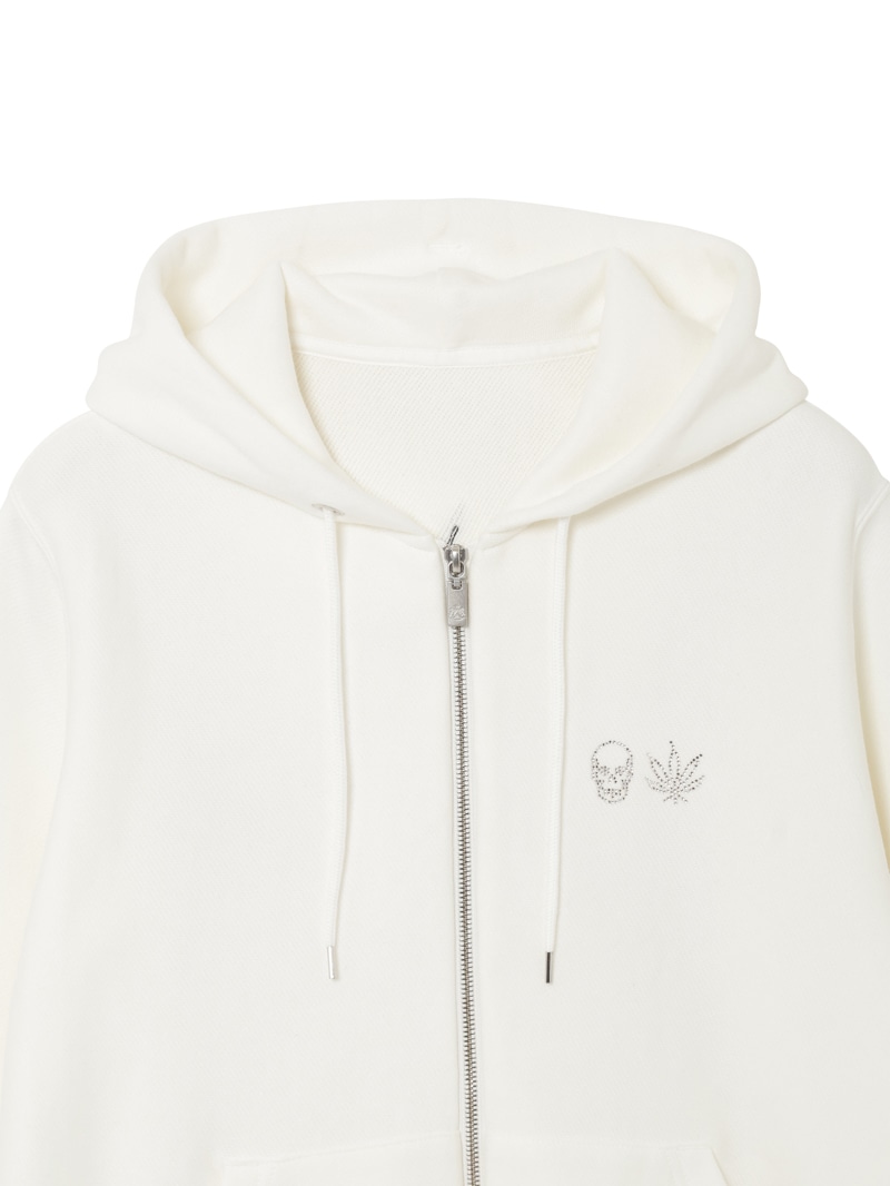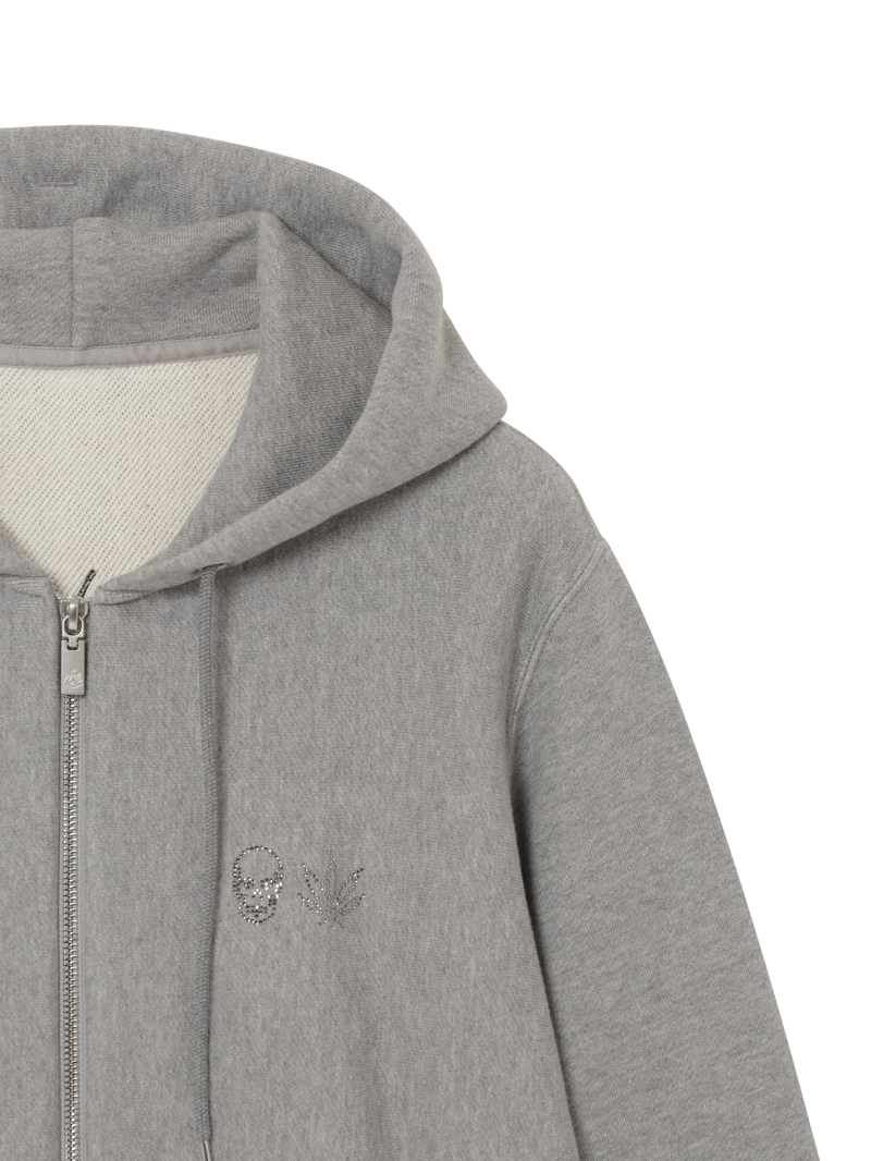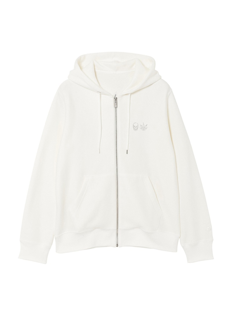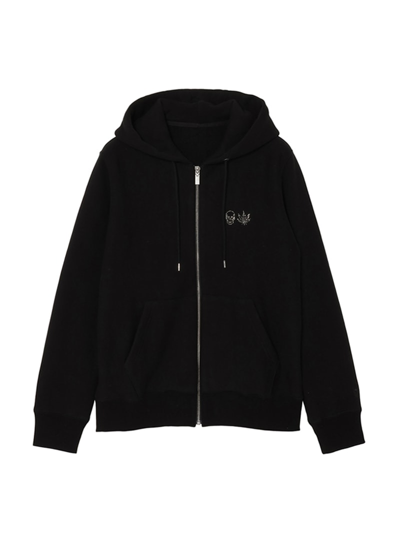 左胸にクリスタルのスカル&リーフを配置。背中にはリーフ・モチーフをプリントと刺繍で手書き風に表現したデザイン。表面にスビン混綿を使用した裏毛素材。スビン混綿を使用する事により柔らかさ+ヌメリを出している。裏面は通常単糸を使用し、双糸を使用することでハリ感を演出。仕上げは表面の毛羽を減らすバイオ加工をしている。