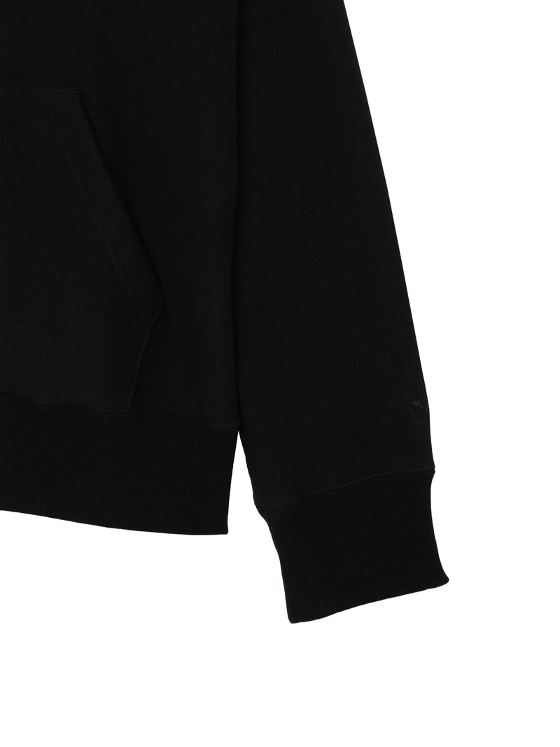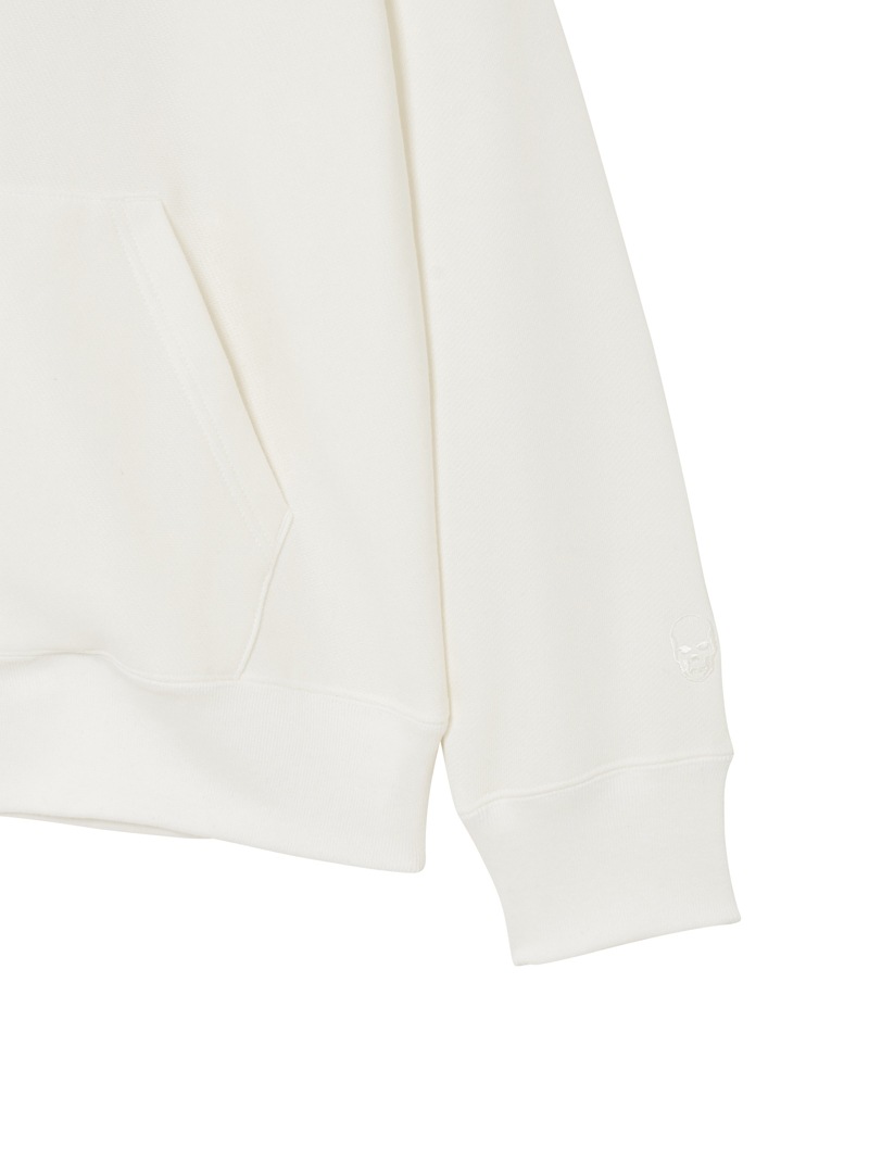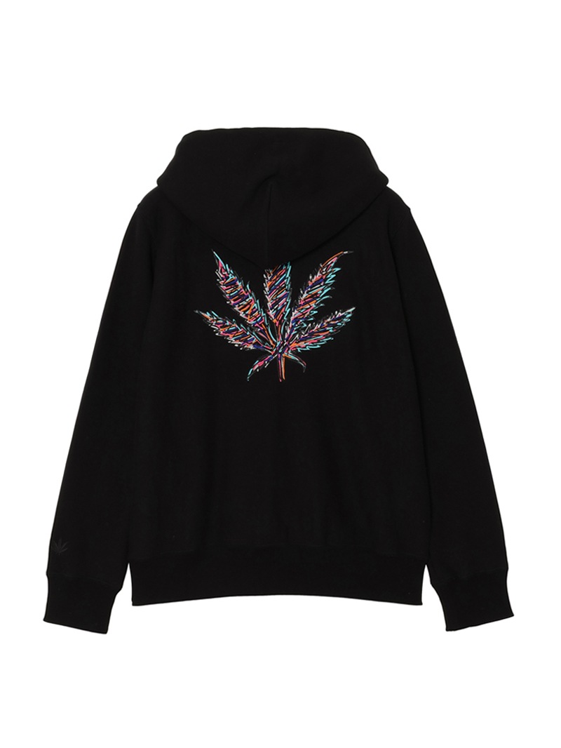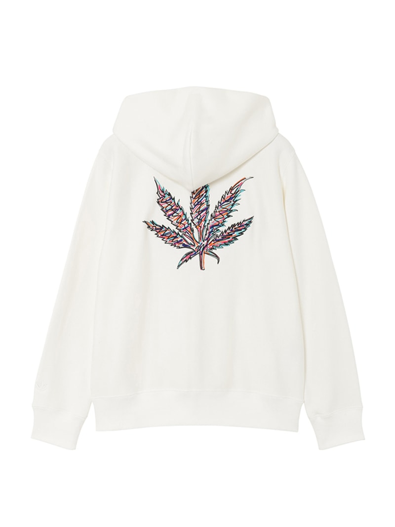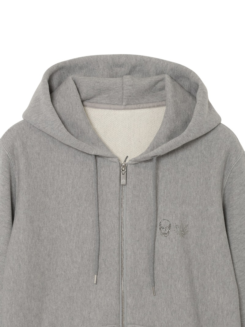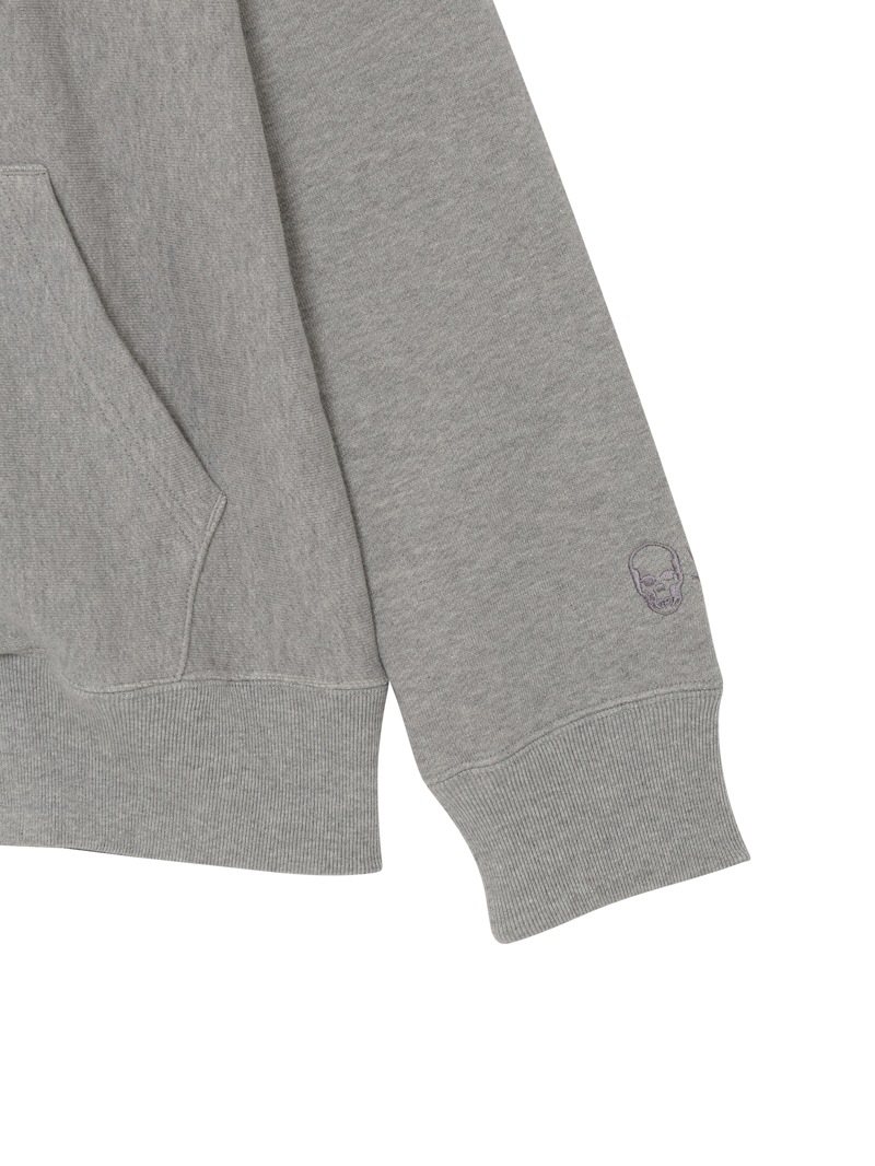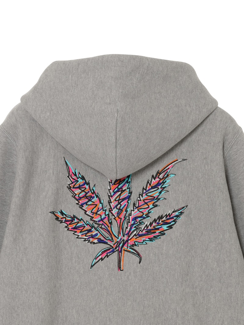 左胸にクリスタルのスカル&リーフを配置。背中にはリーフ・モチーフをプリントと刺繍で手書き風に表現したデザイン。表面にスビン混綿を使用した裏毛素材。スビン混綿を使用する事により柔らかさ+ヌメリを出している。裏面は通常単糸を使用し、双糸を使用することでハリ感を演出。仕上げは表面の毛羽を減らすバイオ加工をしている。