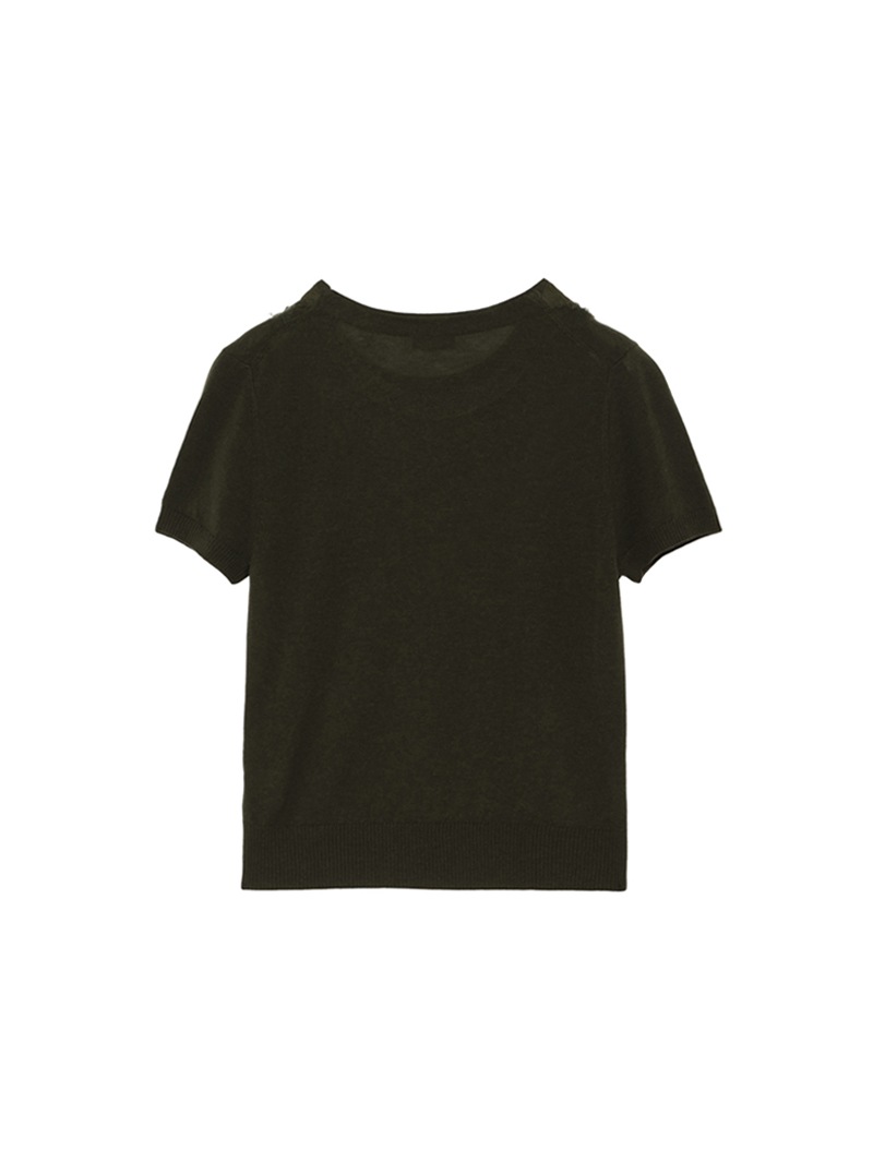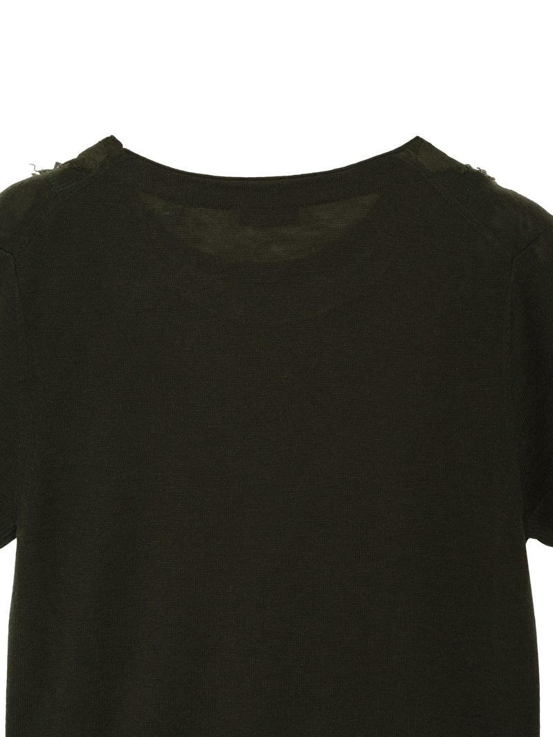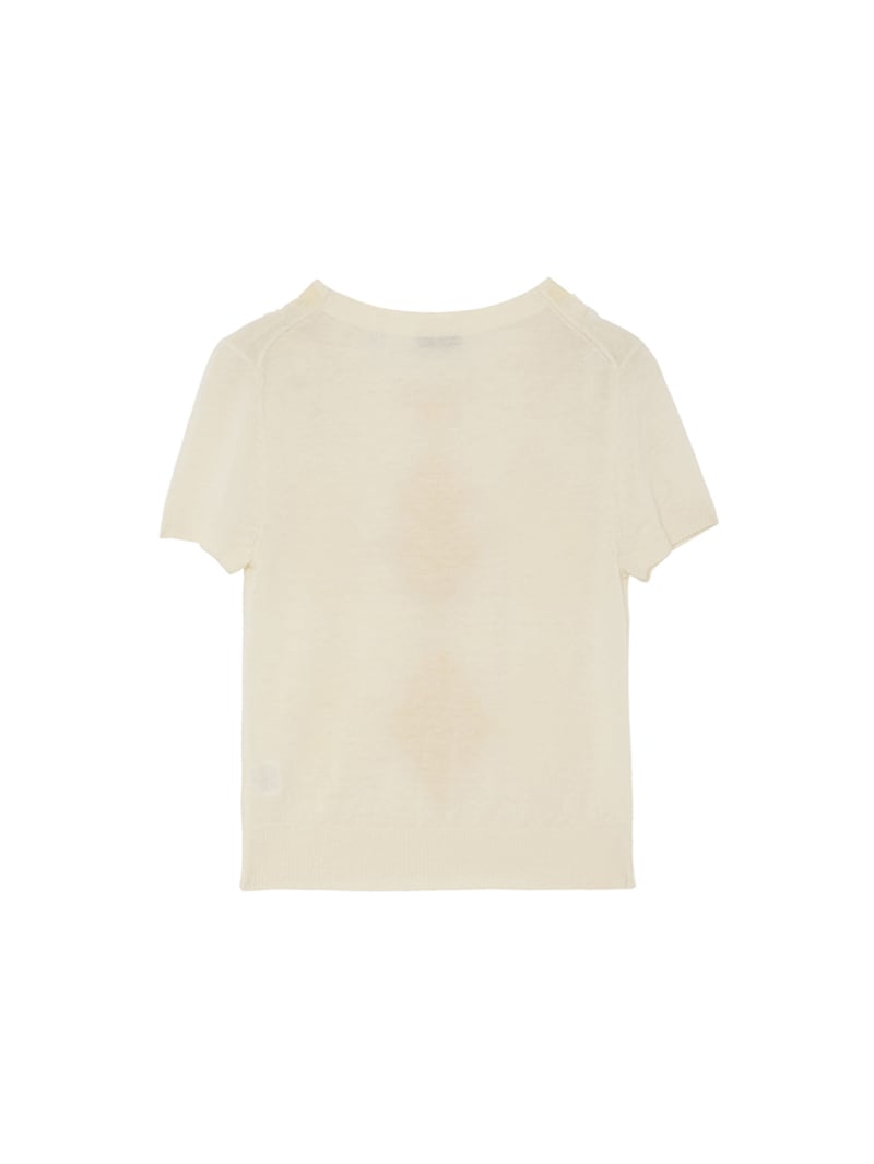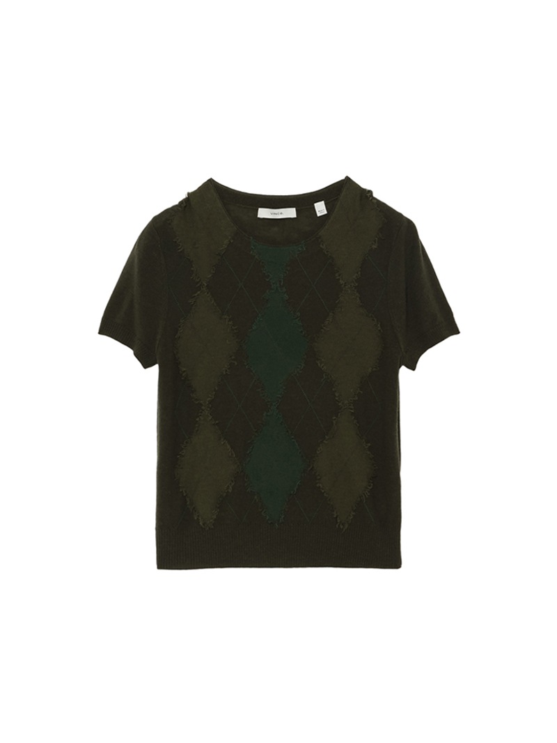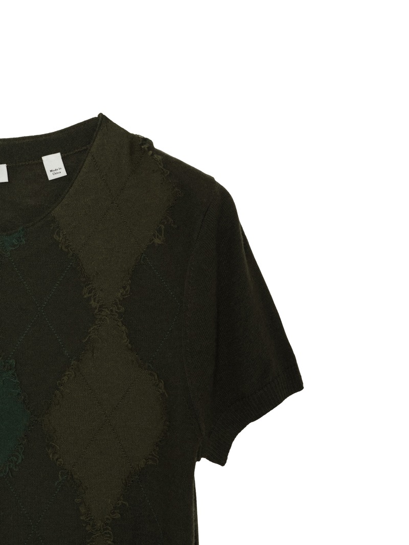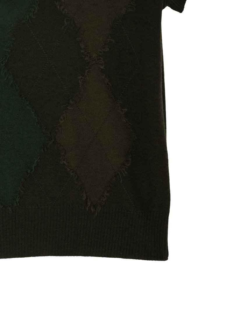 大胆なアーガイル柄をハンドカットで表現した、クラフト感あふれるショートスリーブニット。カシミヤウール混素材の柔らかな風合いと、独特な立体感のある仕上がりが魅力。落ち着きのあるトーンでまとめており、個性と品を兼ね備えた一着。同素材のカーディガンとのアンサンブルもおすすめです。