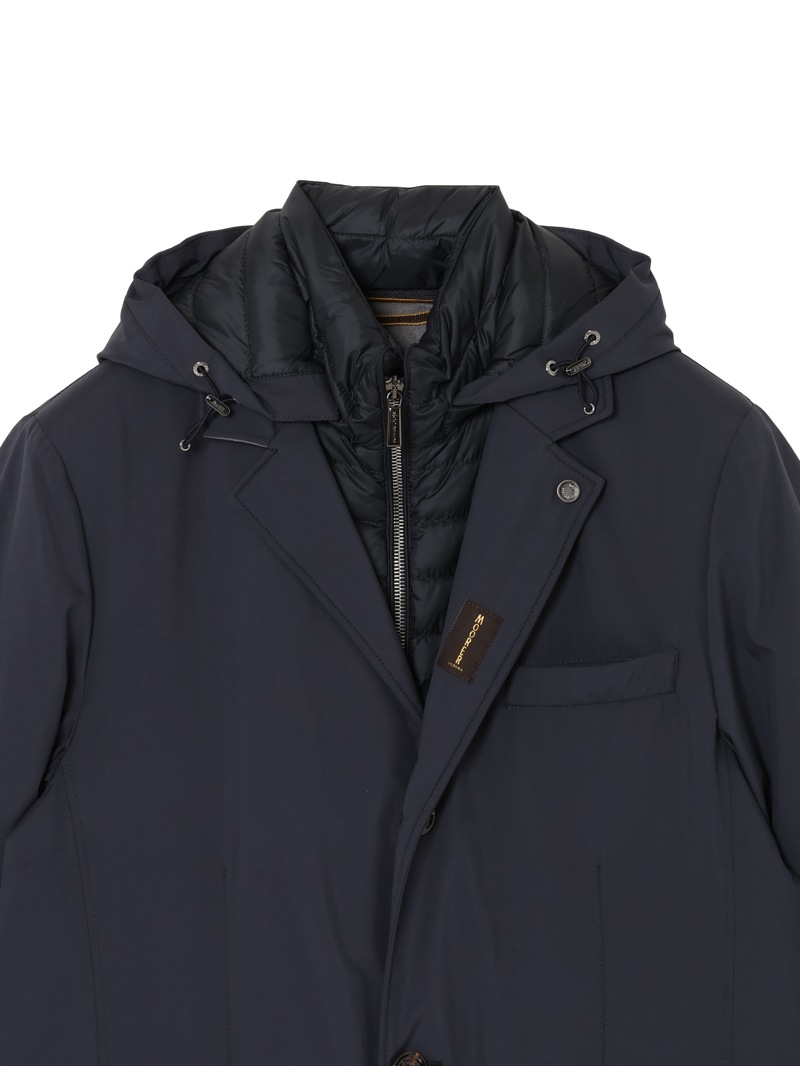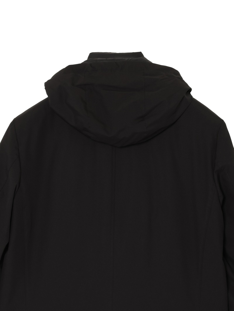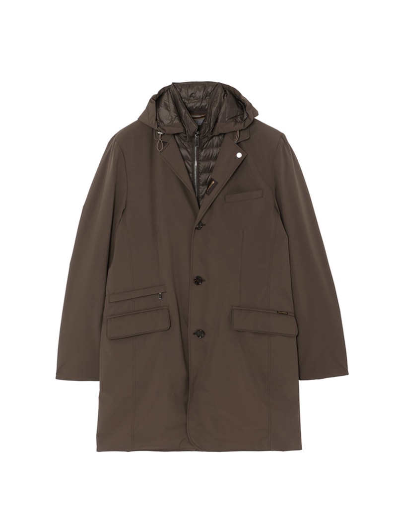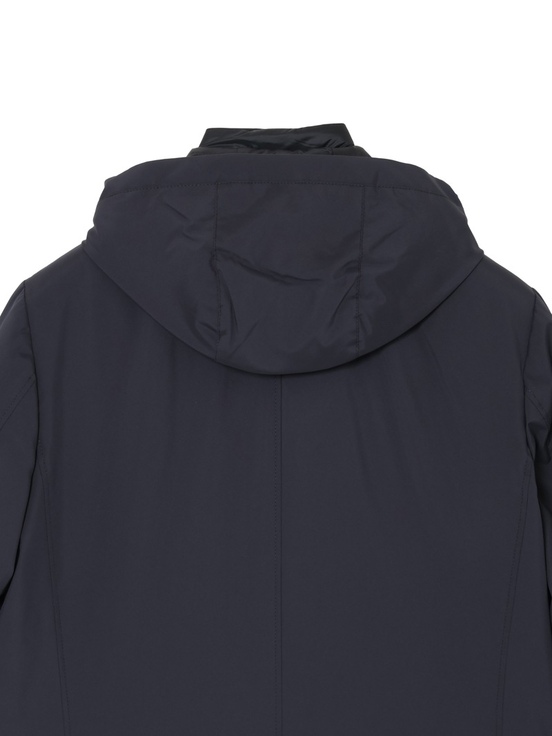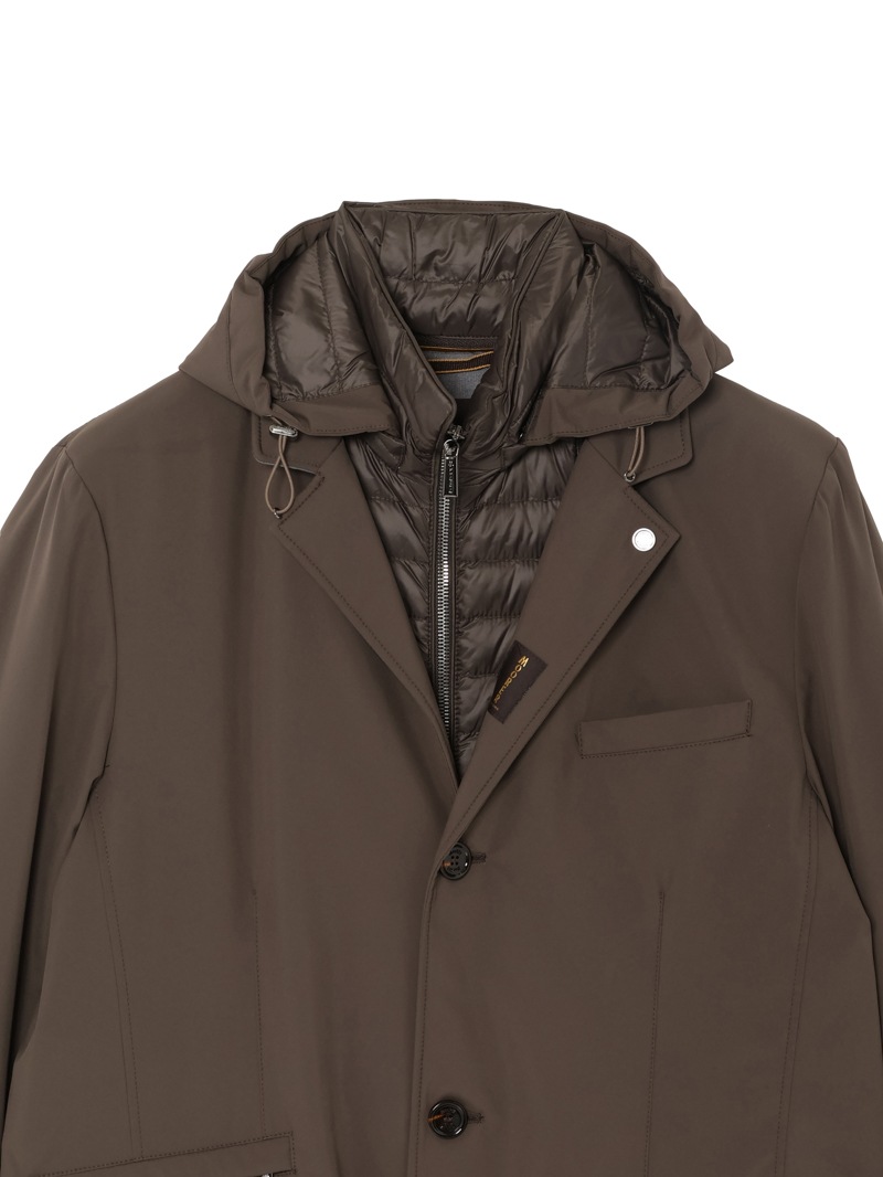 フードが付いたキルティングの内襟は、ファスナー付きの前立てがドッキングしたライナー仕様。取り外せばシンプルなテーラードカラーに様変わりし、ビジネスシーンにも活躍します。フロントはボタン開閉。バックスリットはスナップボタンで開閉可能。フラップ付きのサイドポケット、ジップ付きのウエストポケット、内ポケットを備えています。