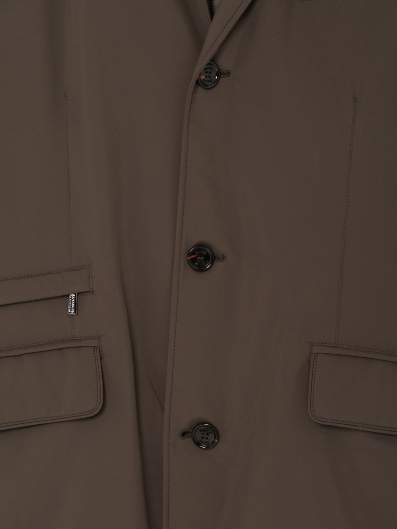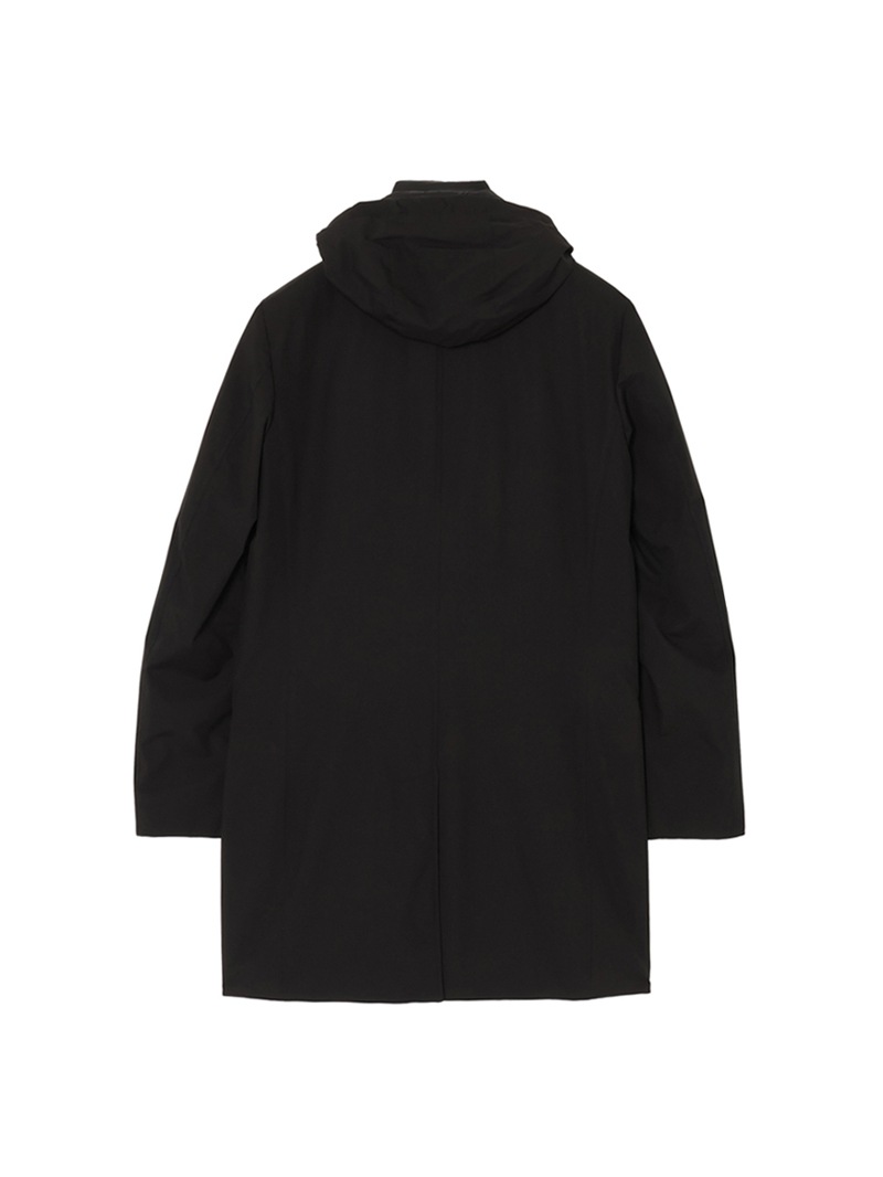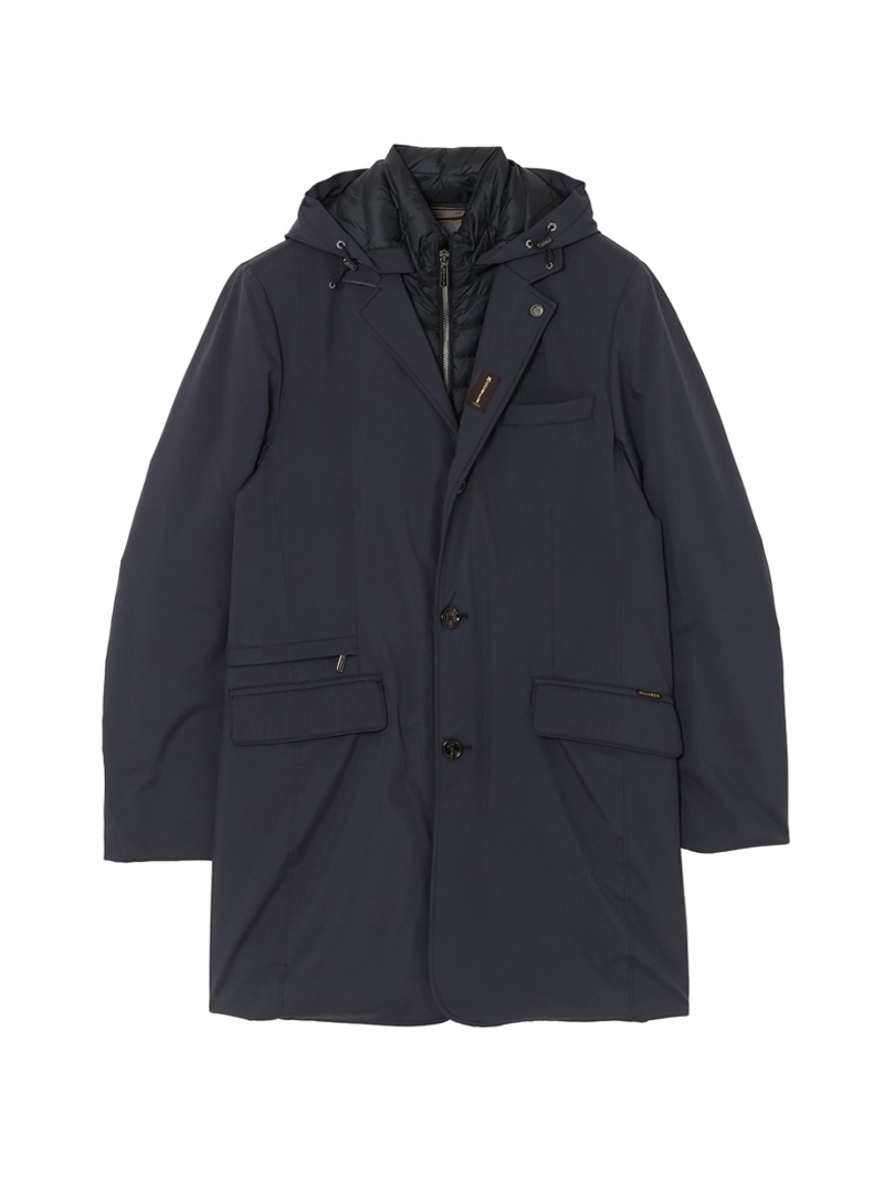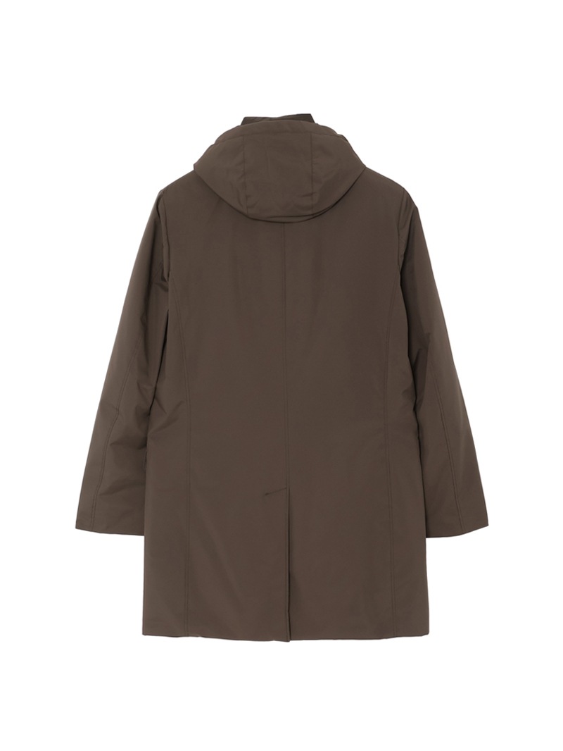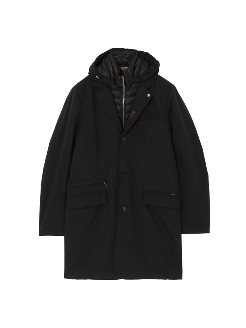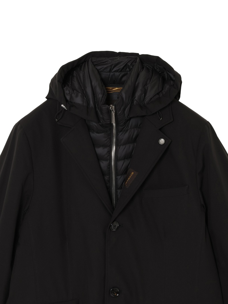 フードが付いたキルティングの内襟は、ファスナー付きの前立てがドッキングしたライナー仕様。取り外せばシンプルなテーラードカラーに様変わりし、ビジネスシーンにも活躍します。フロントはボタン開閉。バックスリットはスナップボタンで開閉可能。フラップ付きのサイドポケット、ジップ付きのウエストポケット、内ポケットを備えています。