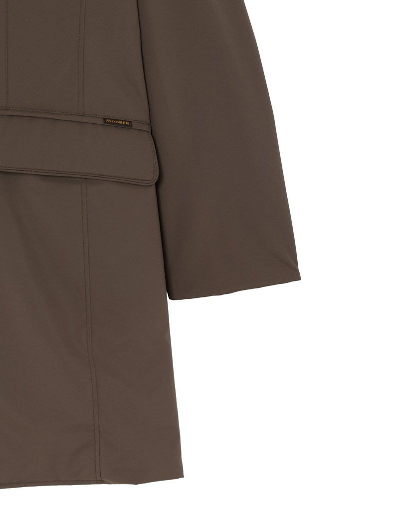 防水効果を備えたAcquaライン(耐水レベル2)のグースダウンコート。やや細身のモダンなシルエットを持つ、機能性にこだわったアイテム。超軽量・マットなテクニカルファブリックを採用し、樹脂コーティングによる撥水性と、羽毛が抜けにくいダウンプルーフ機能を備えています。