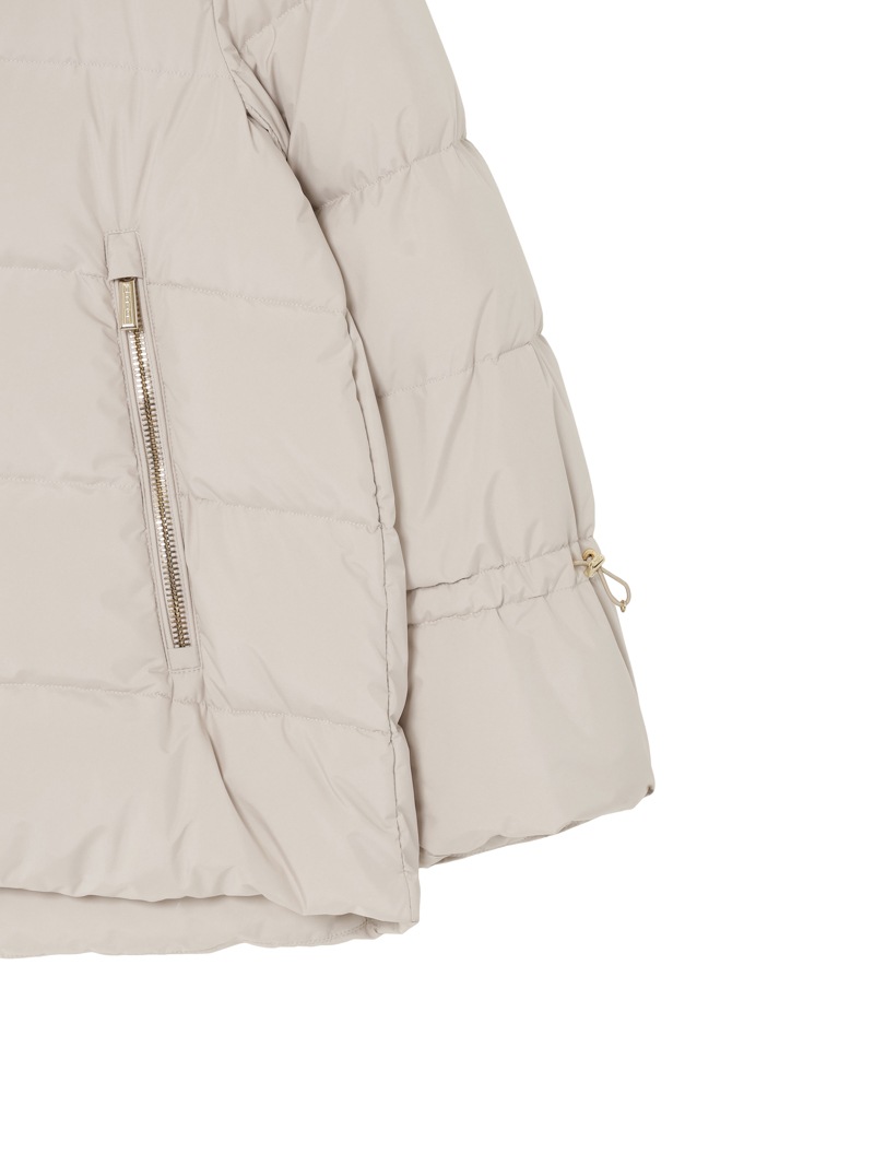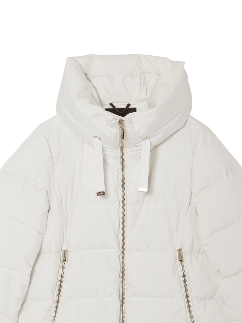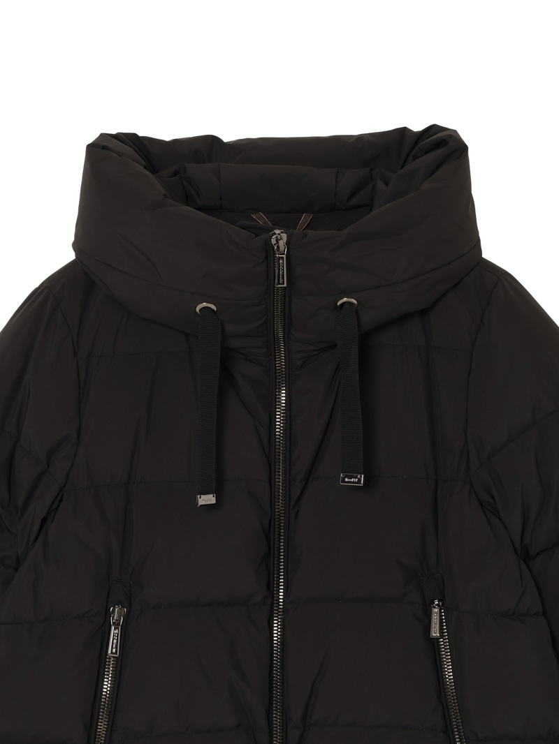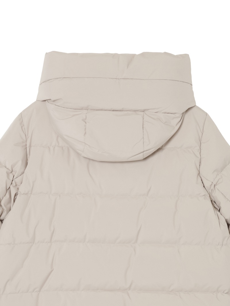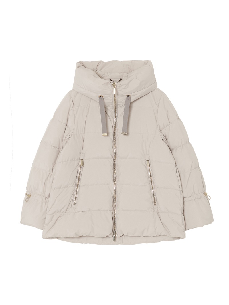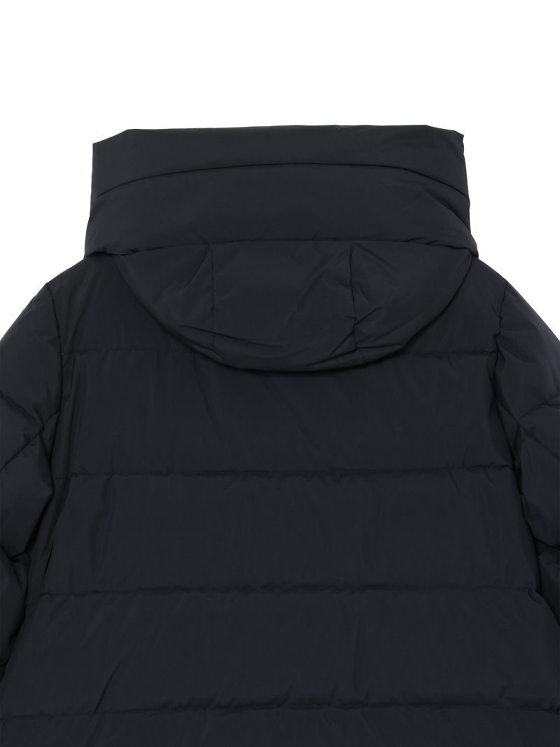 防水効果を備えたAcquaライン(耐水レベル2)のグースダウンコート。シルキーな光沢のあるテクニカルファブリックに、防水メンブレンを組み合わせ耐水性を高めています。上品なAラインシルエットは、裾と袖のドローストリングを絞ることでモダンなボンバージャケットに様変わり。幅広のキルティングと大きめのフードがポイントです。