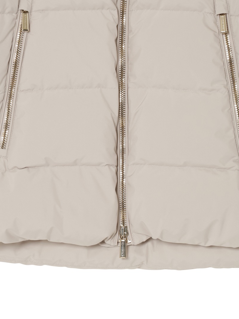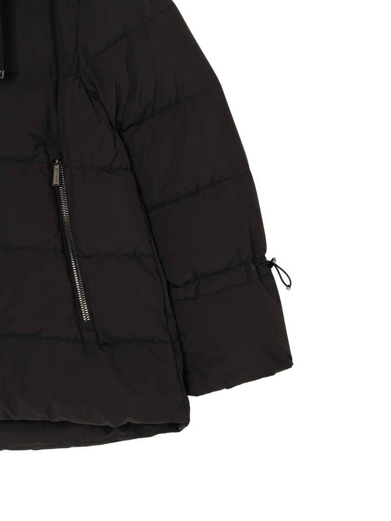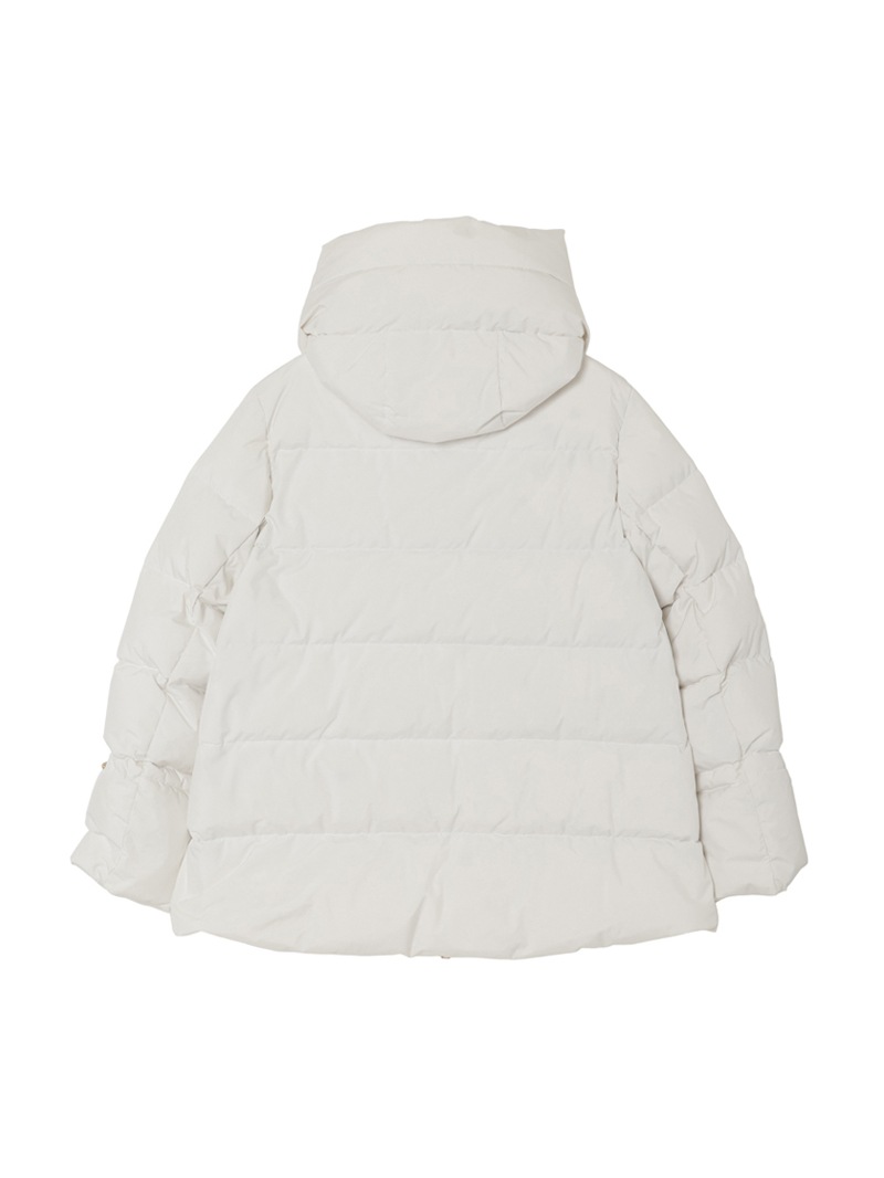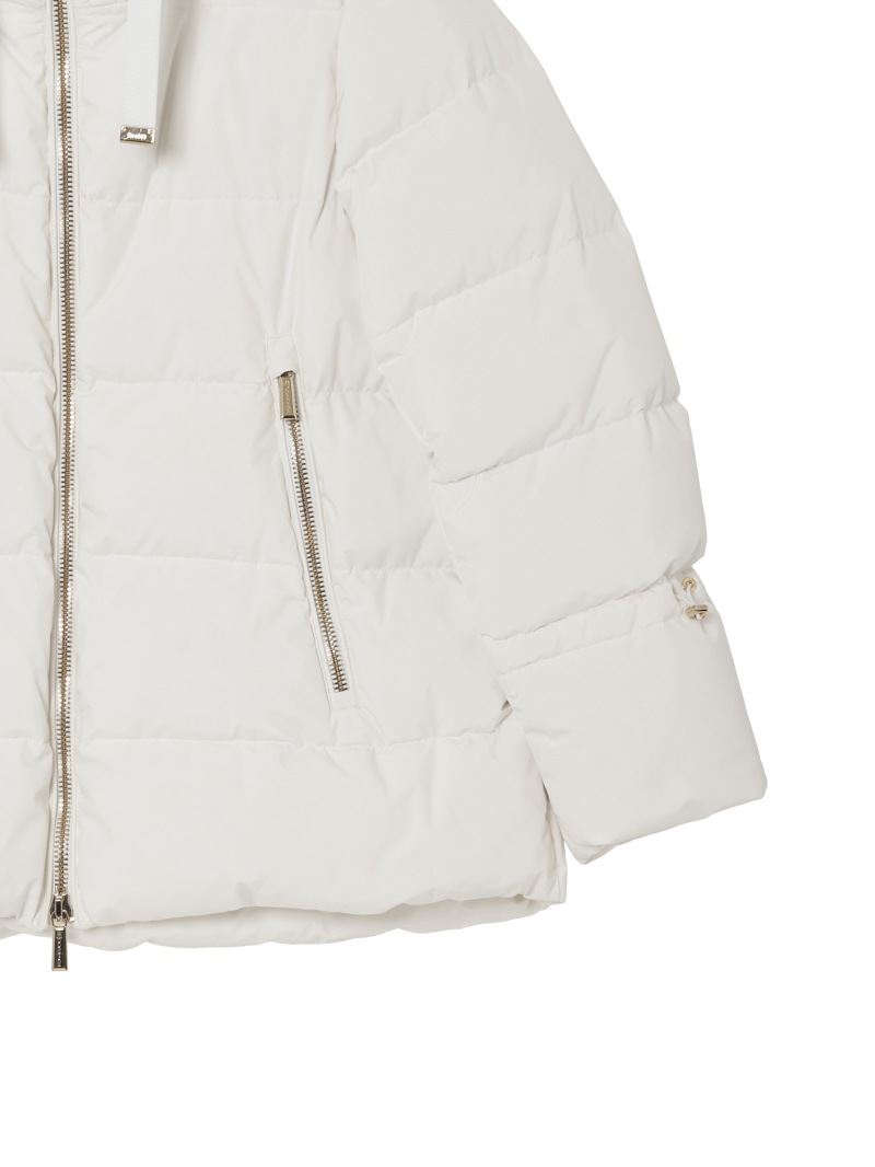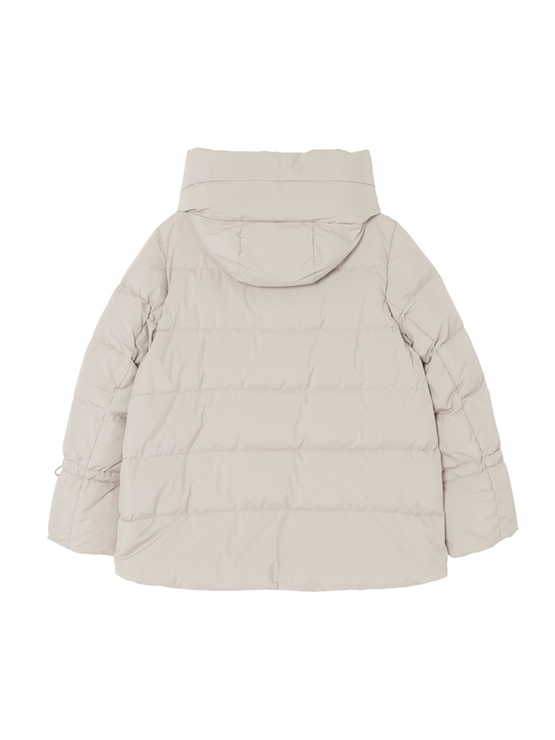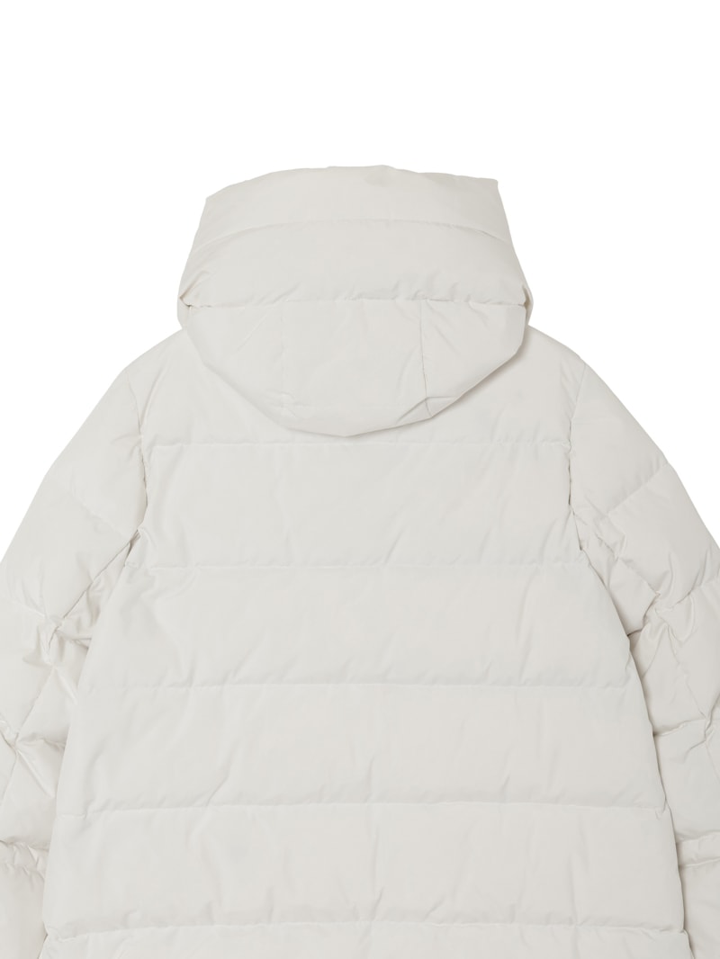 防水効果を備えたAcquaライン(耐水レベル2)のグースダウンコート。シルキーな光沢のあるテクニカルファブリックに、防水メンブレンを組み合わせ耐水性を高めています。上品なAラインシルエットは、裾と袖のドローストリングを絞ることでモダンなボンバージャケットに様変わり。幅広のキルティングと大きめのフードがポイントです。