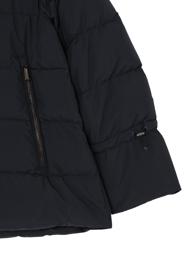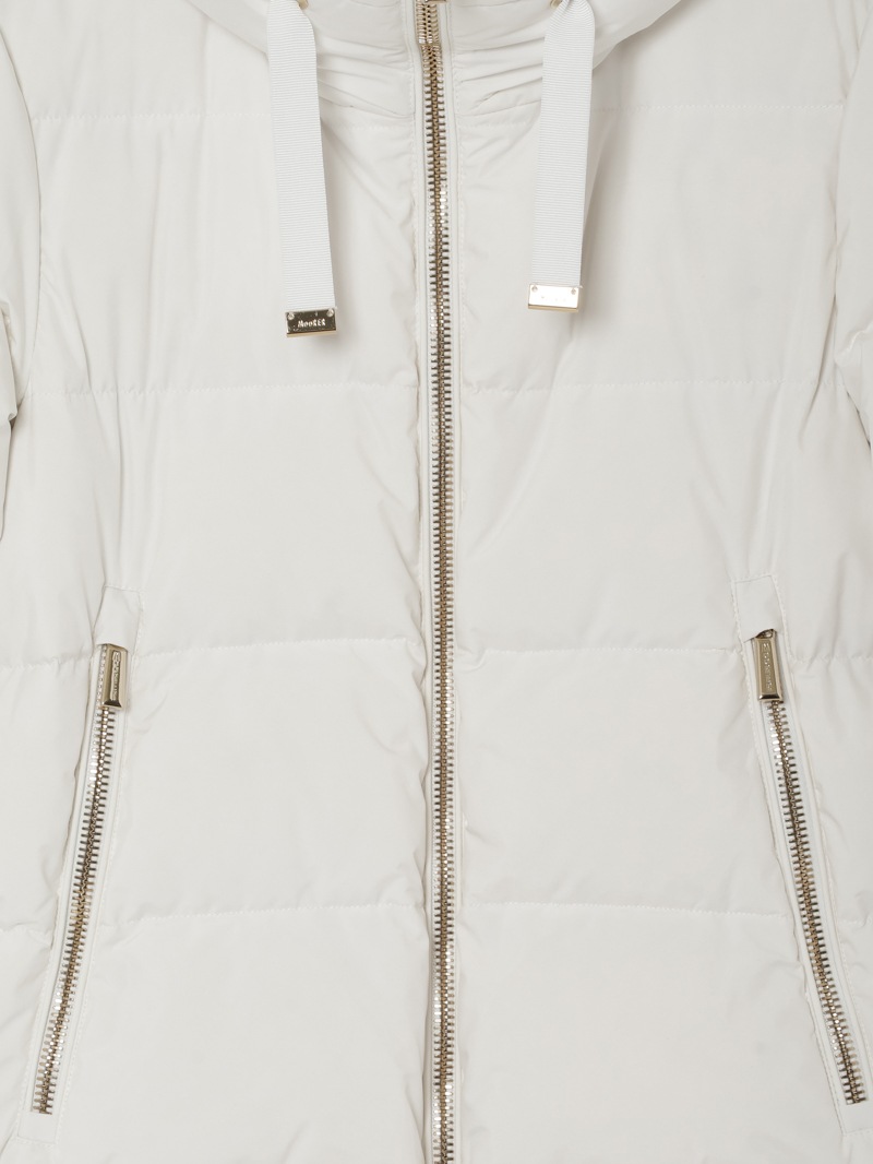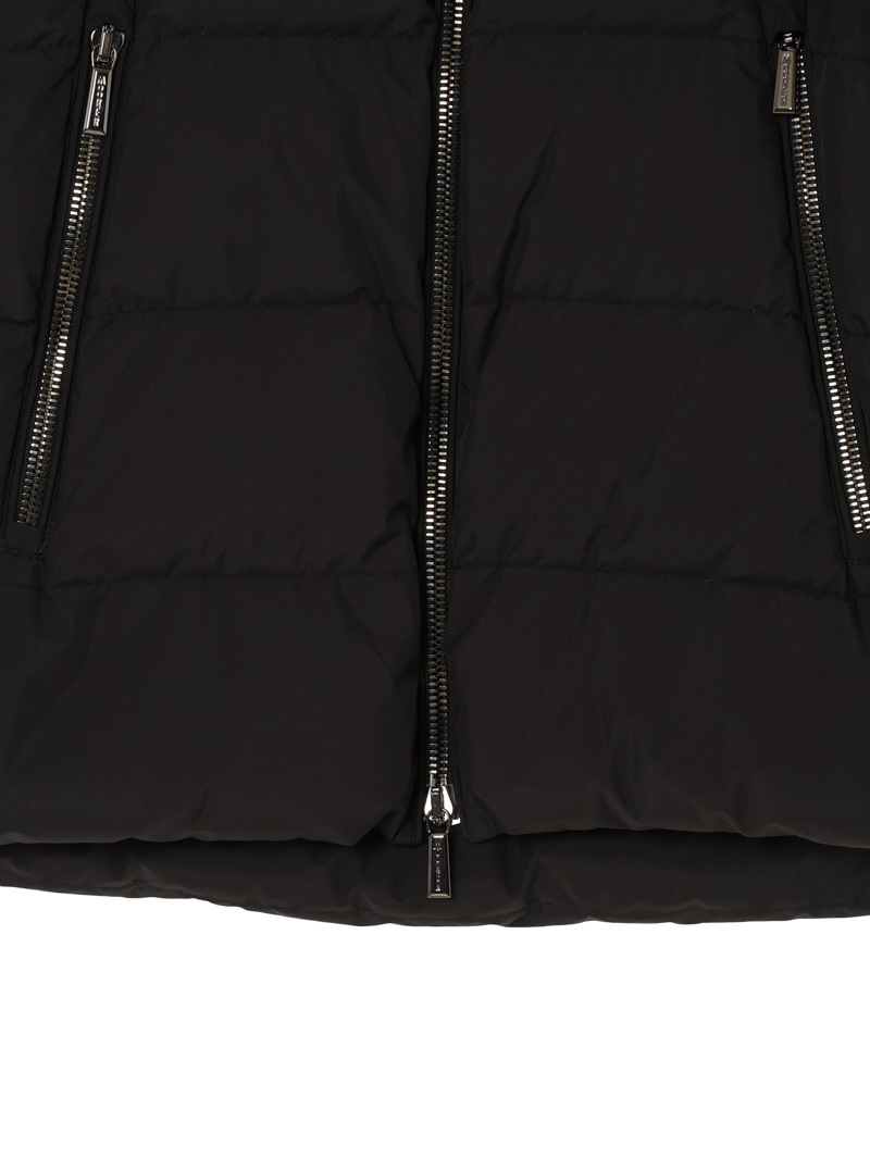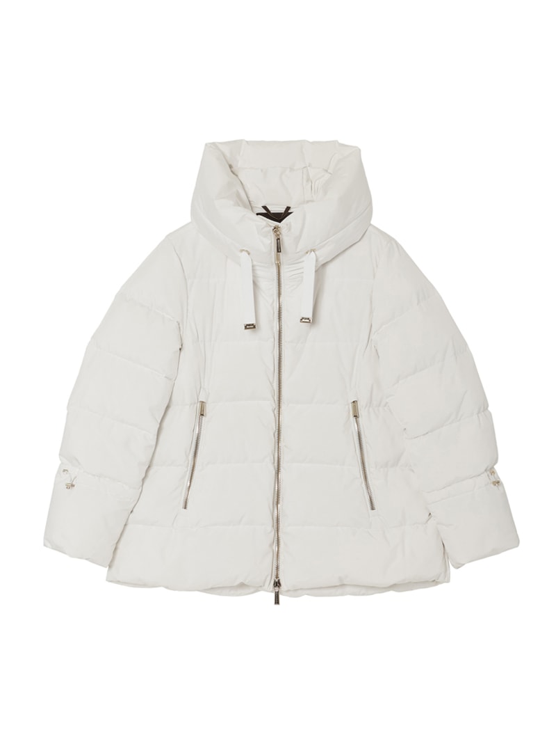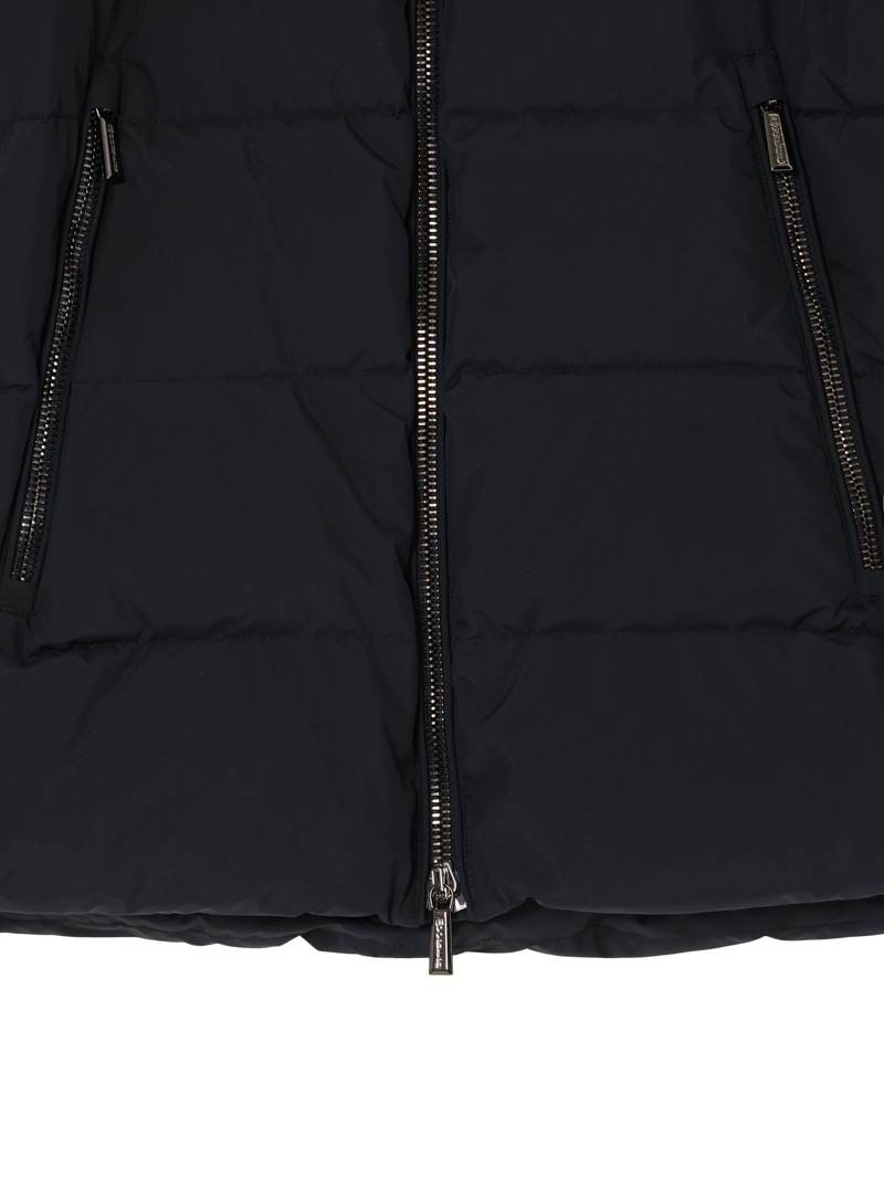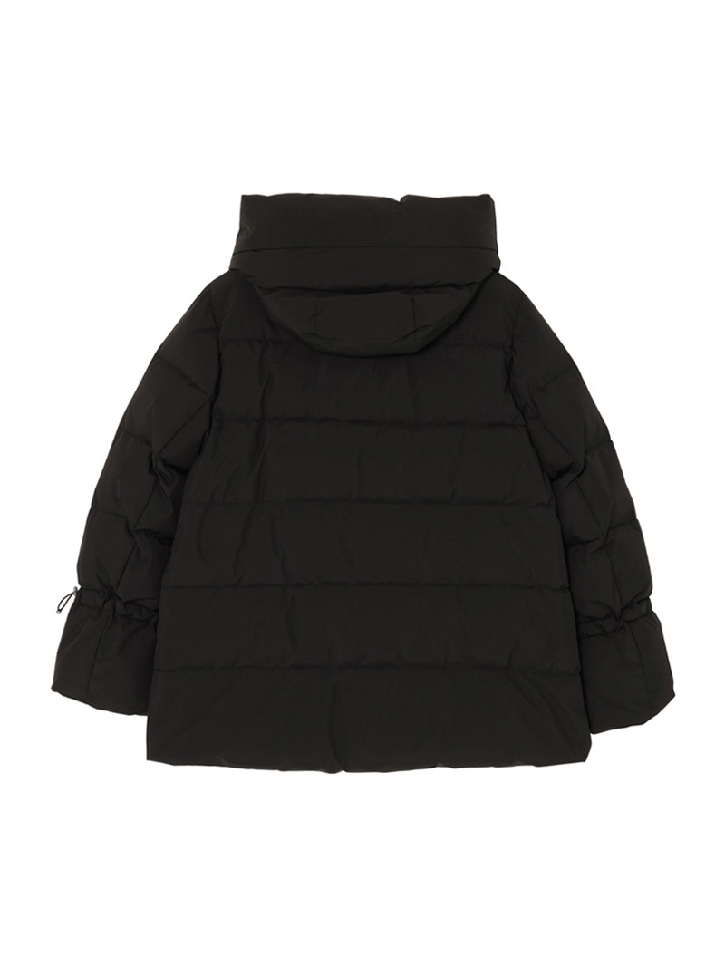 防水効果を備えたAcquaライン(耐水レベル2)のグースダウンコート。シルキーな光沢のあるテクニカルファブリックに、防水メンブレンを組み合わせ耐水性を高めています。上品なAラインシルエットは、裾と袖のドローストリングを絞ることでモダンなボンバージャケットに様変わり。幅広のキルティングと大きめのフードがポイントです。