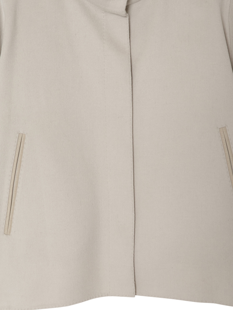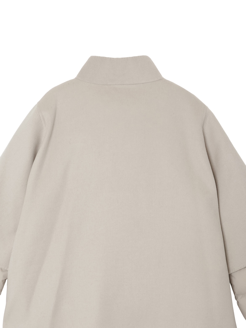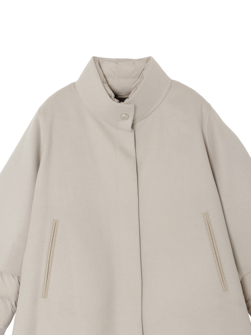 暖かなアウターケープとダウンジャケットがレイヤードされたショートアウター。エレガントでリッチな風合いのアウターケープは、ウールカシミヤ混紡のダブルフェイス生地を使用。サイドポケットは、手触り・耐久性に優れた高級フェイクスエード素材のアルカンターラ?で縁取られています。フロントはスナップボタン開閉。