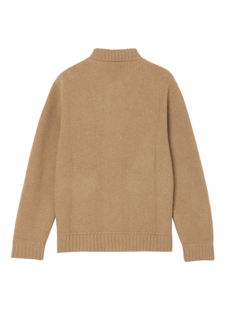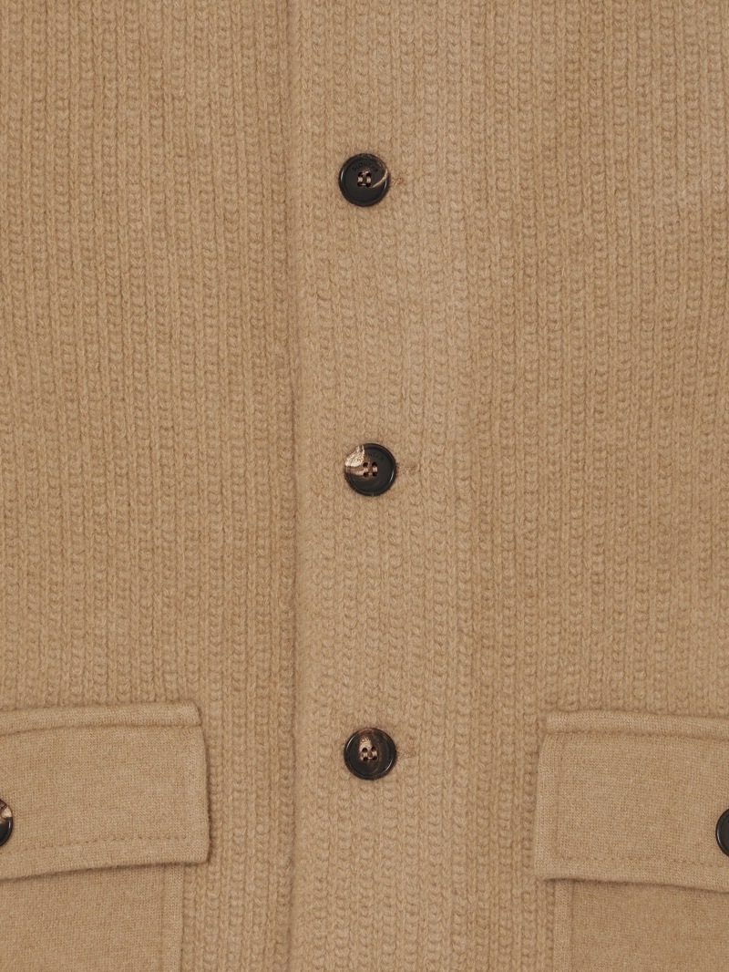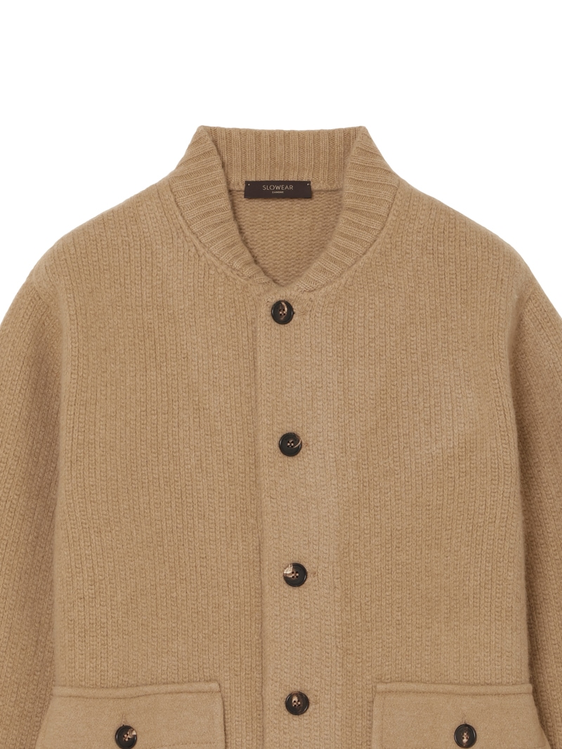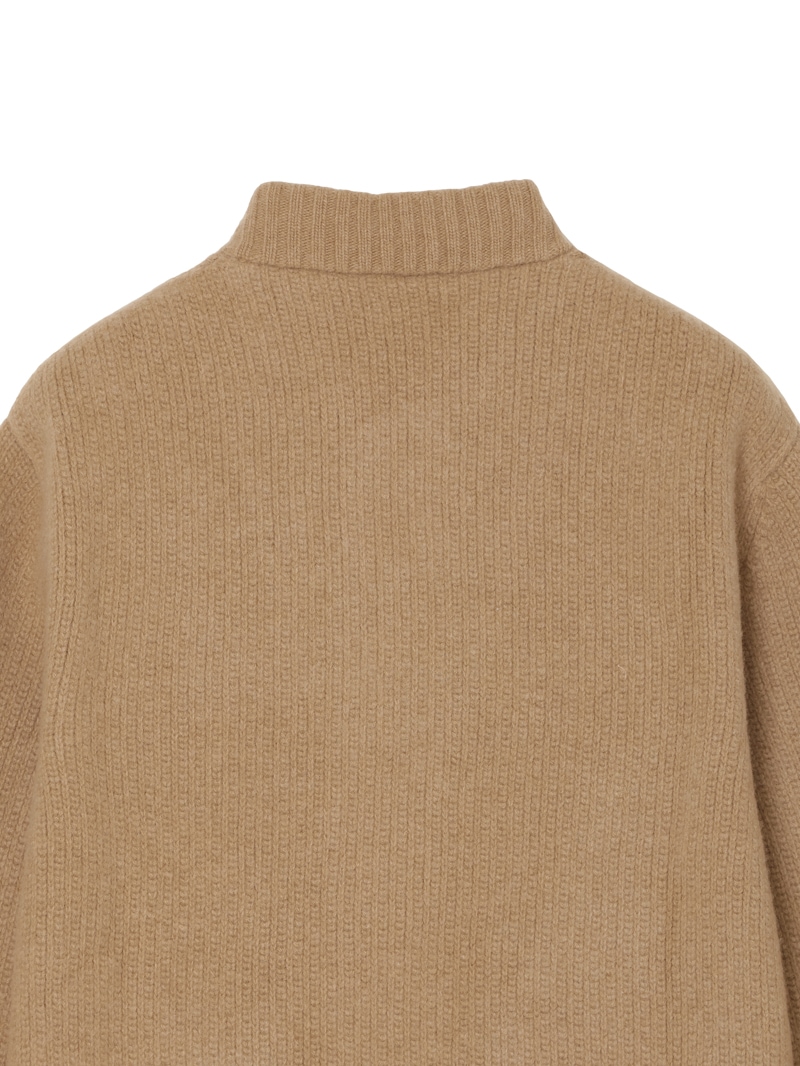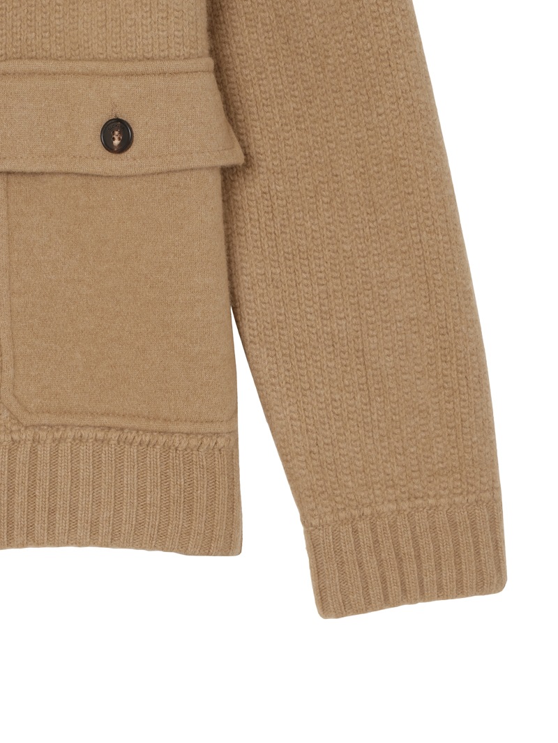 ウールカシミヤ素材に縮絨加工を施した、温かみのあるニットブルゾン。編地を変えたウエストのパッチポケットや、リブ編みのディテールがアクセントに。5ゲージで秋口から冬場のアウターとしてもお使いいただける一着。