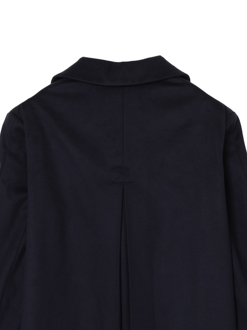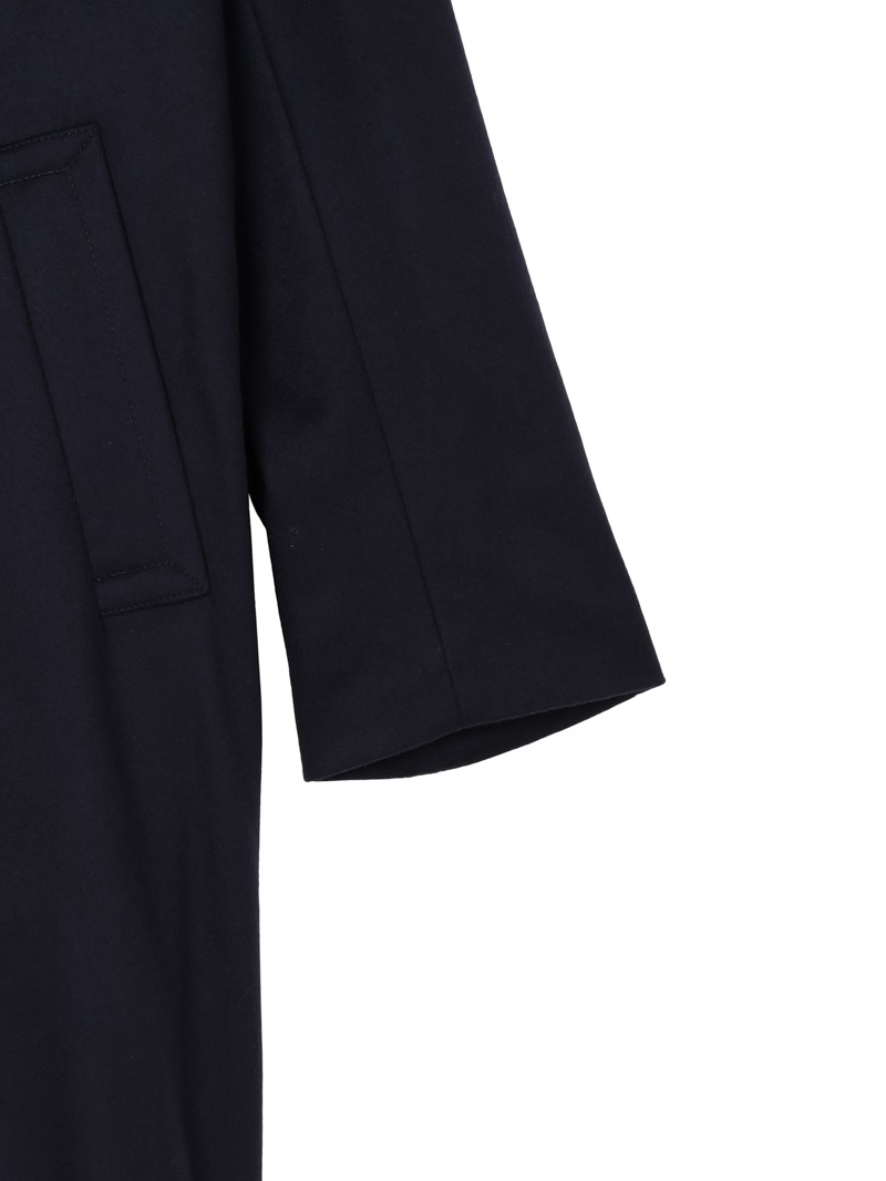 SLOWEAR MONTEDOROからご紹介するウールメルトン素材のロングコート。ヒザあたりまでのロング丈で、ビジネスシーンはもちろんのこと、モックネックニット、タートルネックニットなどとコーディネートしたカジュアルな着こなしも可能。背面には動きを妨げず、かつ生地に綺麗なドレープを生むインパ―テッドプリーツ入り。