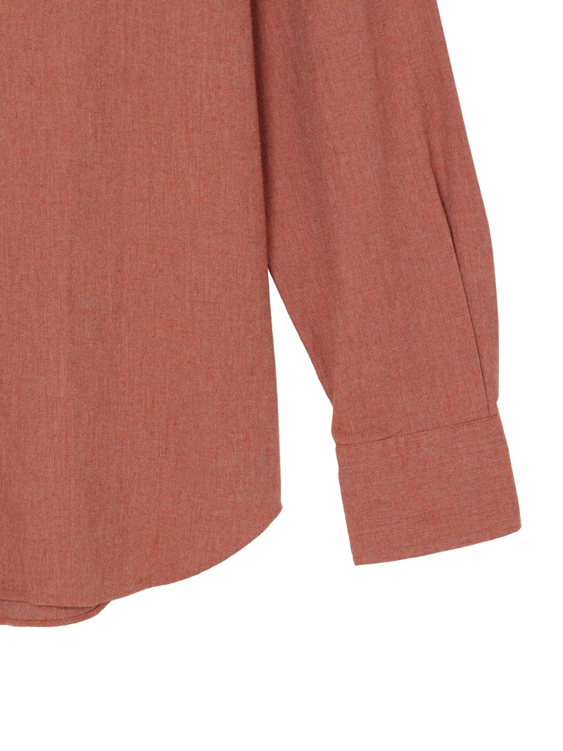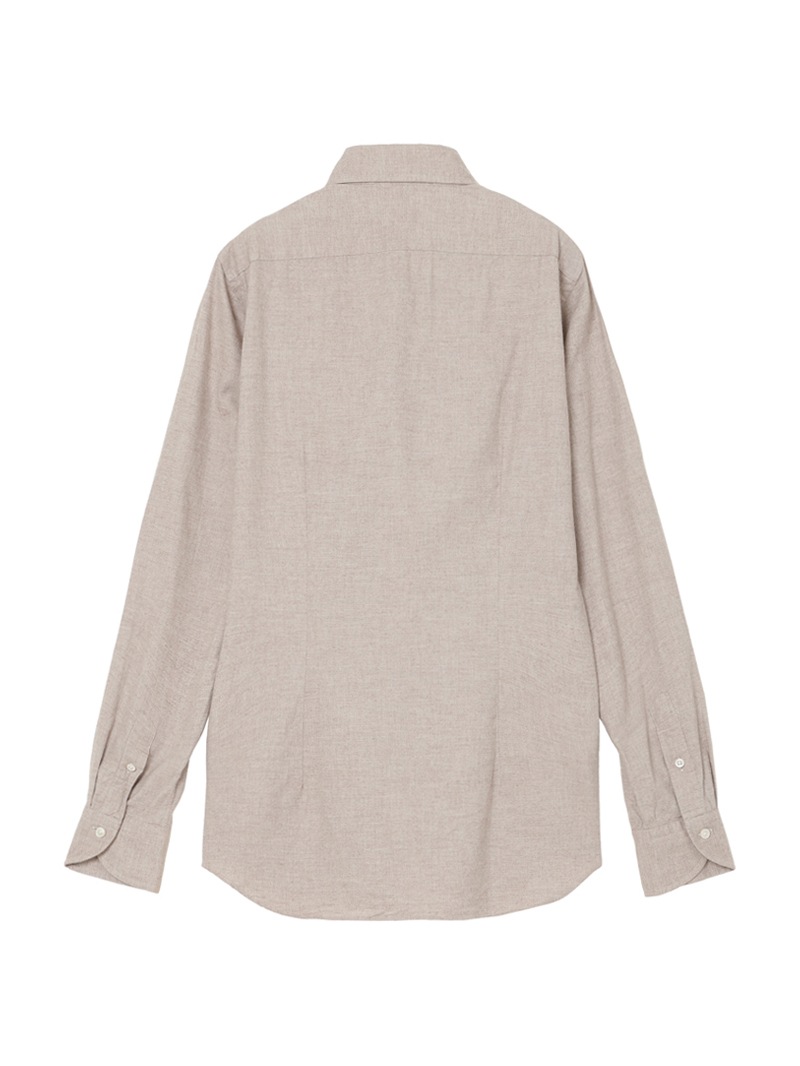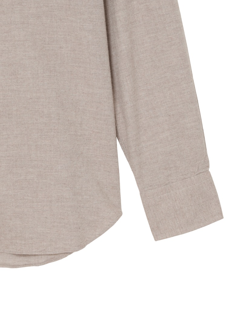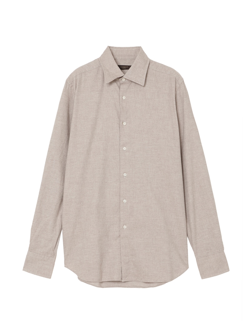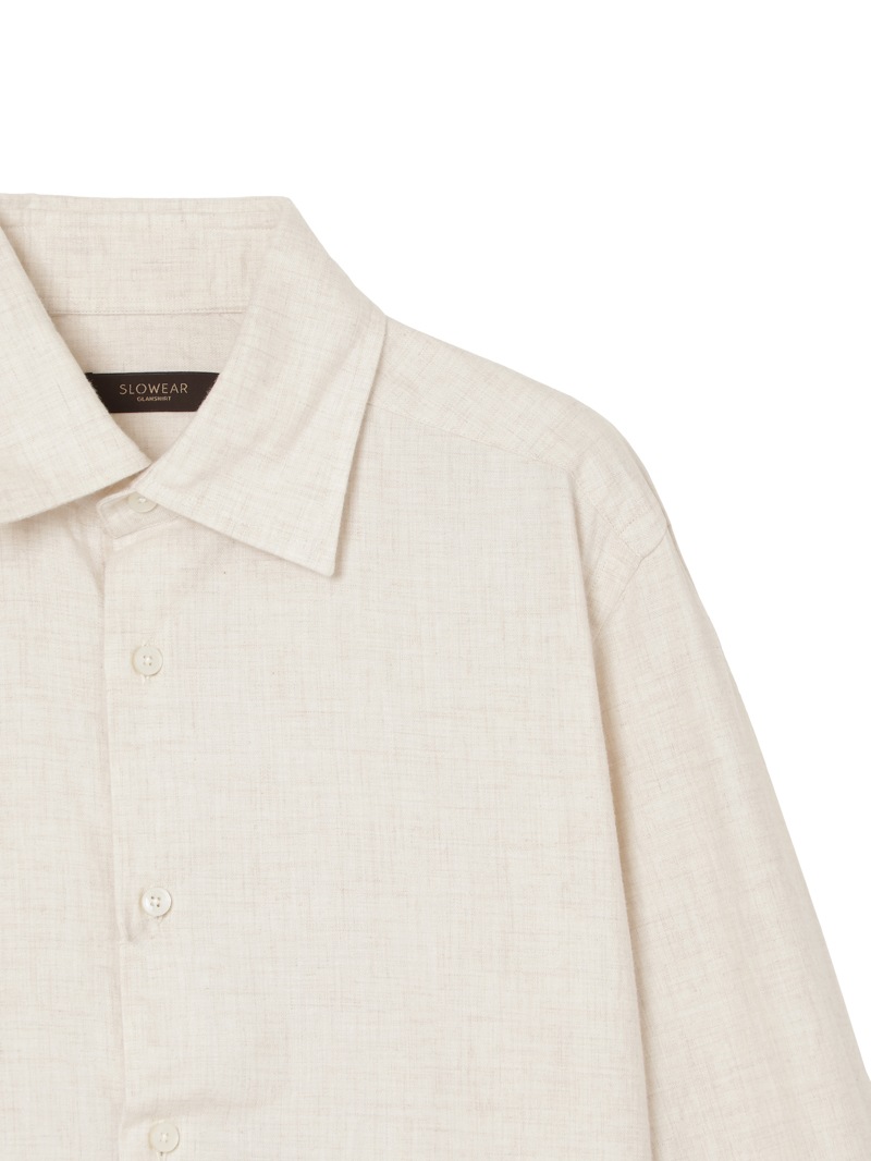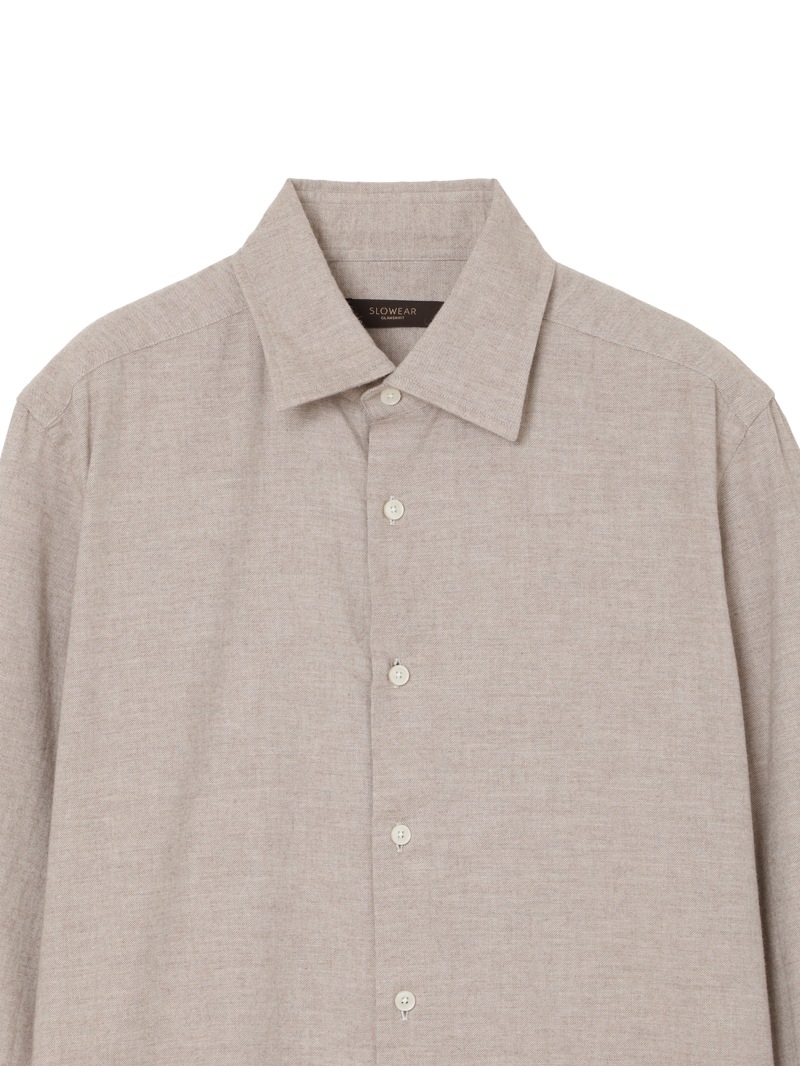 SLOWEAR GLANSHIRTの中でも長年定番として展開しているレギュラーフィットモデル“FABRIZIO”。レギュラーフィットでありながらもダブつきの少ない背ダーツ、ややロングポイントのセミワイドの襟型に、パンツインできる長めの着丈設定。メランジのコットンフランネル生地は暖かく柔らかな肌触りが特徴。