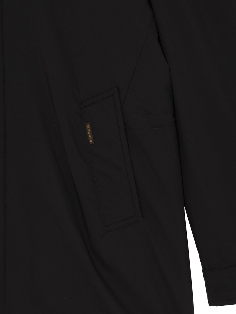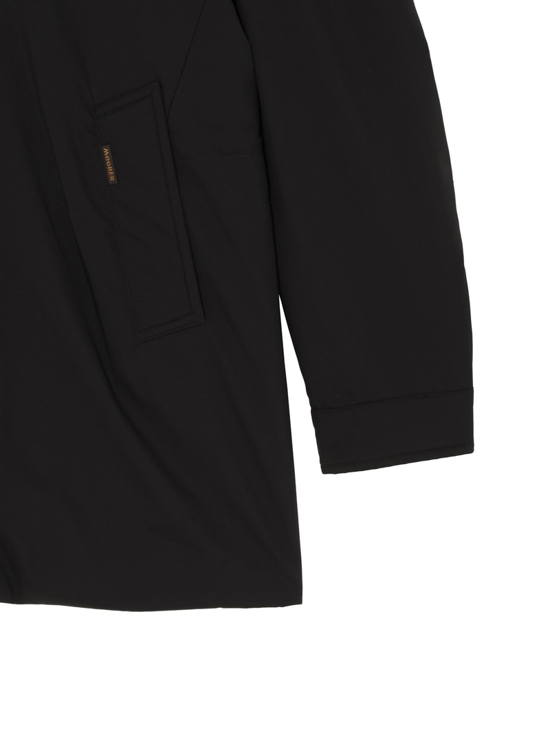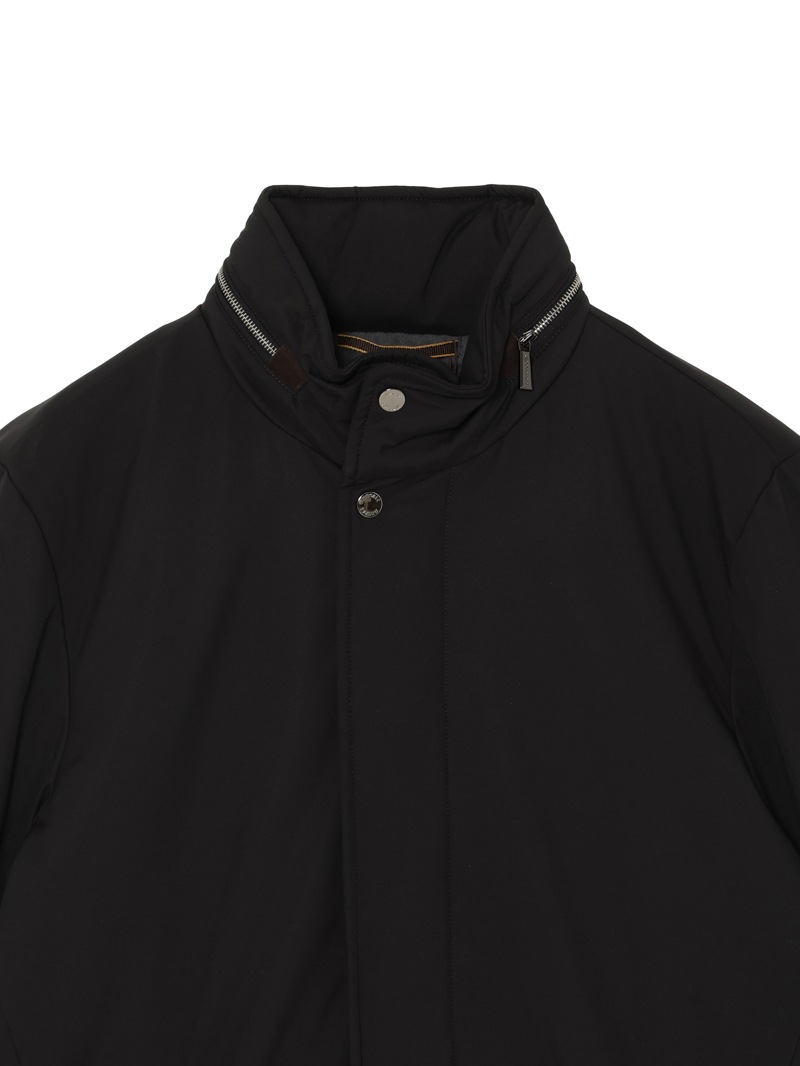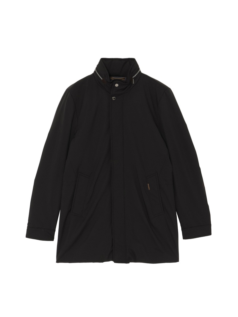耐水効果を備えたAcquaライン(耐水レベル2)のグースダウンオーバーコート。樹脂コーティングによる撥水加工、毛羽が出にくいダウンプルーフ加工を施した、超軽量・マットなテクニカルファブリック製。内部はキルティングで仕上げています。襟のファスナーにはフードが収納されており、スタイルや気候に合わせて変化を楽しめます。