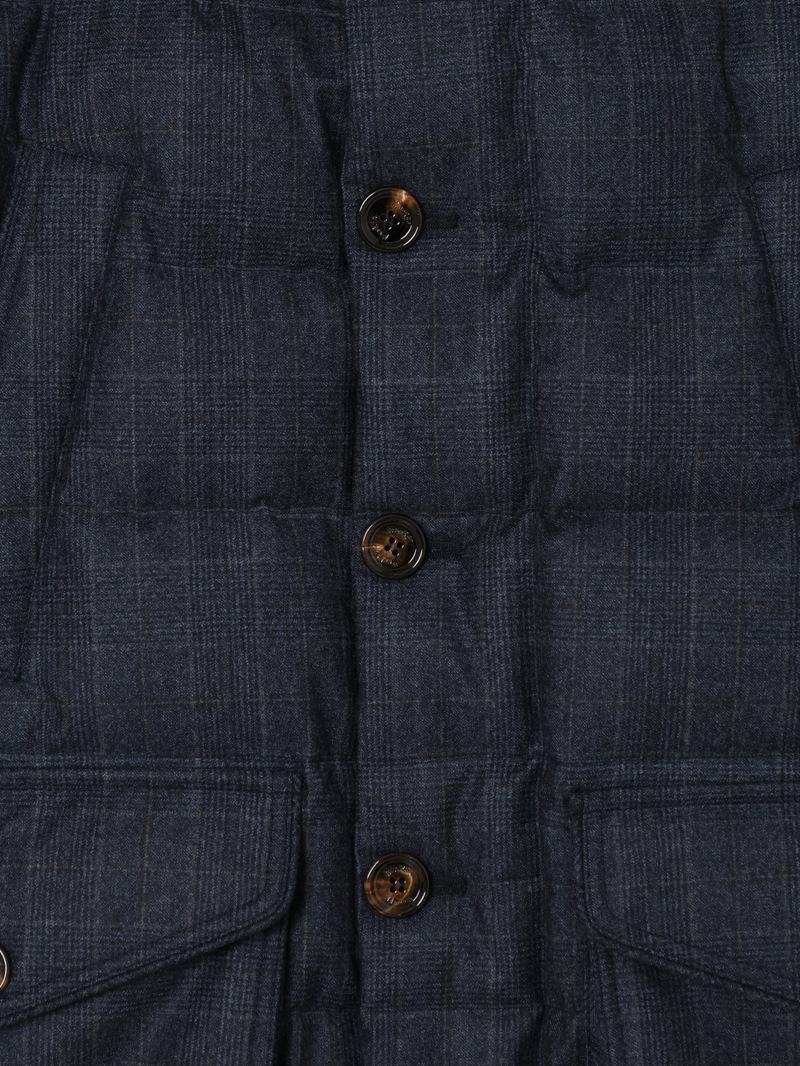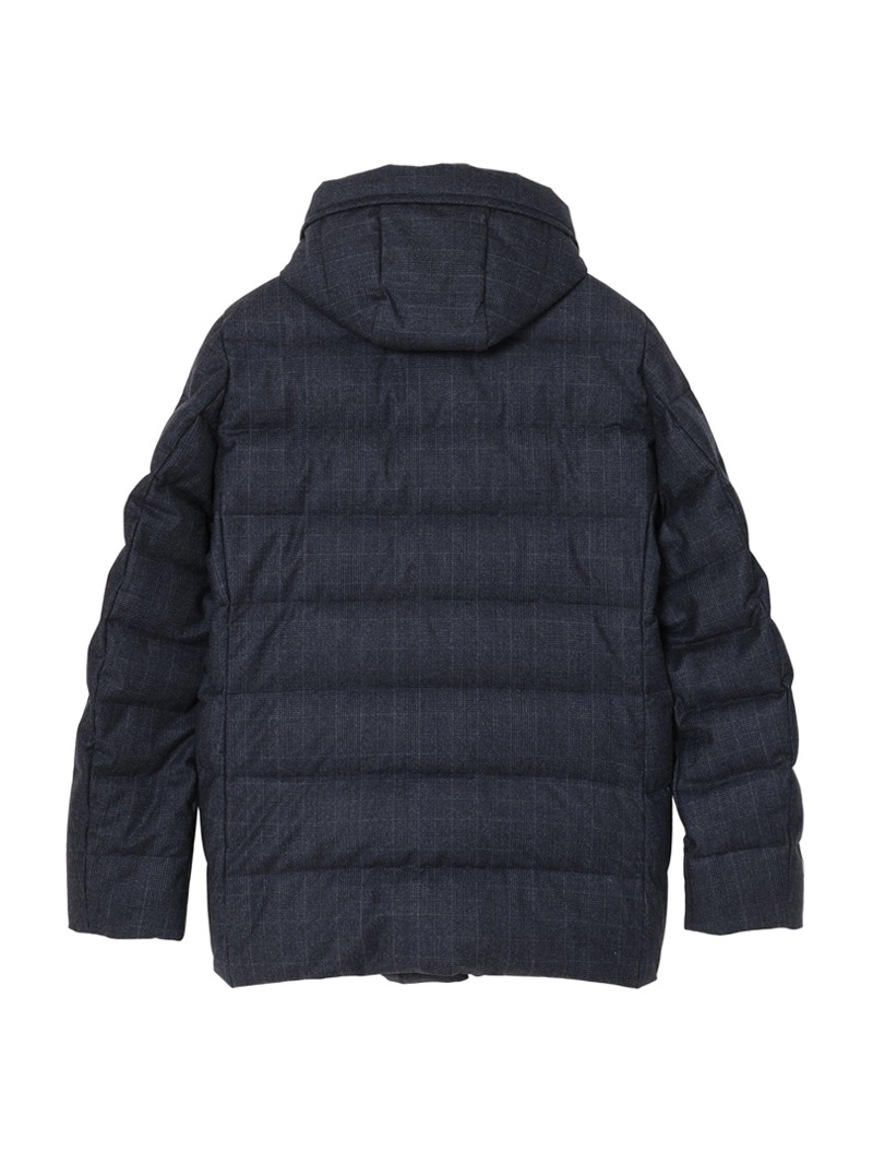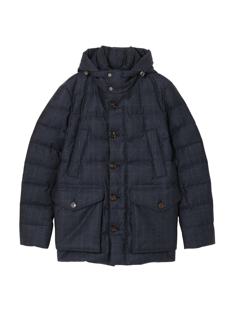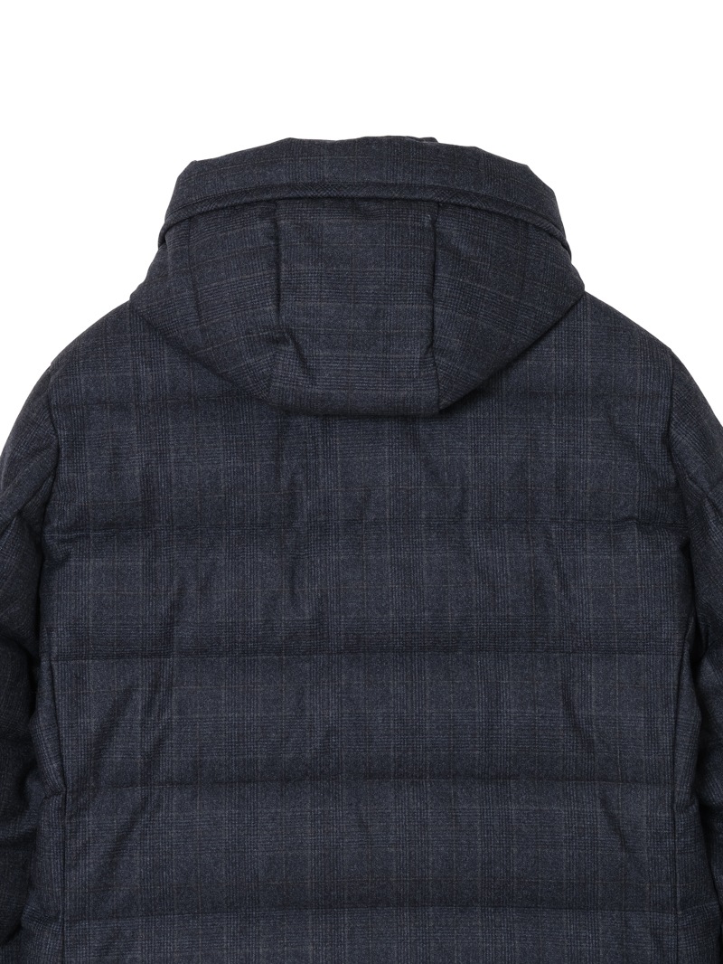 耐水効果を備えたAcquaライン(耐水レベル2)より、スリムフィットのグースダウンパーカー。ミドル丈の“FAGIO”を、チェック柄のSuper100's ウールサキソニー素材で仕上げた特別なアイテム。ビジネススーツやフォーマルウェアに使われるSuper100'sは、極細番手のメリノウール糸を使用した、柔らかくしなやかで上品なツヤのある高品質ファブリックです。