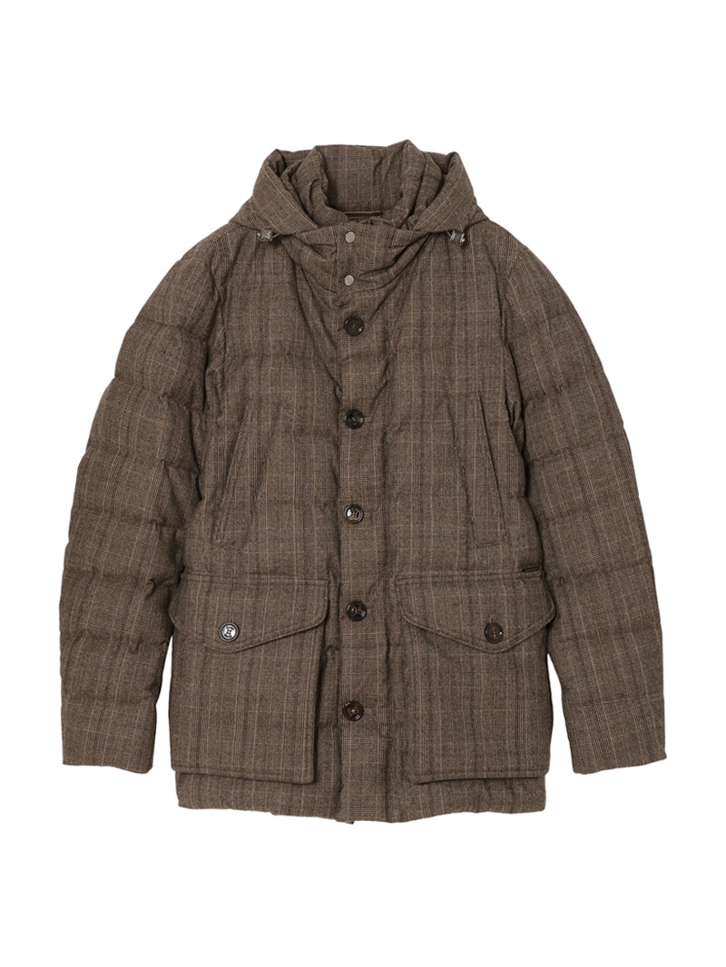 耐水効果を備えたAcquaライン(耐水レベル2)より、スリムフィットのグースダウンパーカー。ミドル丈の“FAGIO”を、チェック柄のSuper100's ウールサキソニー素材で仕上げた特別なアイテム。ビジネススーツやフォーマルウェアに使われるSuper100'sは、極細番手のメリノウール糸を使用した、柔らかくしなやかで上品なツヤのある高品質ファブリックです。