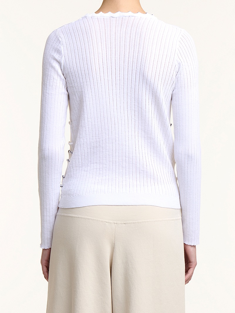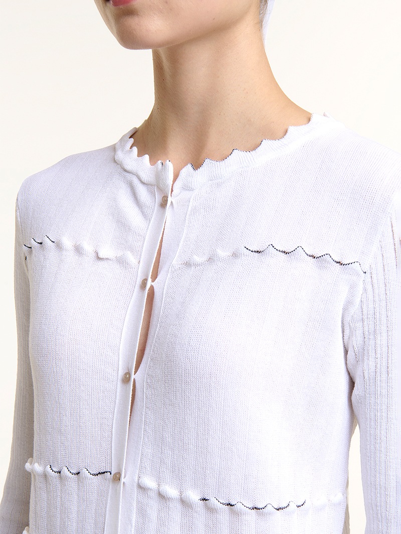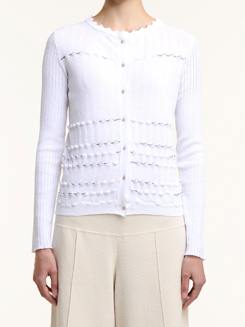 上質なコットンブレンドの柔らかな風合いとフリルのディテールが印象的なフェミニンカーディガン。コンパクトなシルエットで日常の装いにラグジュアリーな高揚感をプラス。洗練された大人の女性にふさわしいクラス感あふれる一着です。