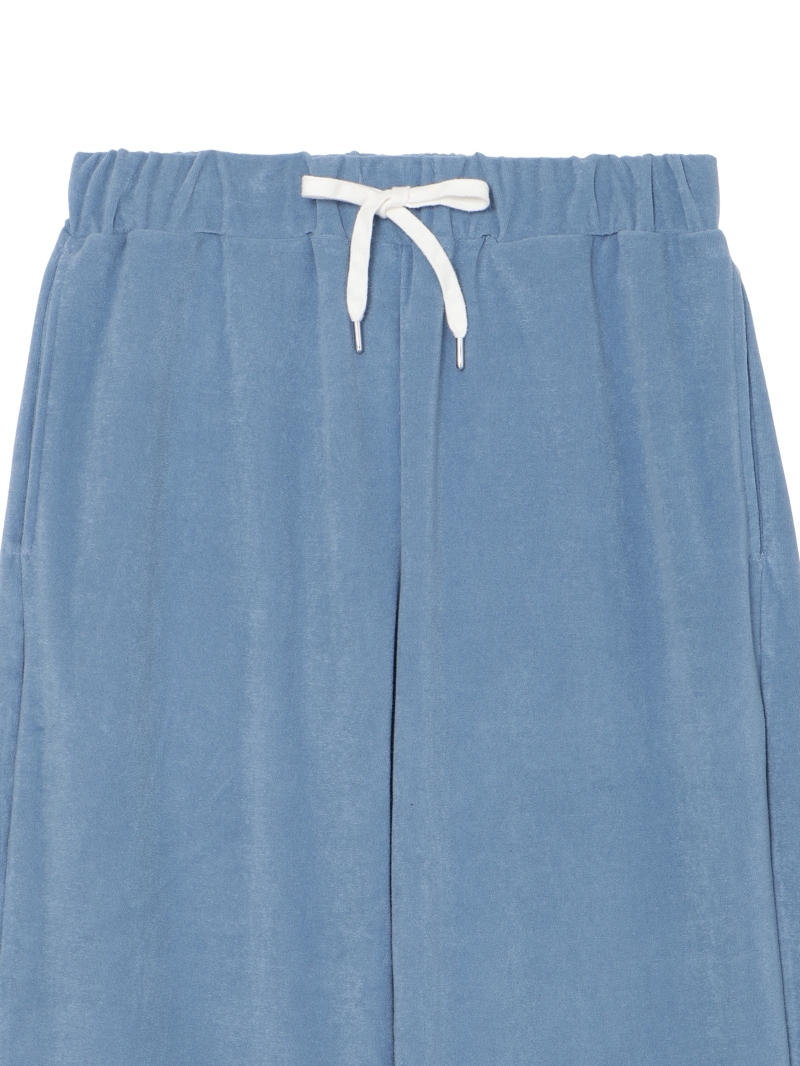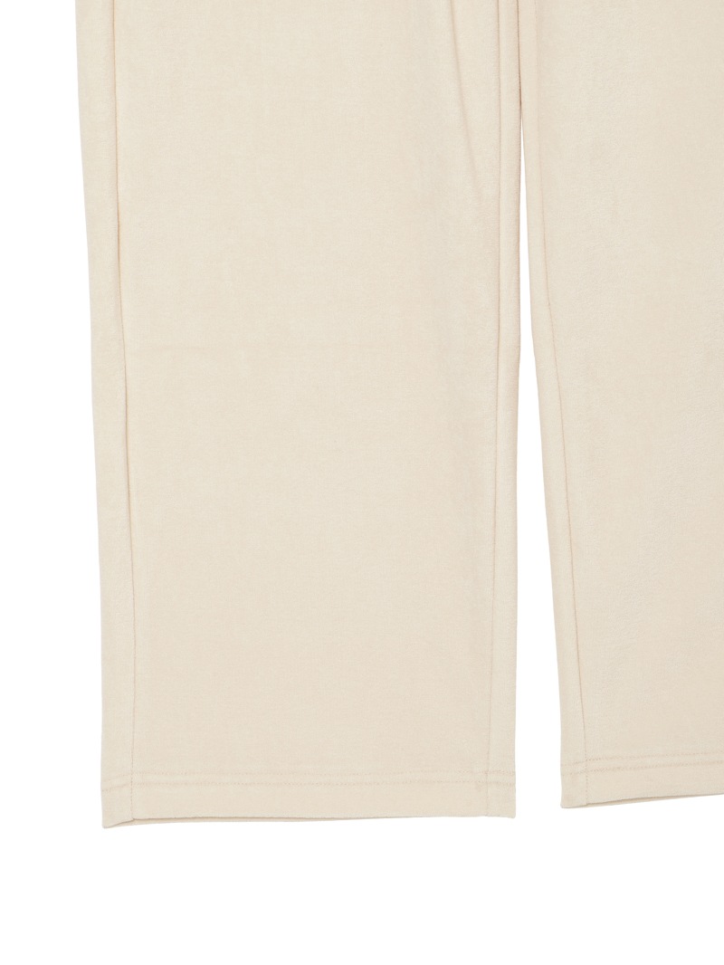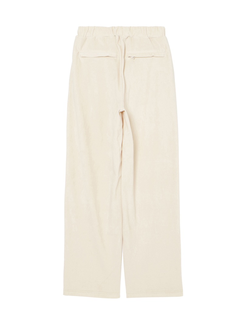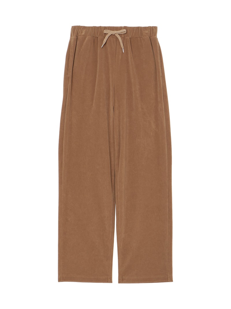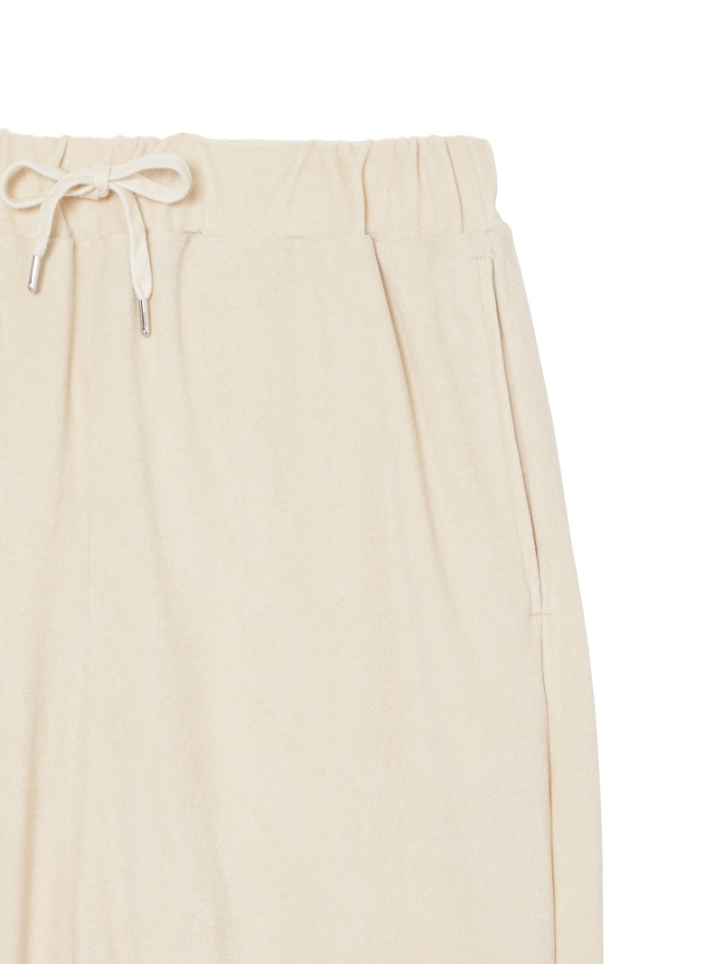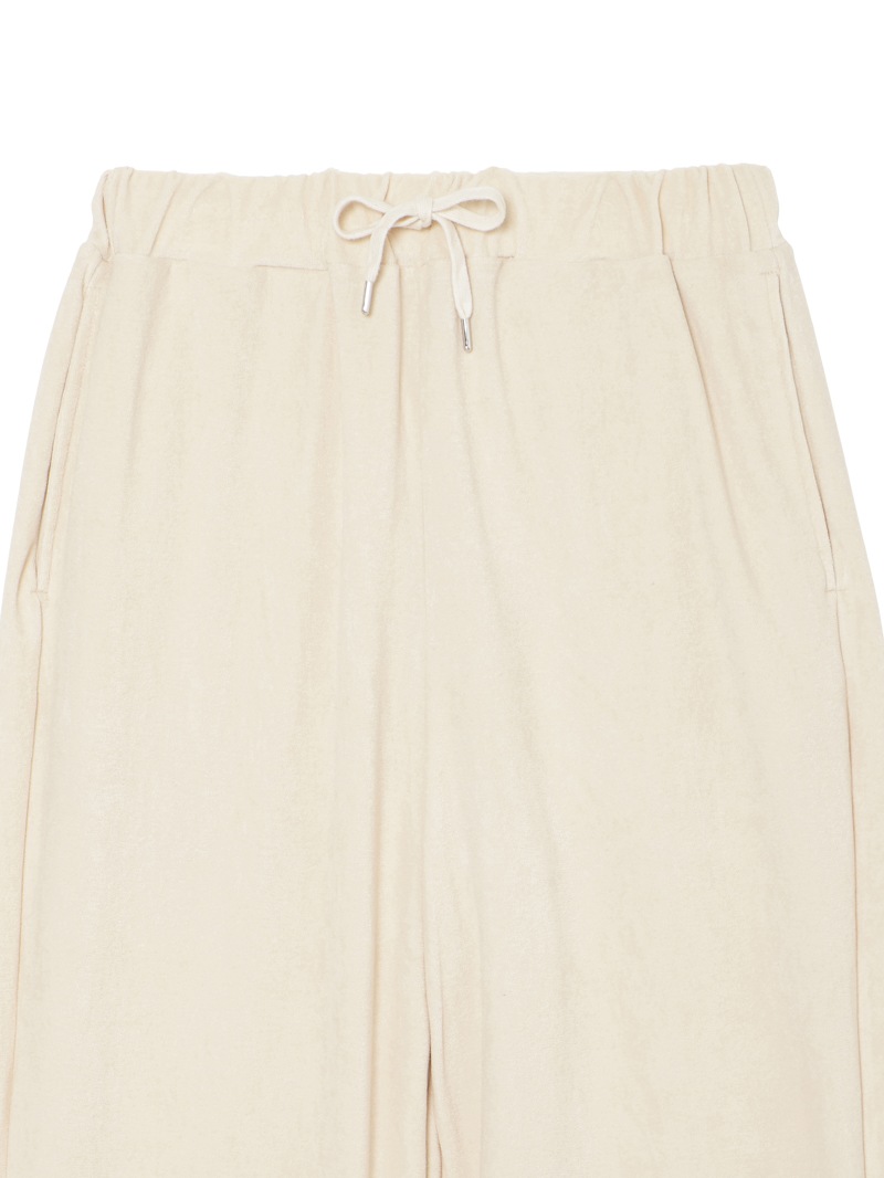 きめ細かなパイル素材を採用したパンツ。ゆとりのある身幅でリラックスムードを演出。。極上の肌触りを実現した特徴的な素材。
