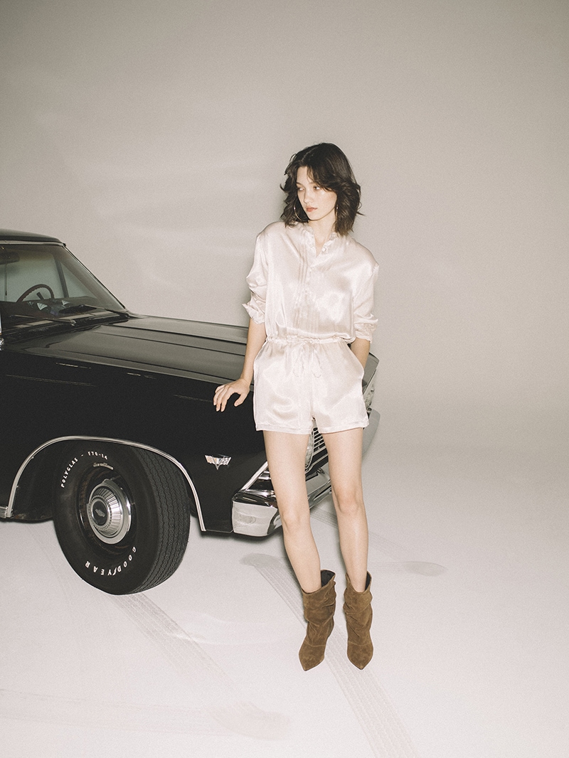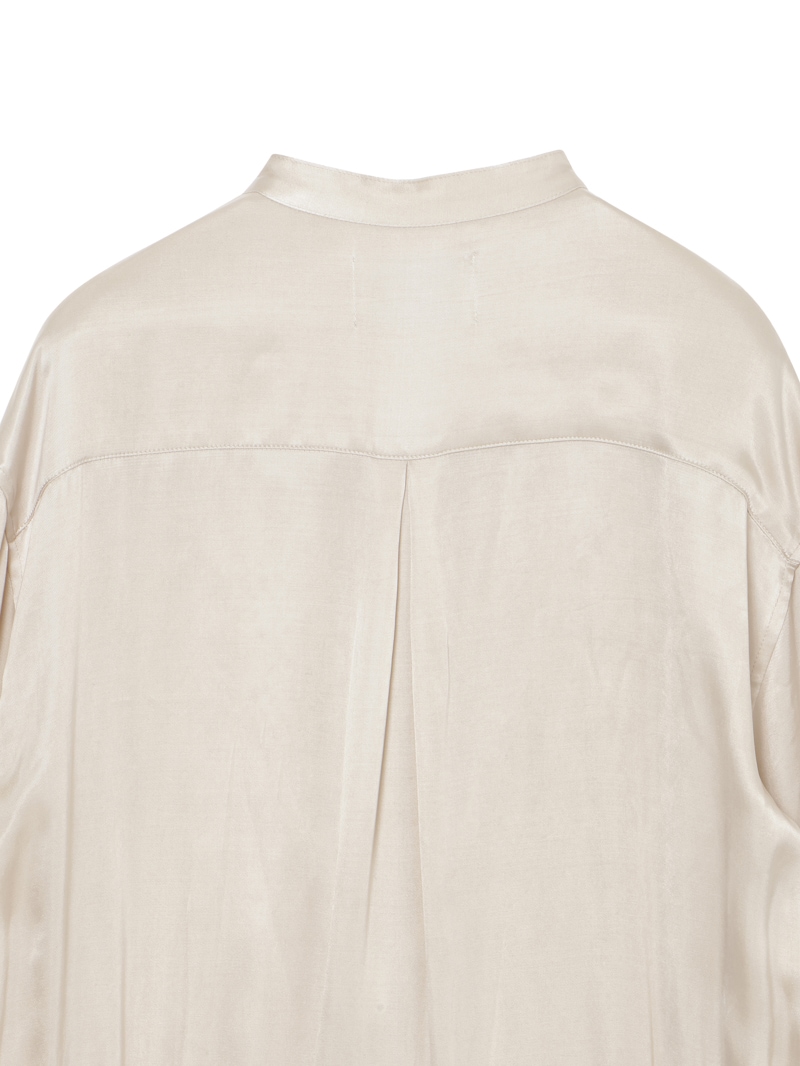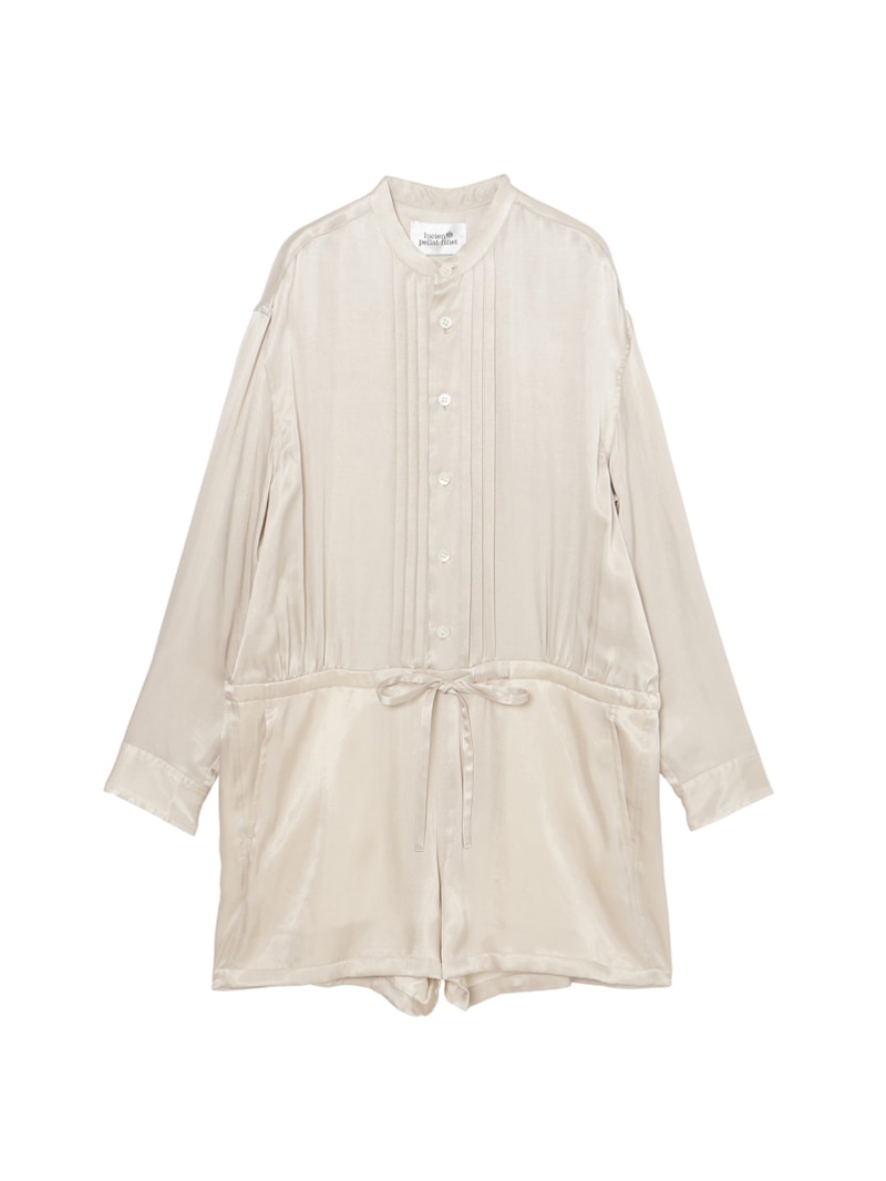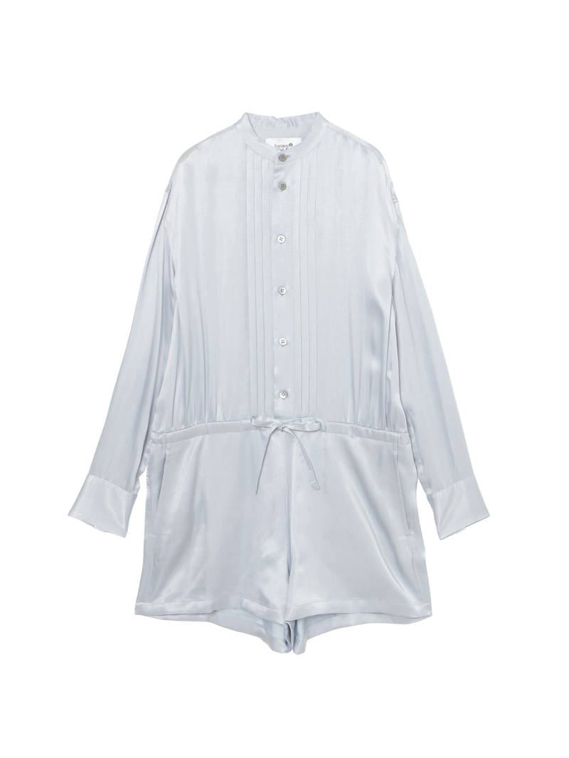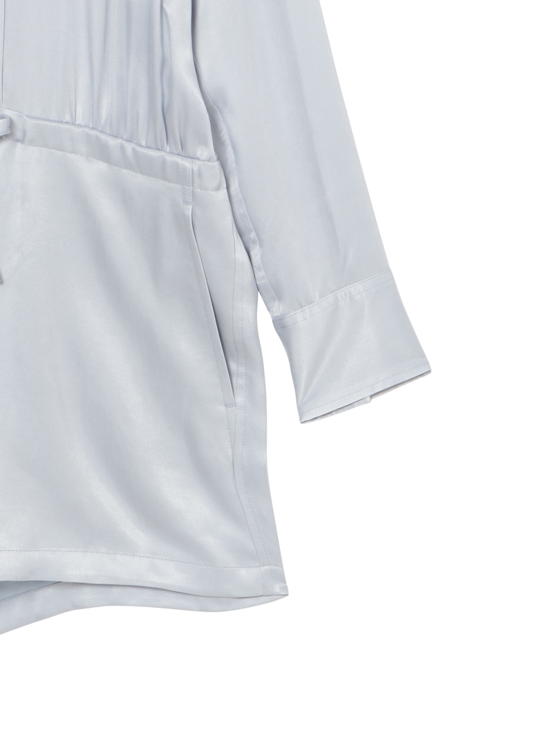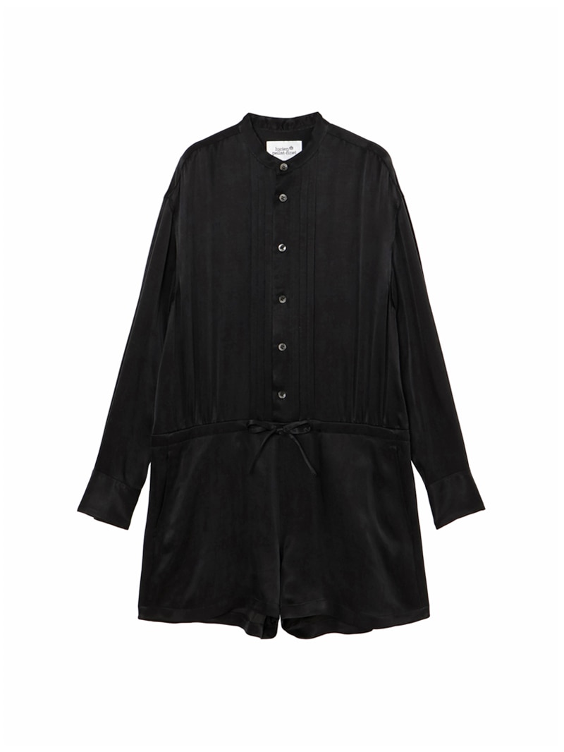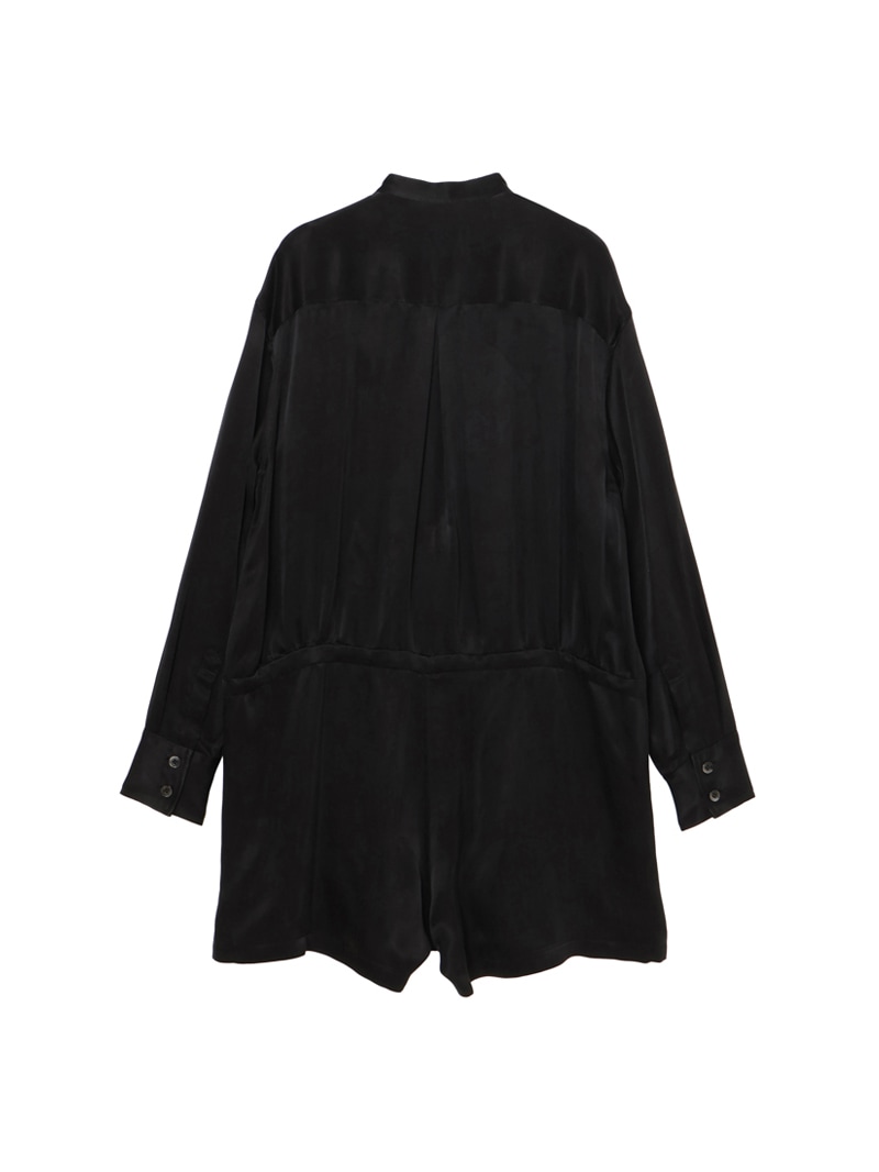 ヨコ糸に太番手のキュプラスパンを使用し、縦、横両方向に圧縮をかける特殊加工を施した素材。ドレープ感がありながらも製品にふくらみと適度な肉感を与え、独特なヴィンテージのあるジャンプスーツ。