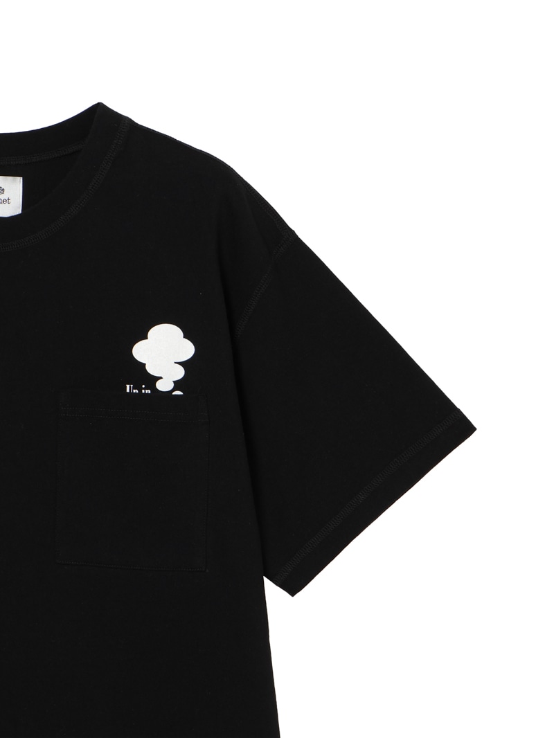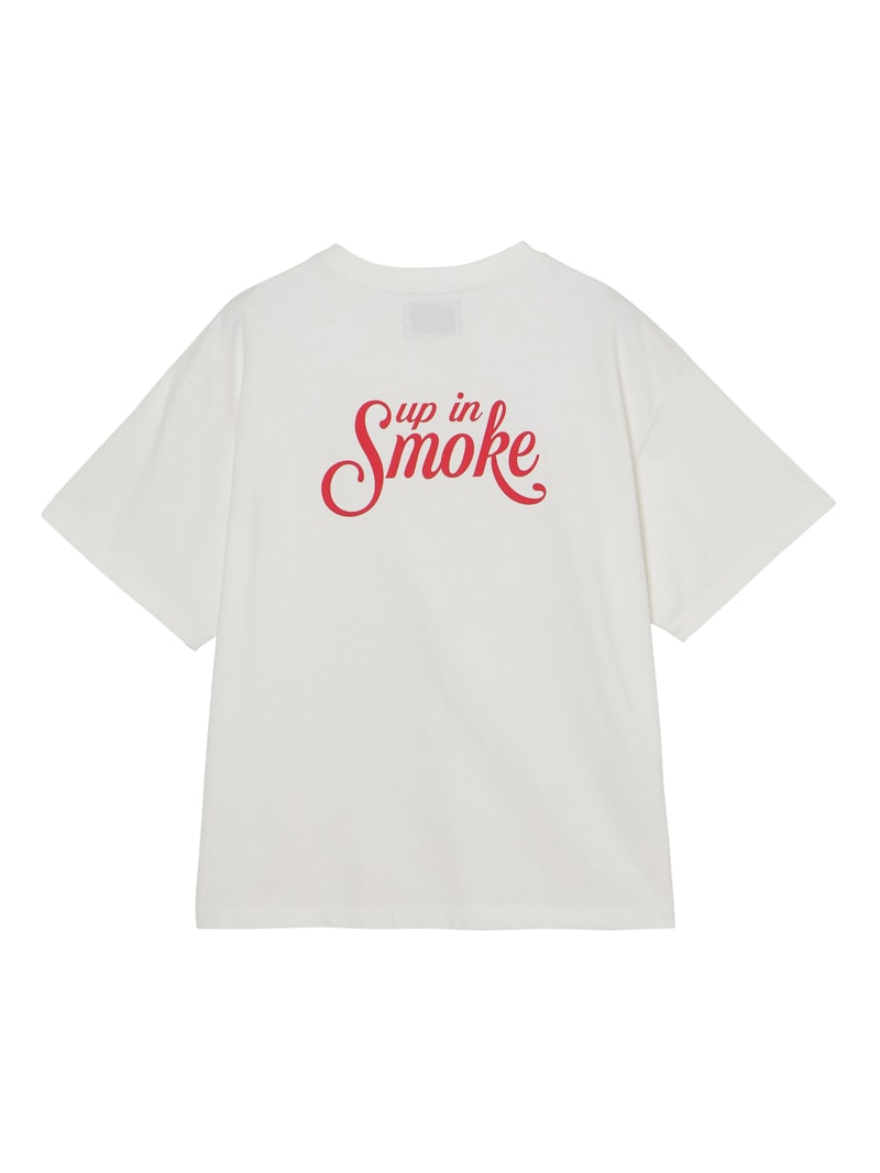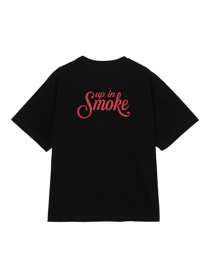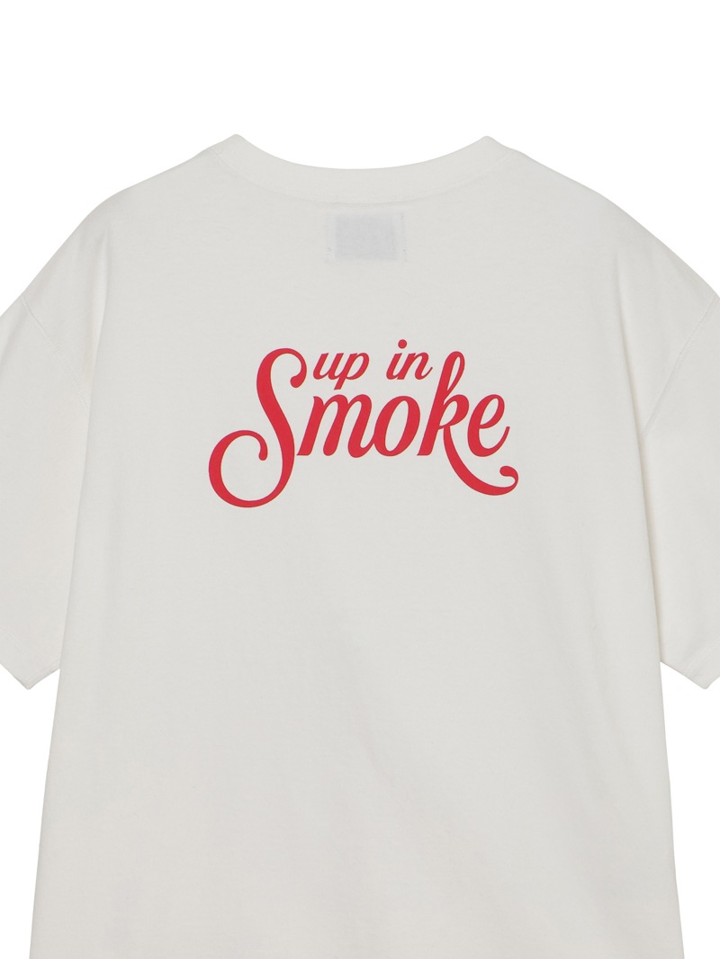 少しゆとりのある特徴的なシルエットのTシャツ。しっかり目の生地がボディを拾わずにすっきりとしたフォルムを演出。”UP IN SMOKE”のプリントを配置。