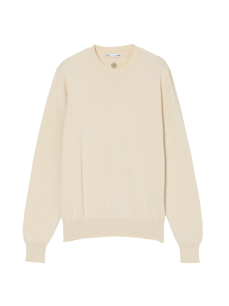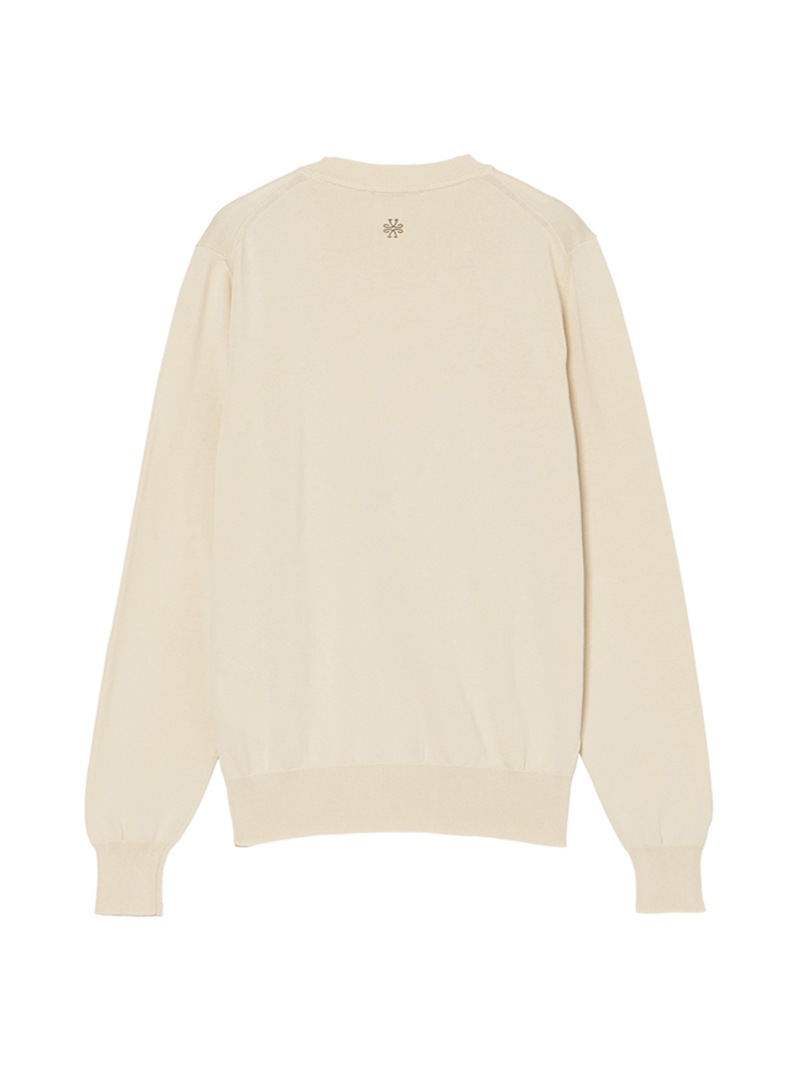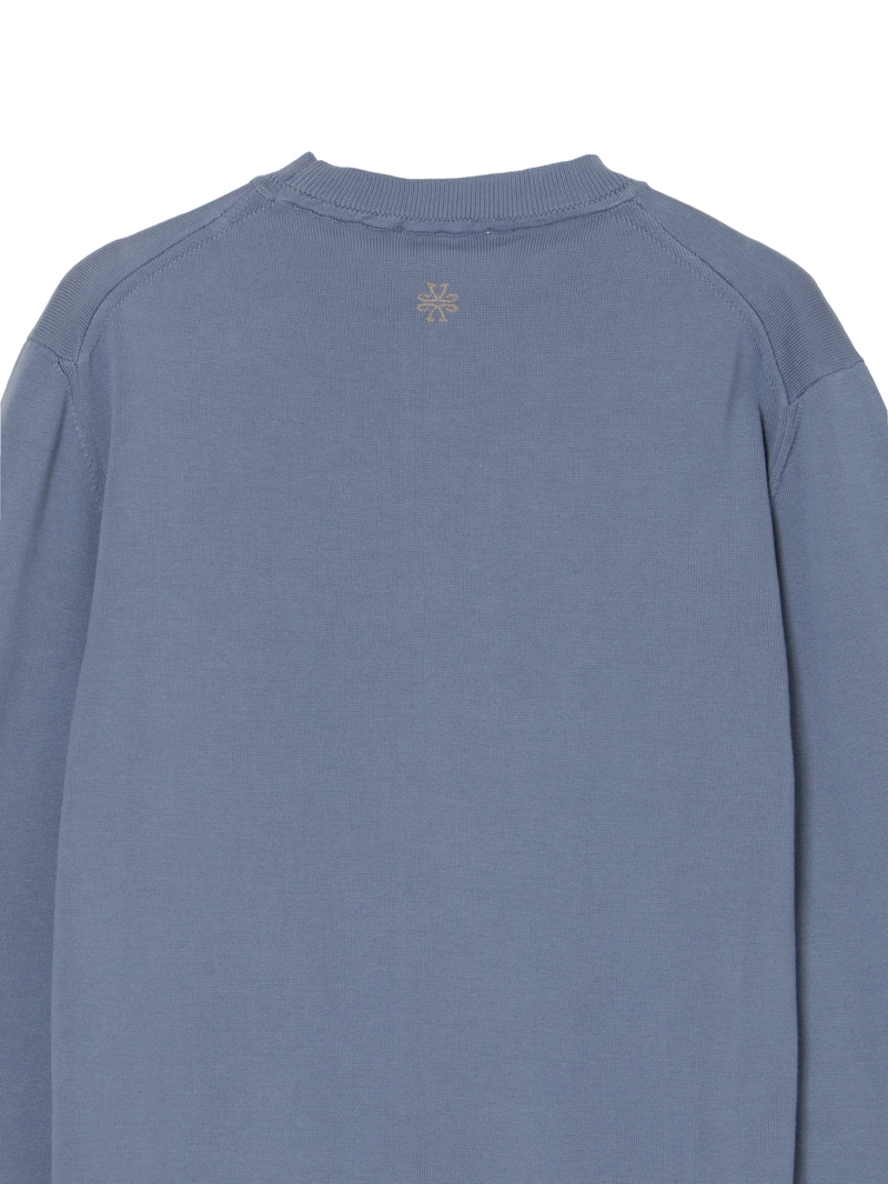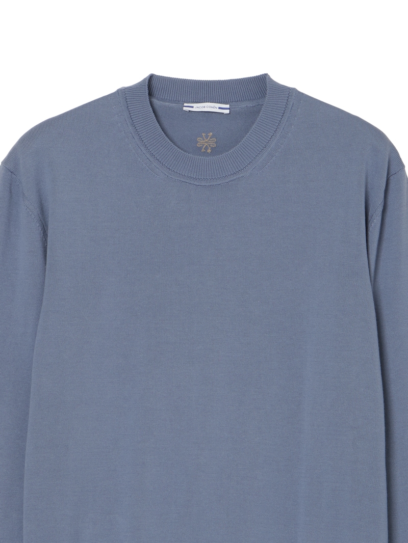 ラウンドネックのハイゲージニット。しなやかなコットンを14ゲージで編み立てたフラットな表情で、ロングシーズン活躍し、ジャケットにもシャツにも合わせやすい上品な佇まい。ミニマルなデザインながらも、後ろ襟下のモノグラム刺繍がさりげないアクセントに。
