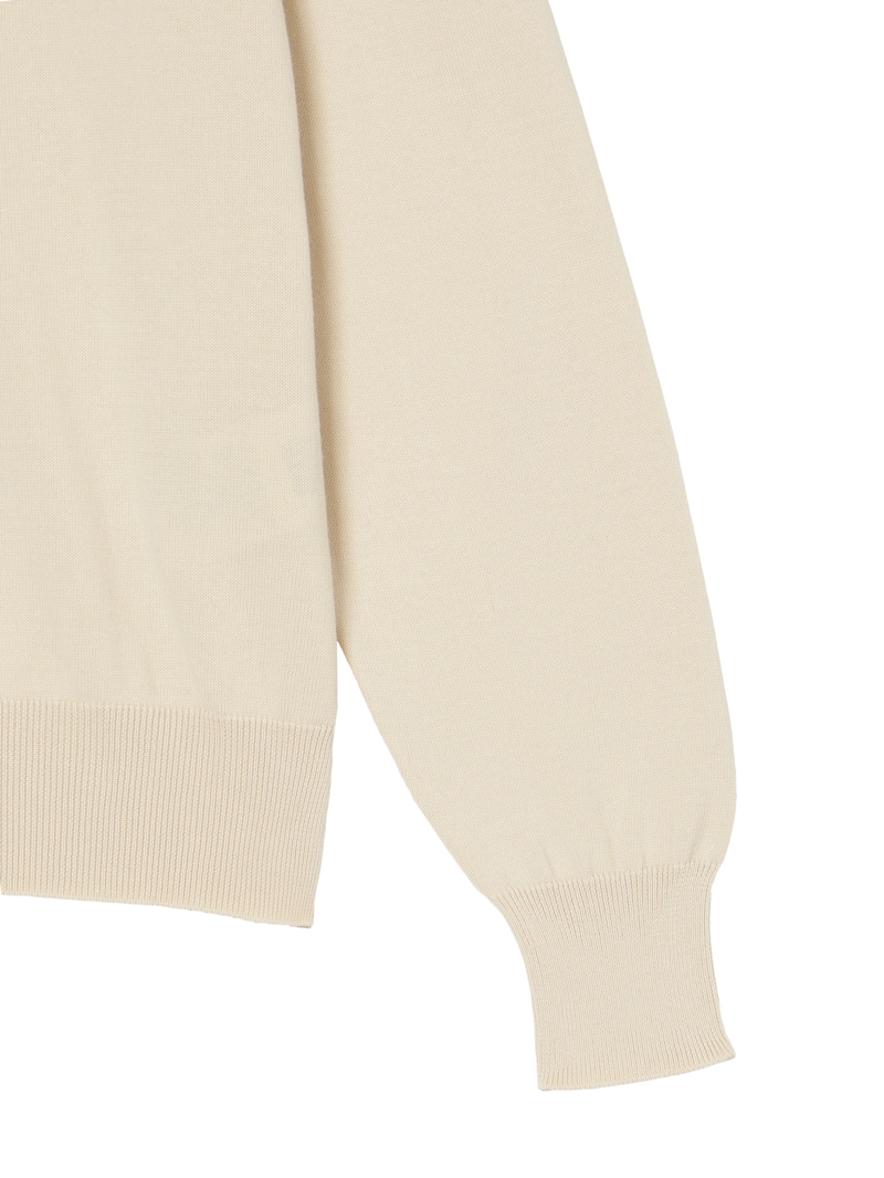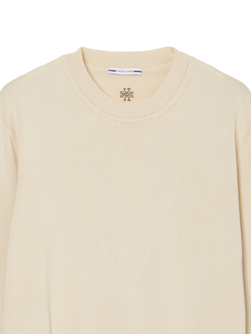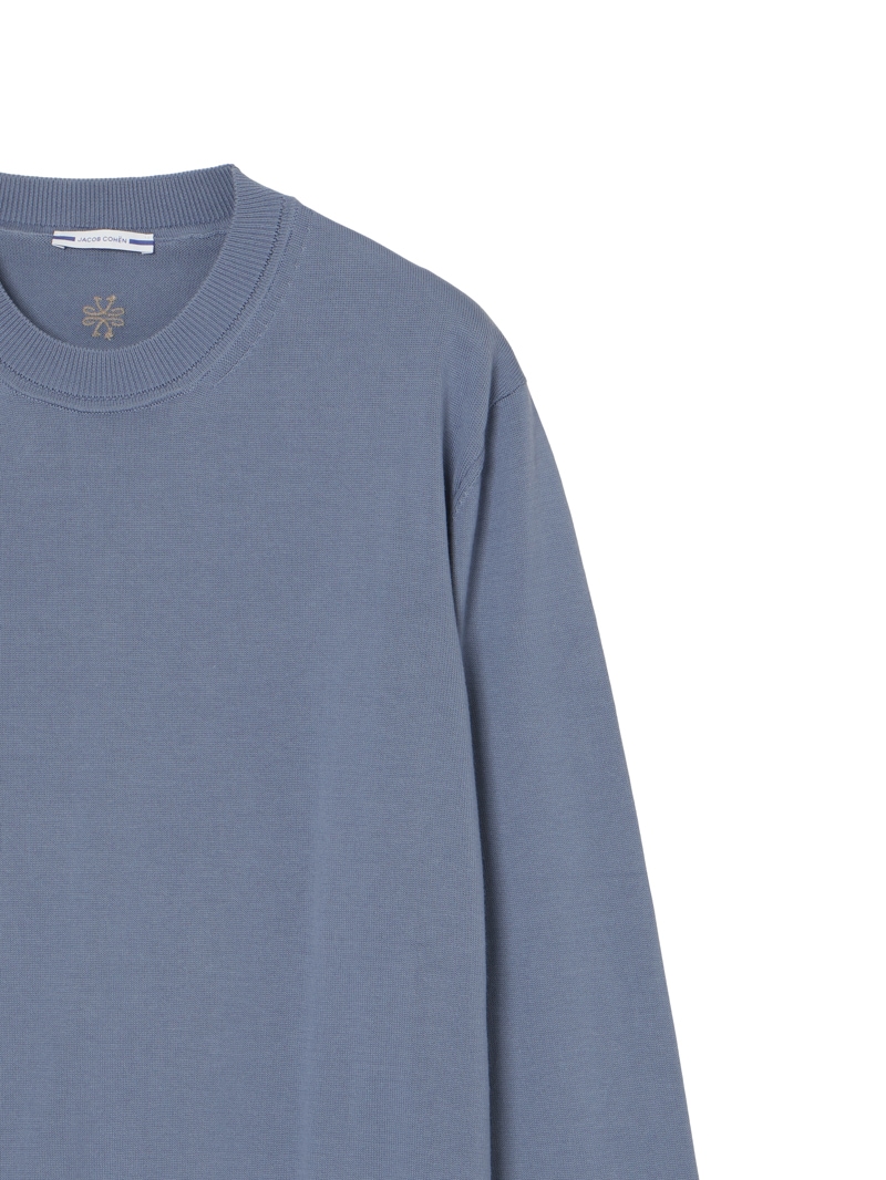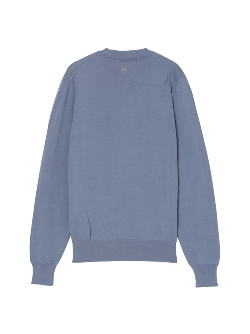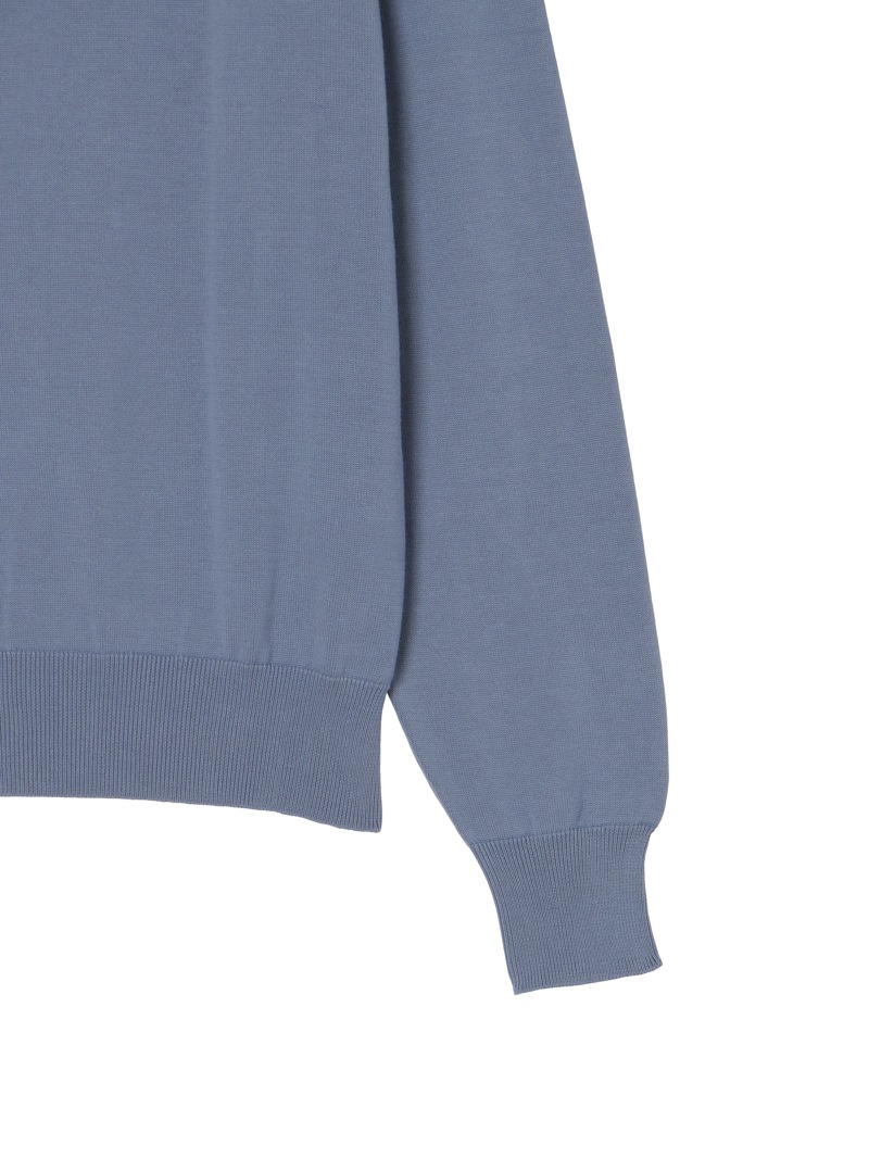 ラウンドネックのハイゲージニット。しなやかなコットンを14ゲージで編み立てたフラットな表情で、ロングシーズン活躍し、ジャケットにもシャツにも合わせやすい上品な佇まい。ミニマルなデザインながらも、後ろ襟下のモノグラム刺繍がさりげないアクセントに。