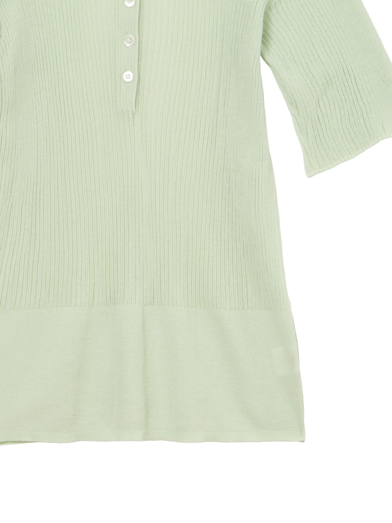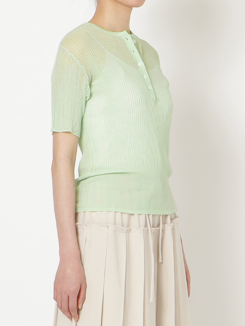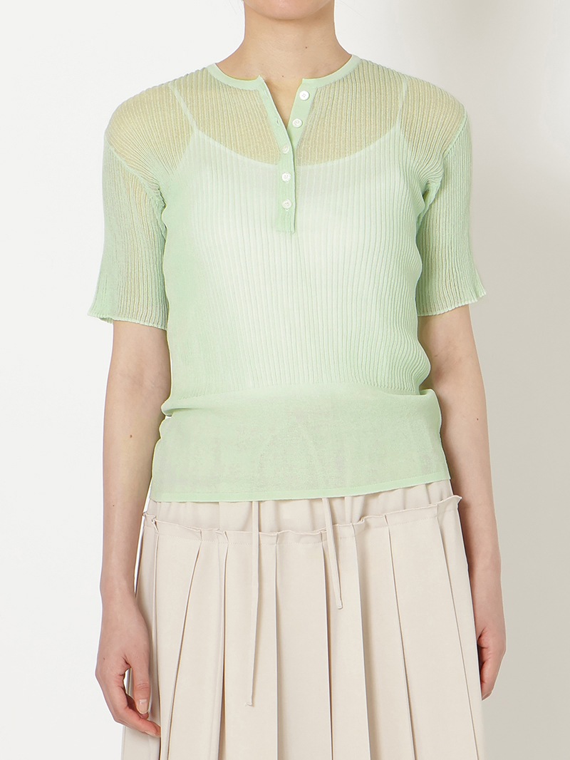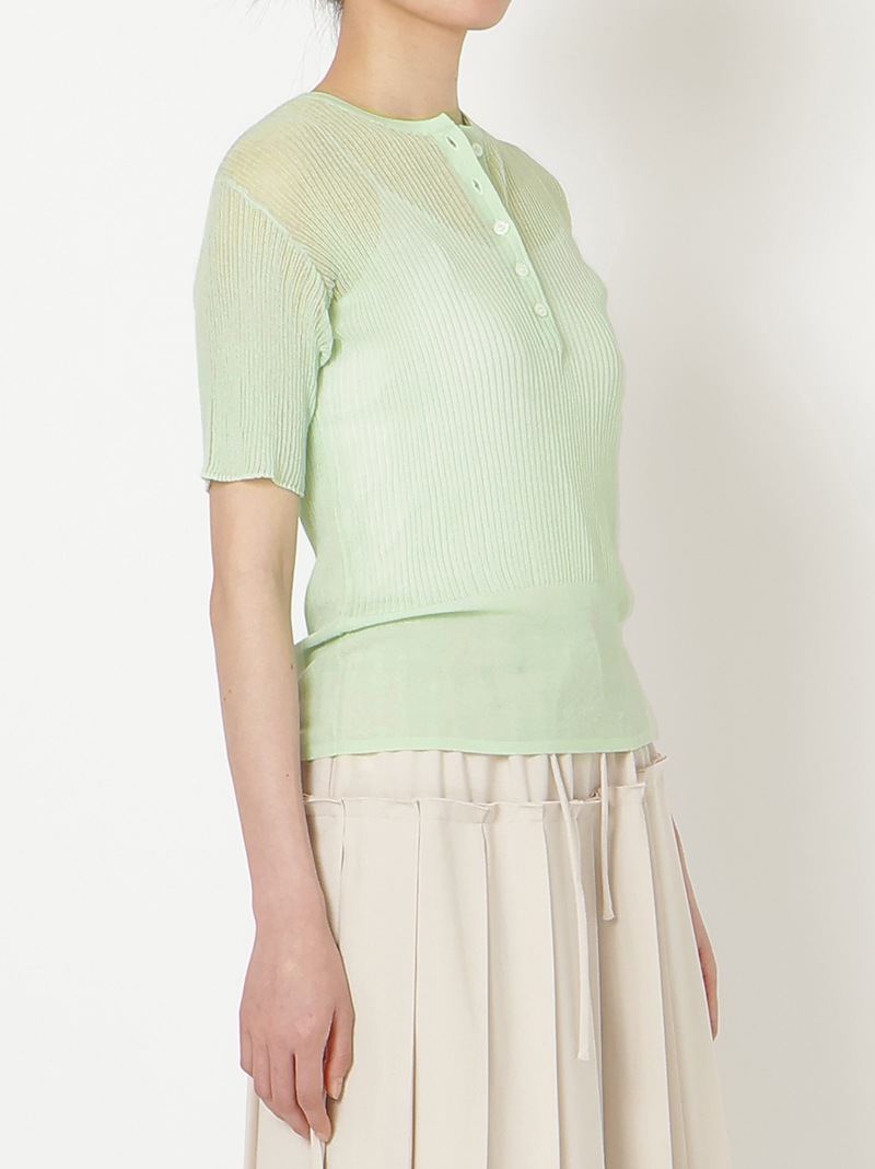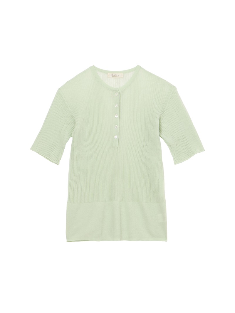 ヘンリーネックのシアーリブニット。裾に向かって別柄のリブを組み合わせることで腰まわりにほどよい余白を持たせました。シャリ感のあるコットンベースの素材は肌触りが良く、インナーとしても一枚でも活躍する一着です。