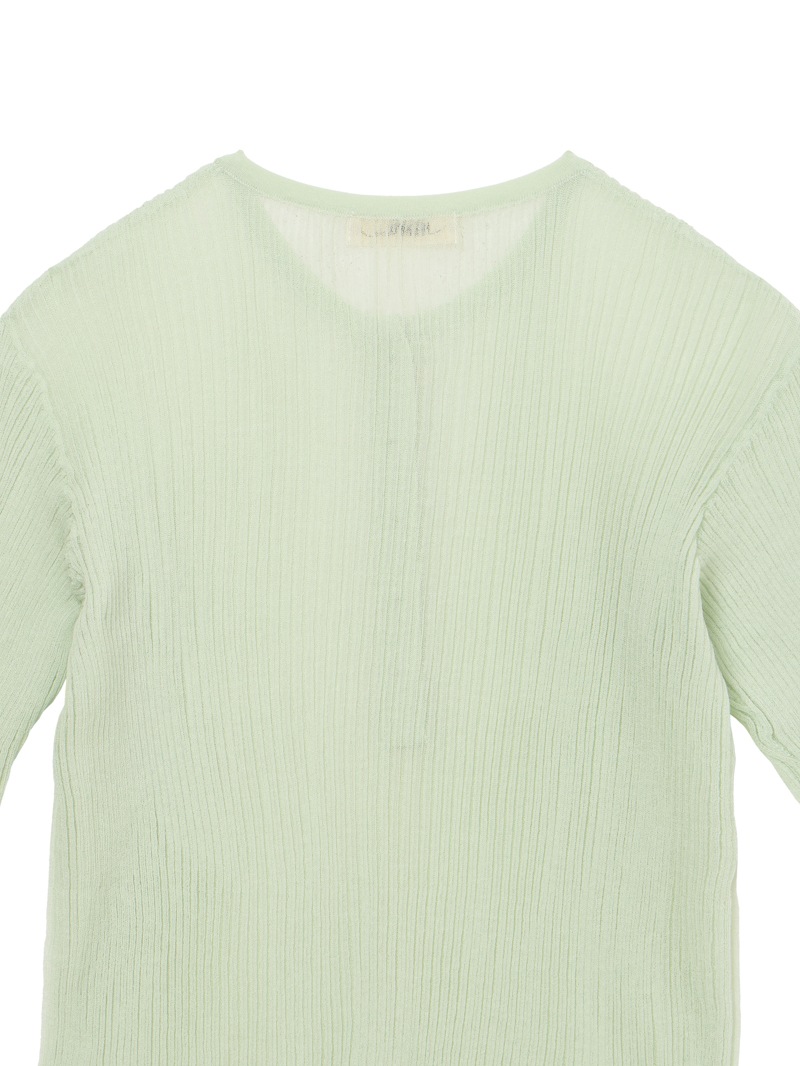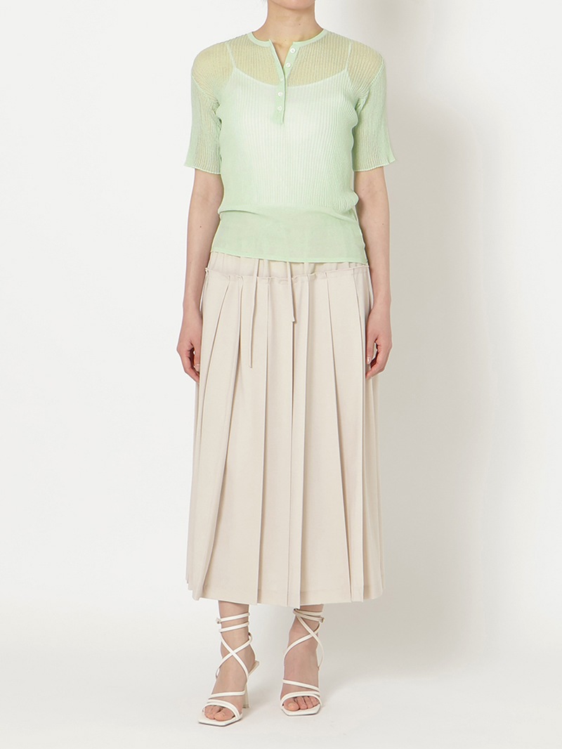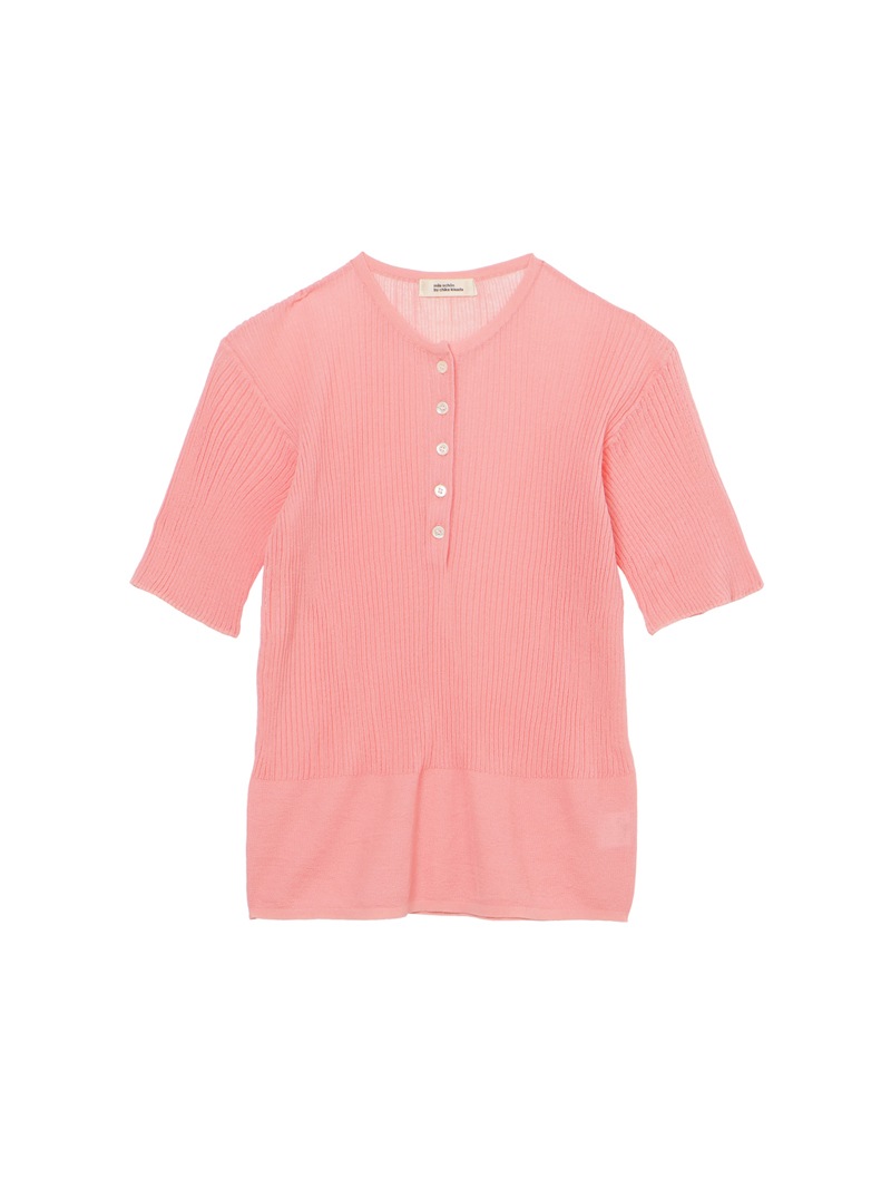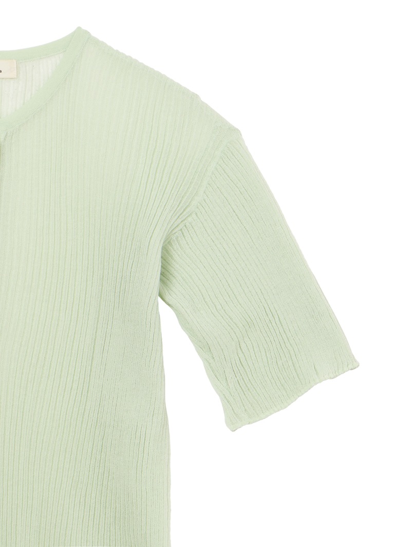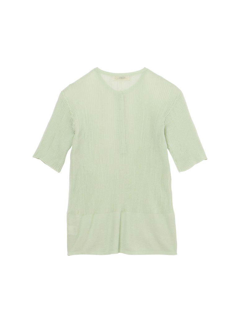 ヘンリーネックのシアーリブニット。裾に向かって別柄のリブを組み合わせることで腰まわりにほどよい余白を持たせました。シャリ感のあるコットンベースの素材は肌触りが良く、インナーとしても一枚でも活躍する一着です。