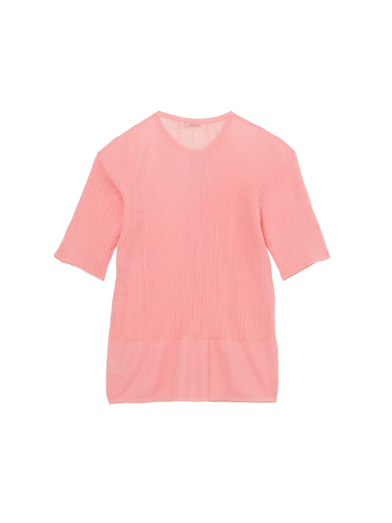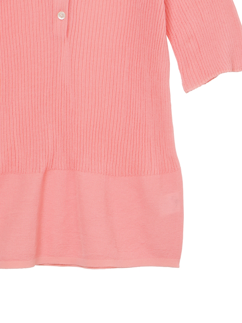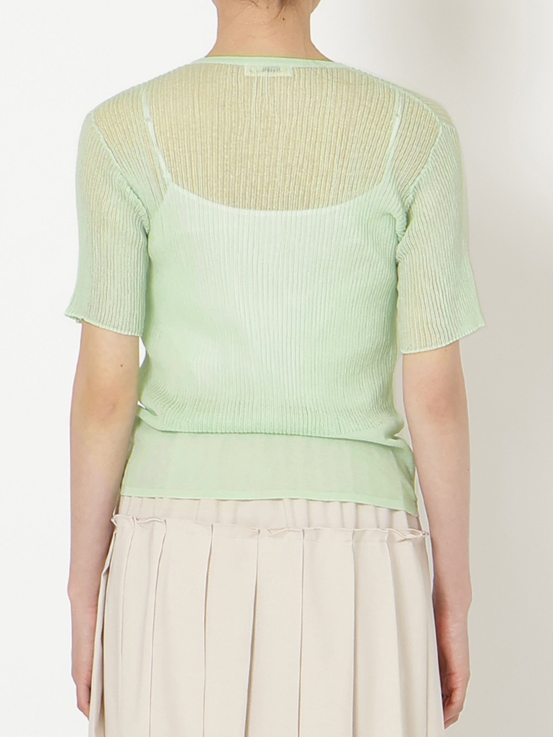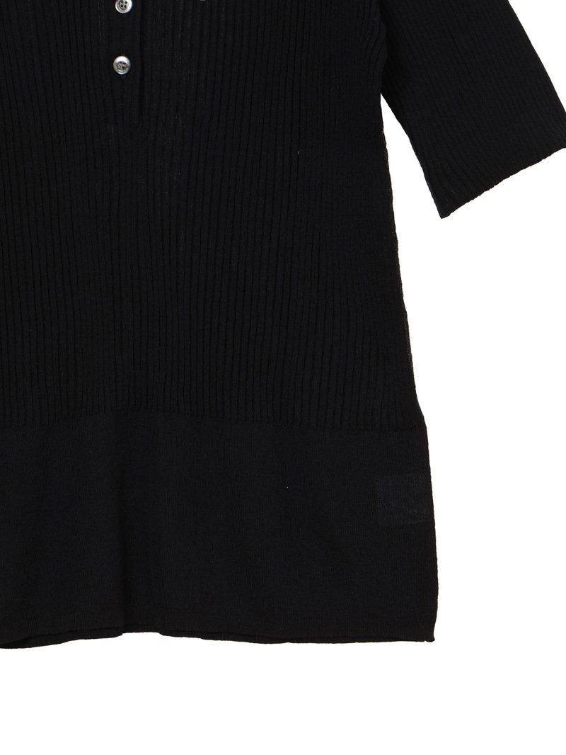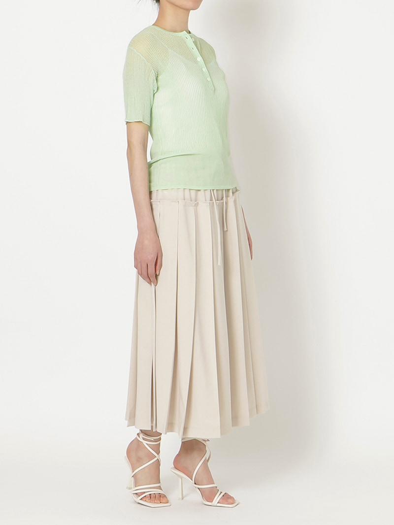 ヘンリーネックのシアーリブニット。裾に向かって別柄のリブを組み合わせることで腰まわりにほどよい余白を持たせました。シャリ感のあるコットンベースの素材は肌触りが良く、インナーとしても一枚でも活躍する一着です。