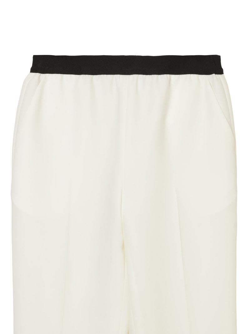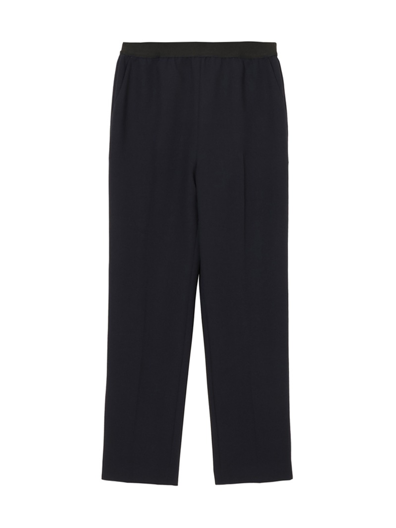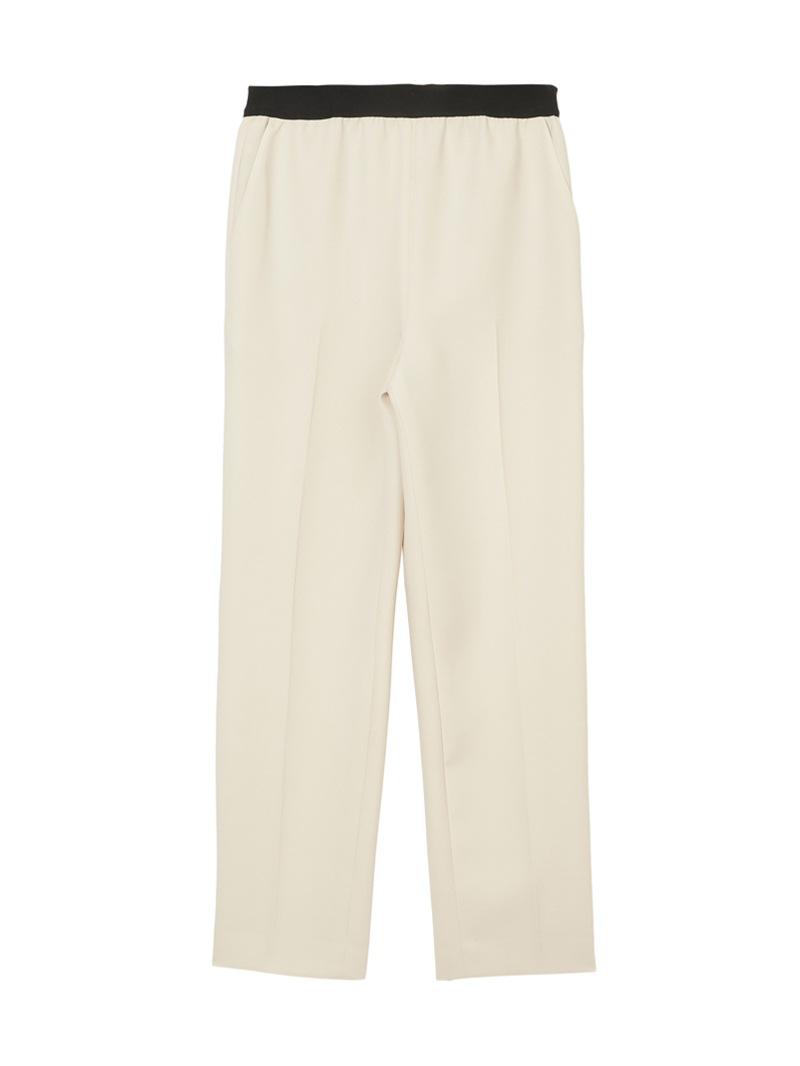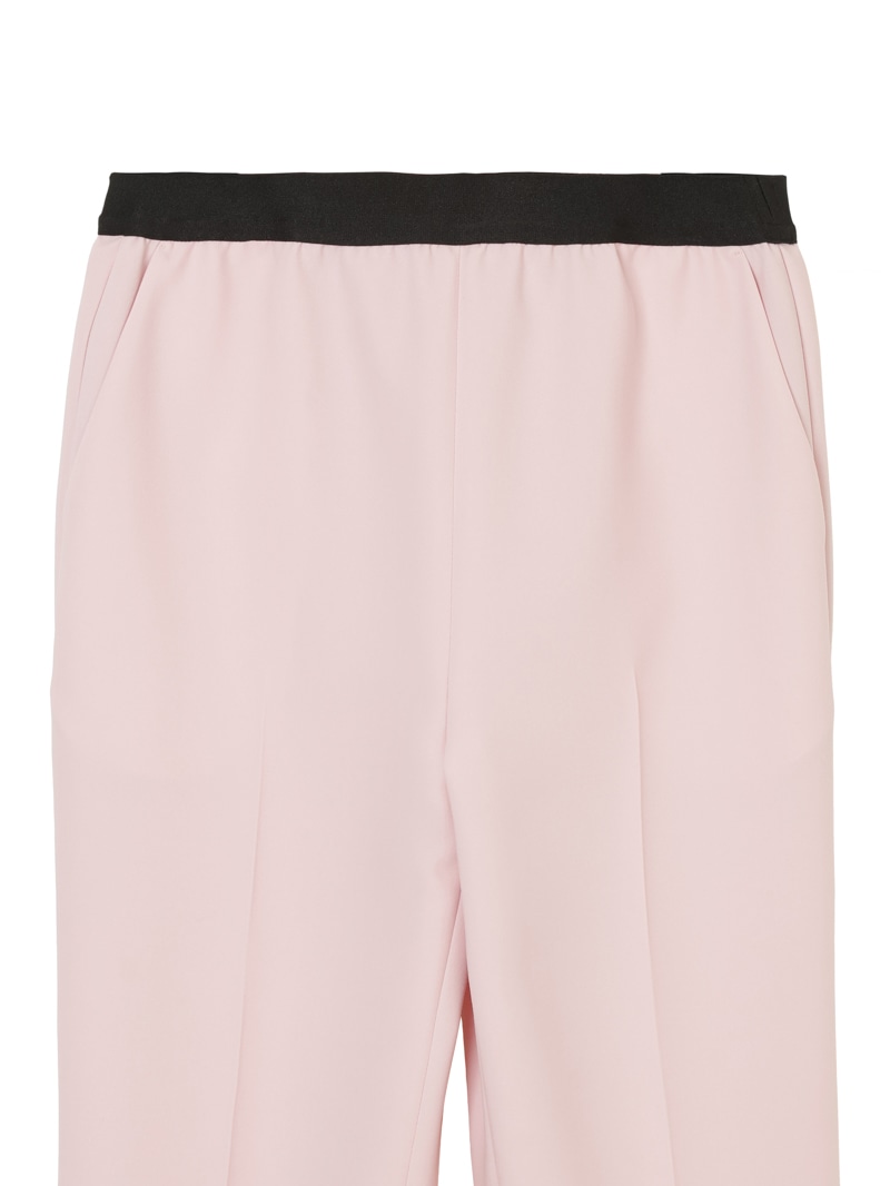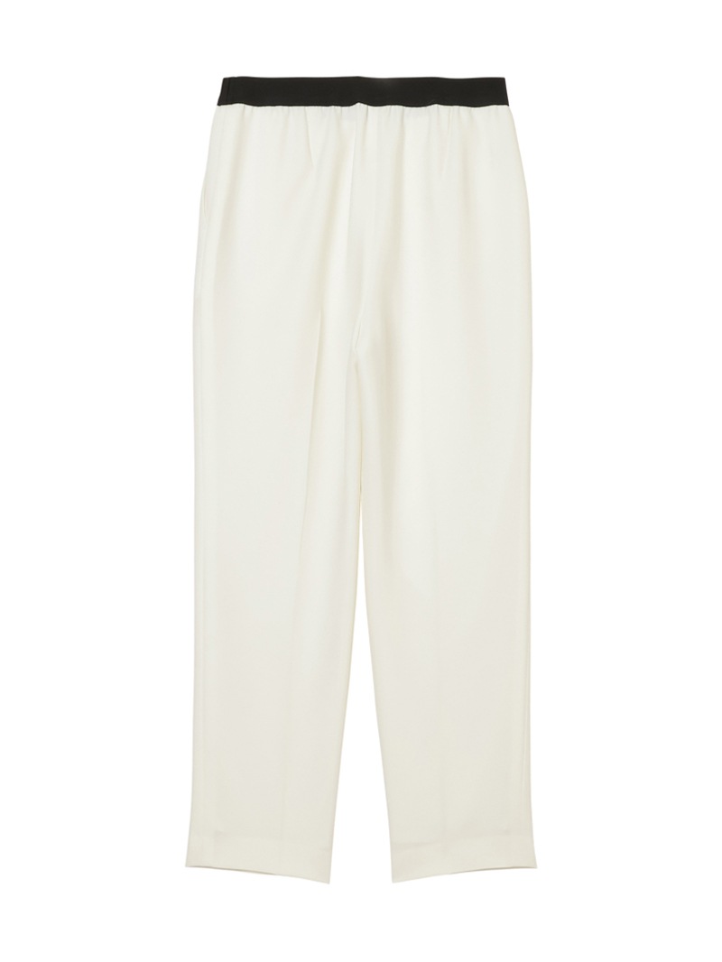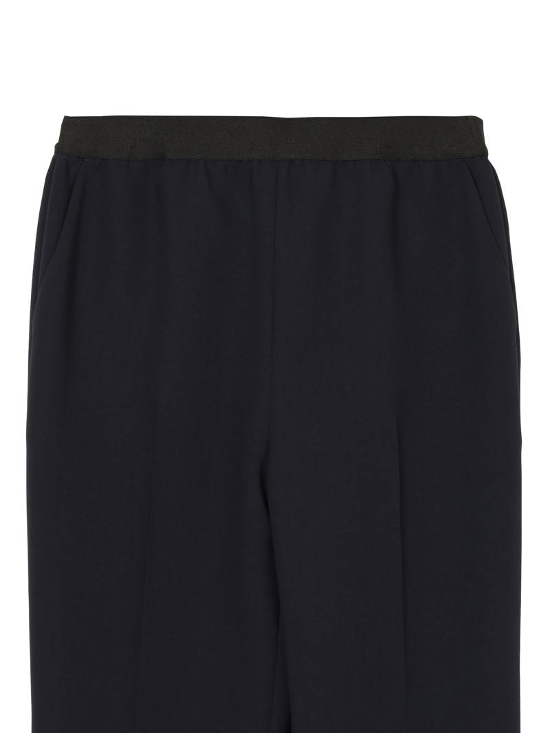 仕立て映えする上質な生地感と、美しいシルエットが特徴のミラ・ショーン定番パンツ。梳毛のような風合いを表現したポリエステル糸を使い、二枚の生地を重ねて織り上げた素材を使用しています。