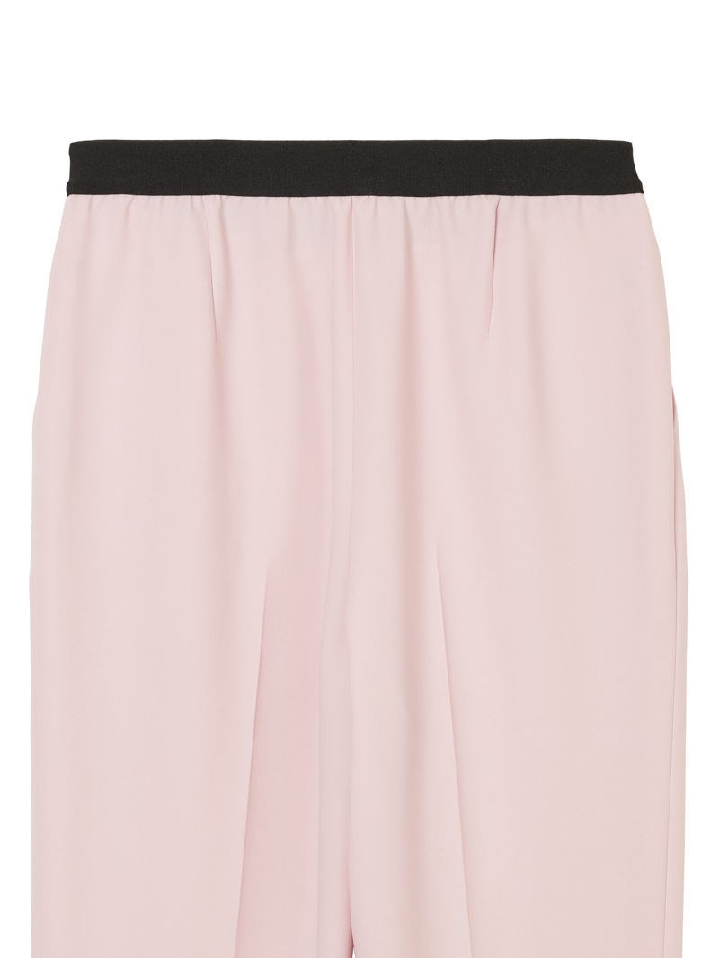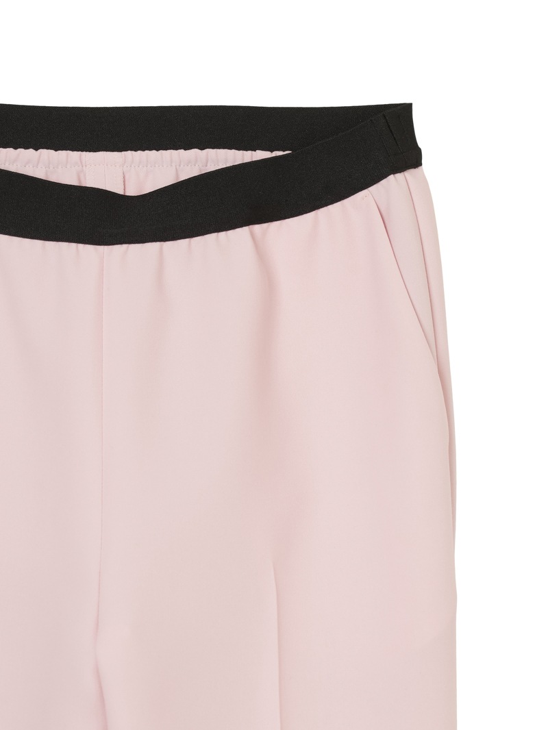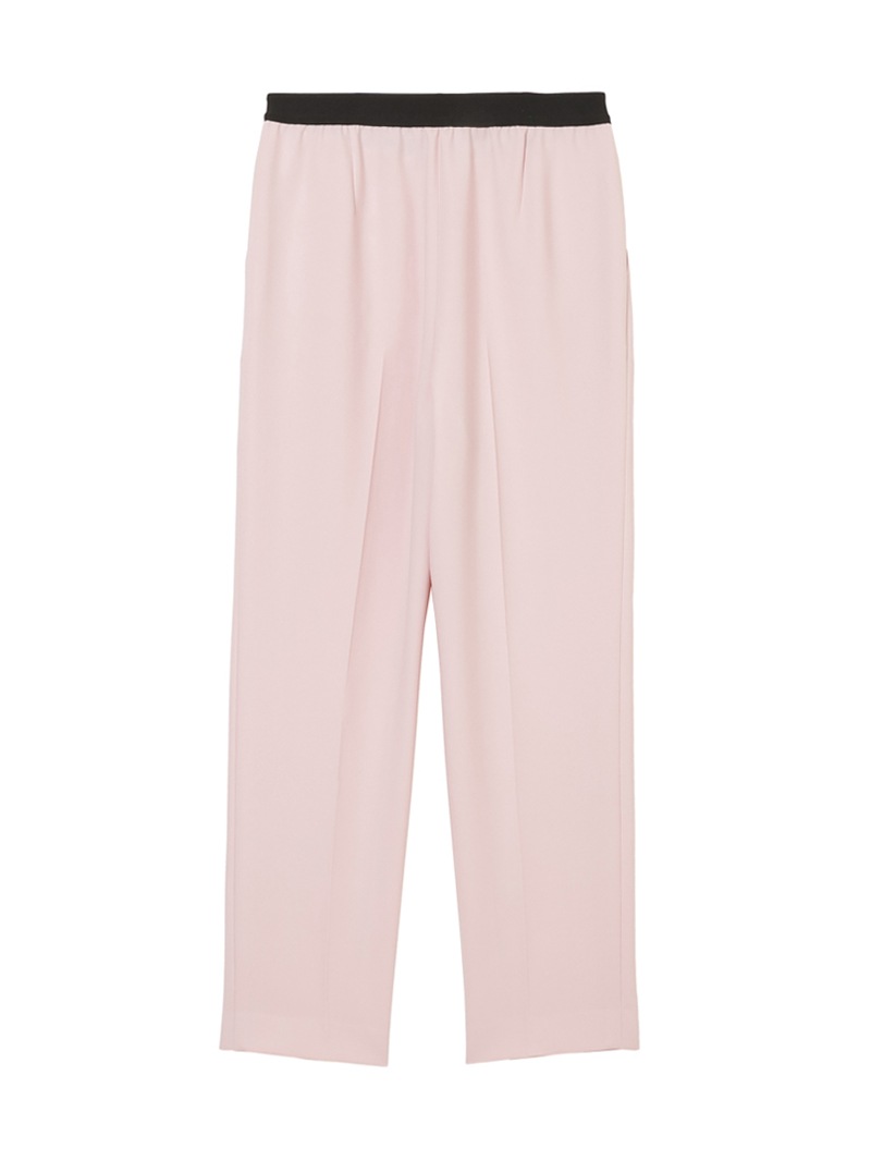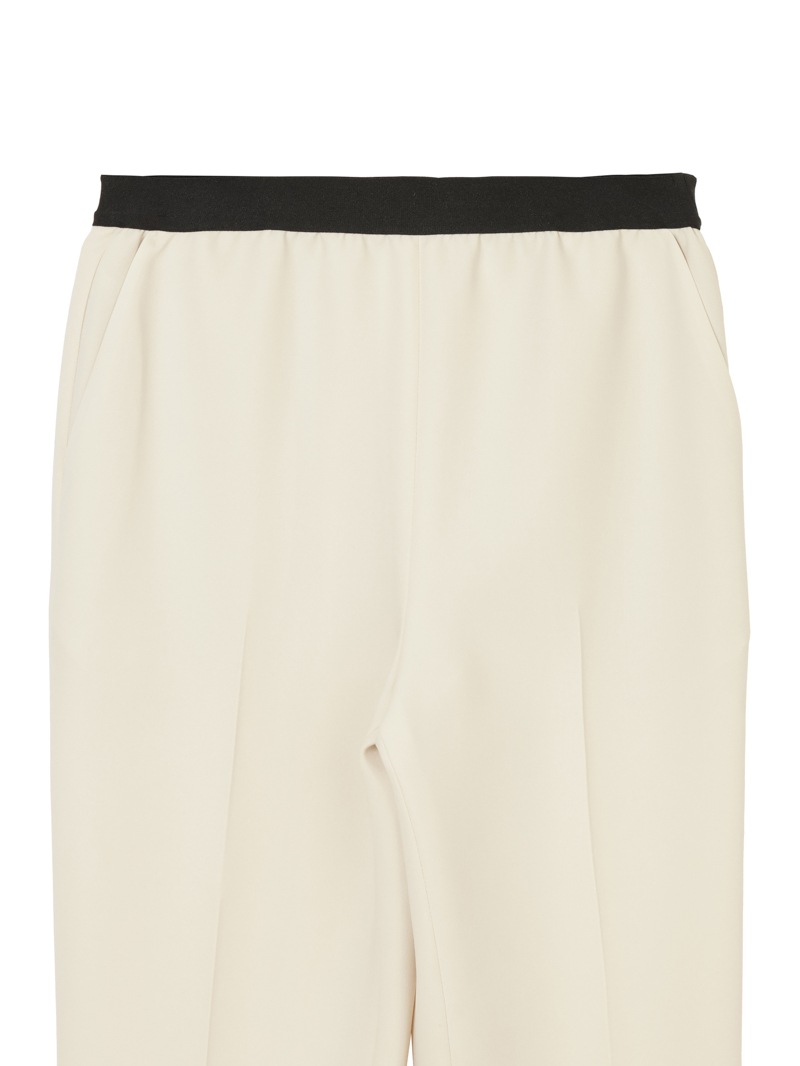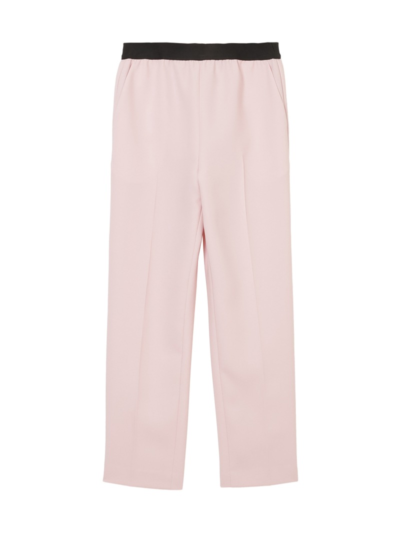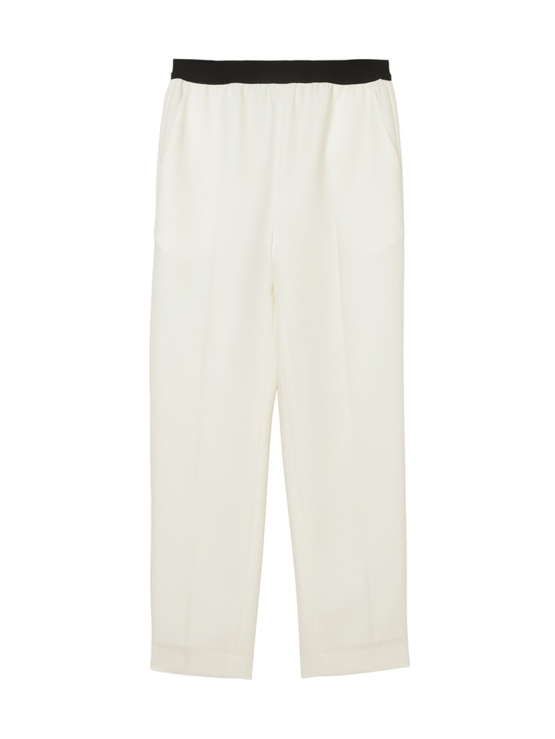 仕立て映えする上質な生地感と、美しいシルエットが特徴のミラ・ショーン定番パンツ。梳毛のような風合いを表現したポリエステル糸を使い、二枚の生地を重ねて織り上げた素材を使用しています。