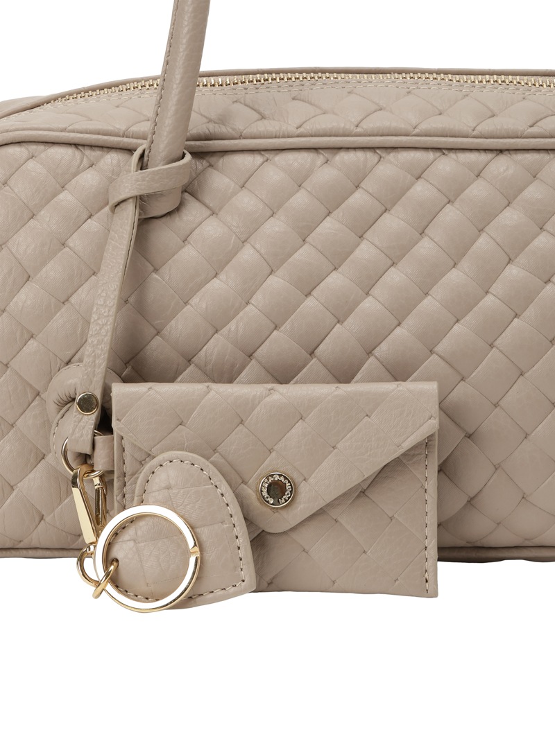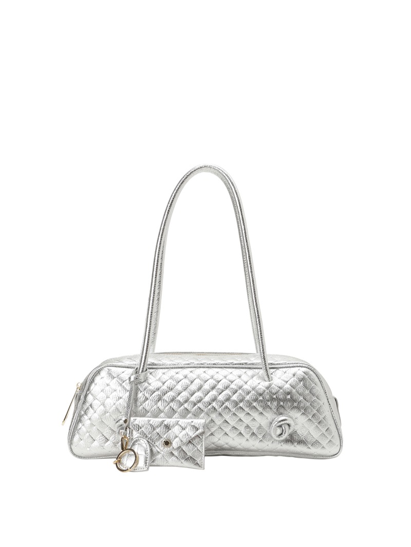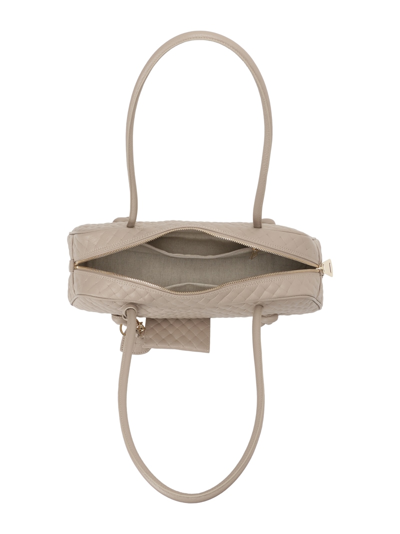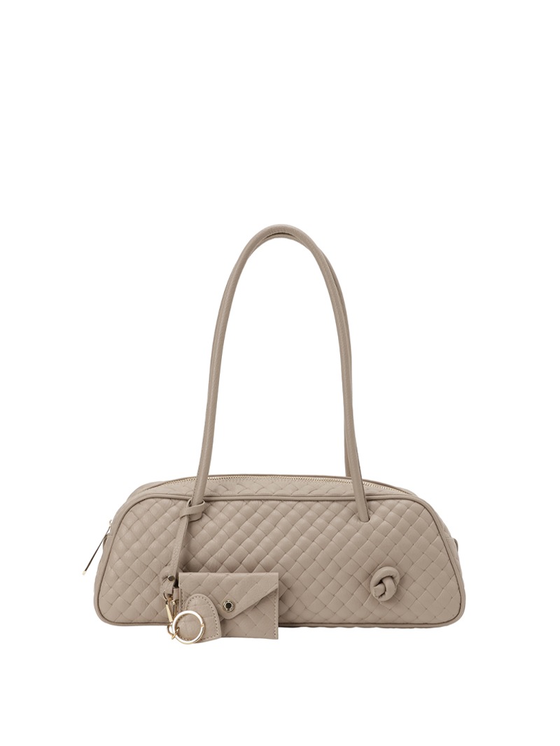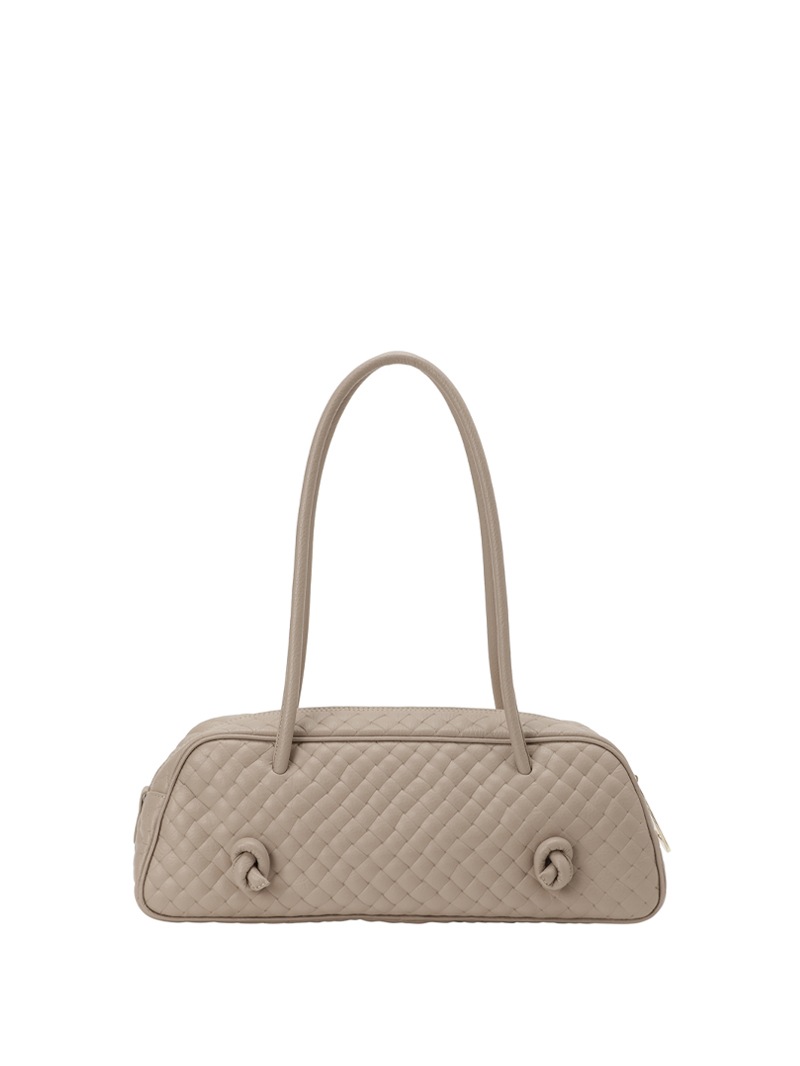 柔らかなカーフスキンに織り模様を施した、イントレチャート風エンボスレザーバッグ。ミニマルなデザインで快適かつ実用性に長け、肩掛けに最適です。長めのダブルハンドルは結び目によって長さを調節できます。カードホルダーチャーム付き。