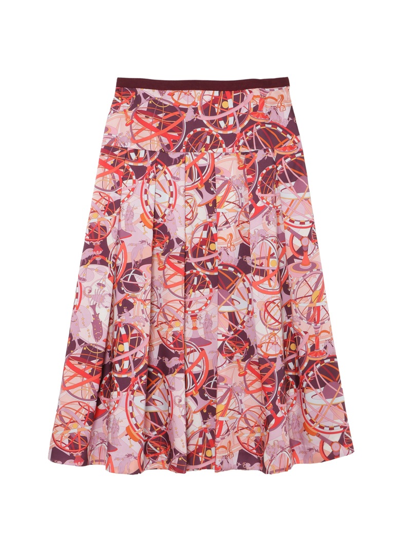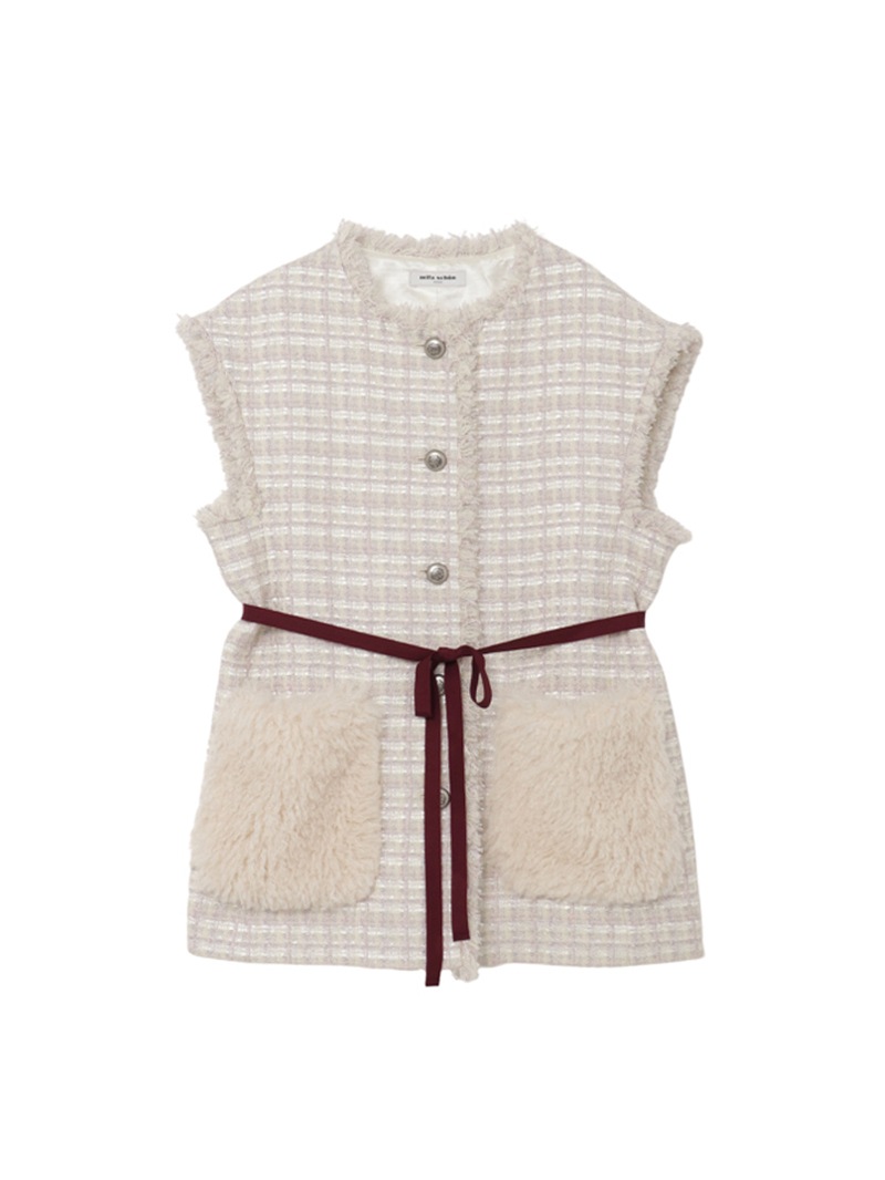 レイヤードスタイルが映えるツイードジレのスタイリング。抜け感のあるボックスシルエットのツイードジレはフリンジ使いやファーポケットで愛らしい仕上がりに。ホロスコーププリントのスカートと合わせて艶やかなイメージを演出しました。